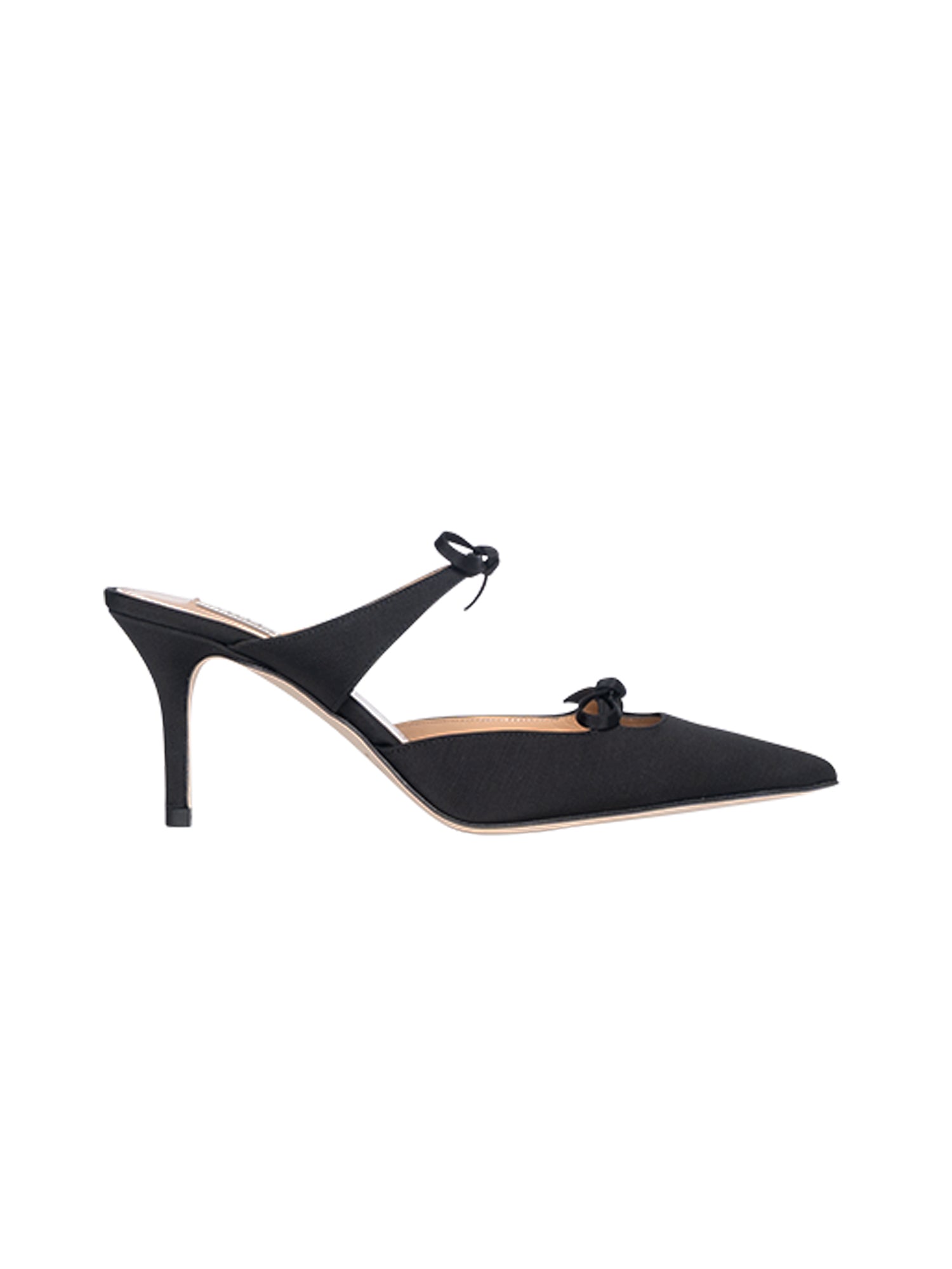 The Asti 75 mule embodies Italian craftsmanship with a grosgrain upper detailing 2 delicate bows. Set on 75mm heels with a leather lining, these pointed-toe mules ensure timeless elegance and comfort.