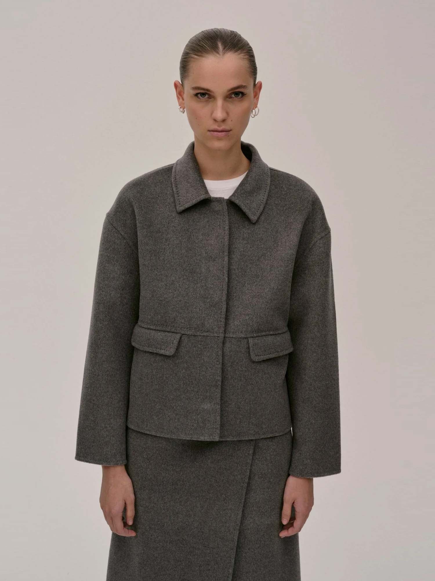 The Kurt Lux Coat is a jacket featuring a zipper closure, a round neck with a collar, a cutline at the front, and two flap pockets at the front.