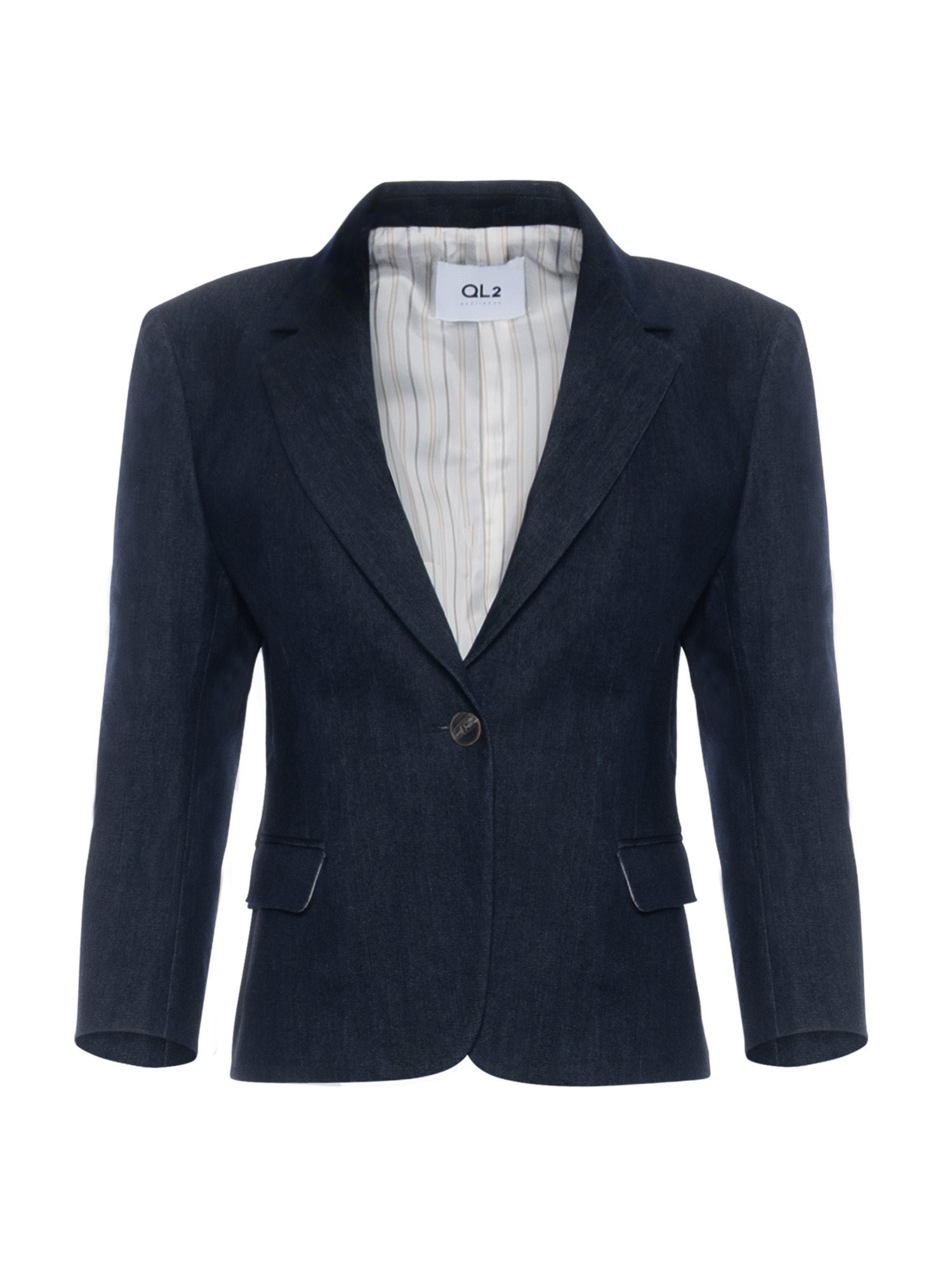 Single-Breasted Jacket, hip-length style with two pockets and a tortoise-shell style button closure.