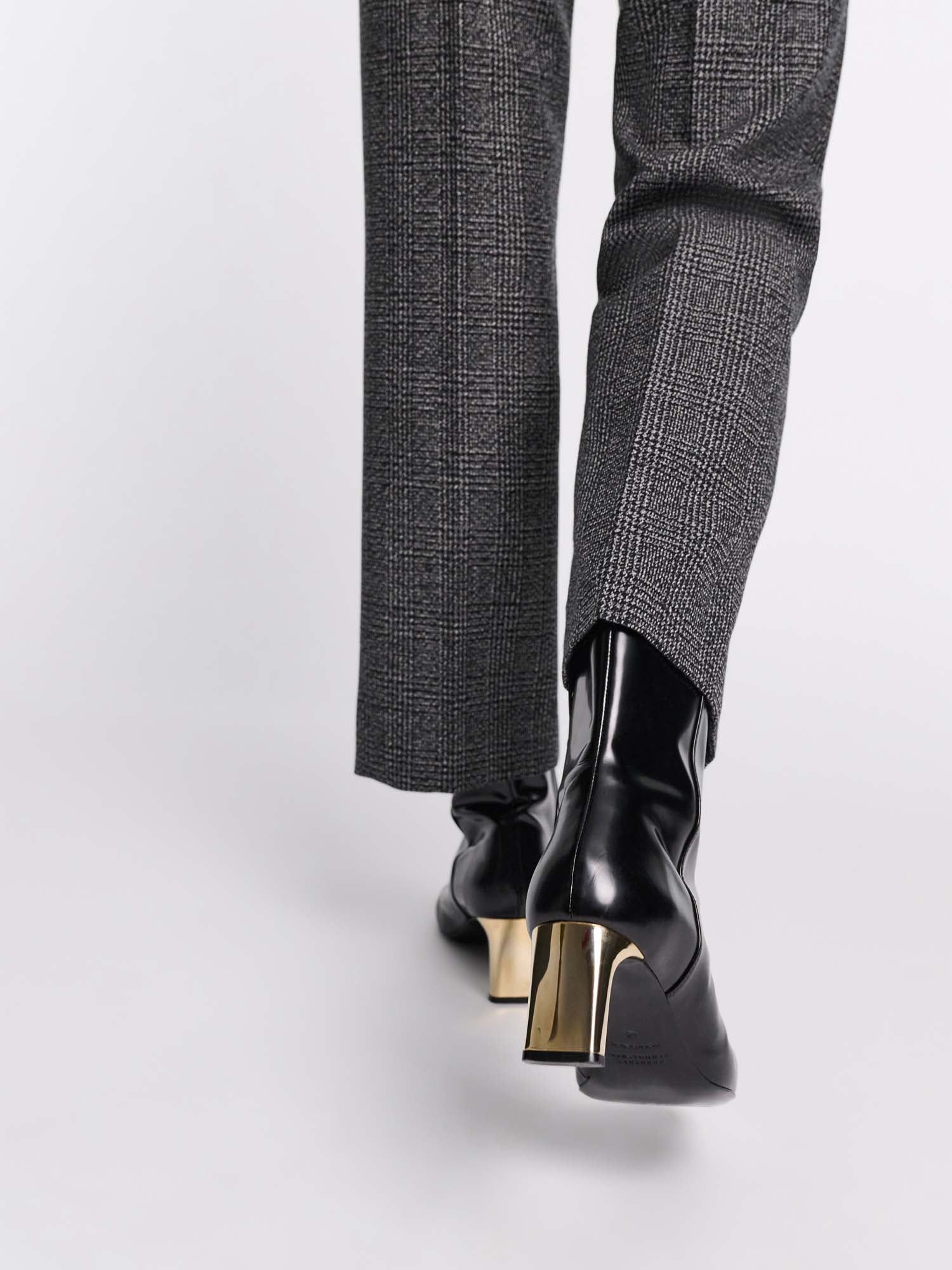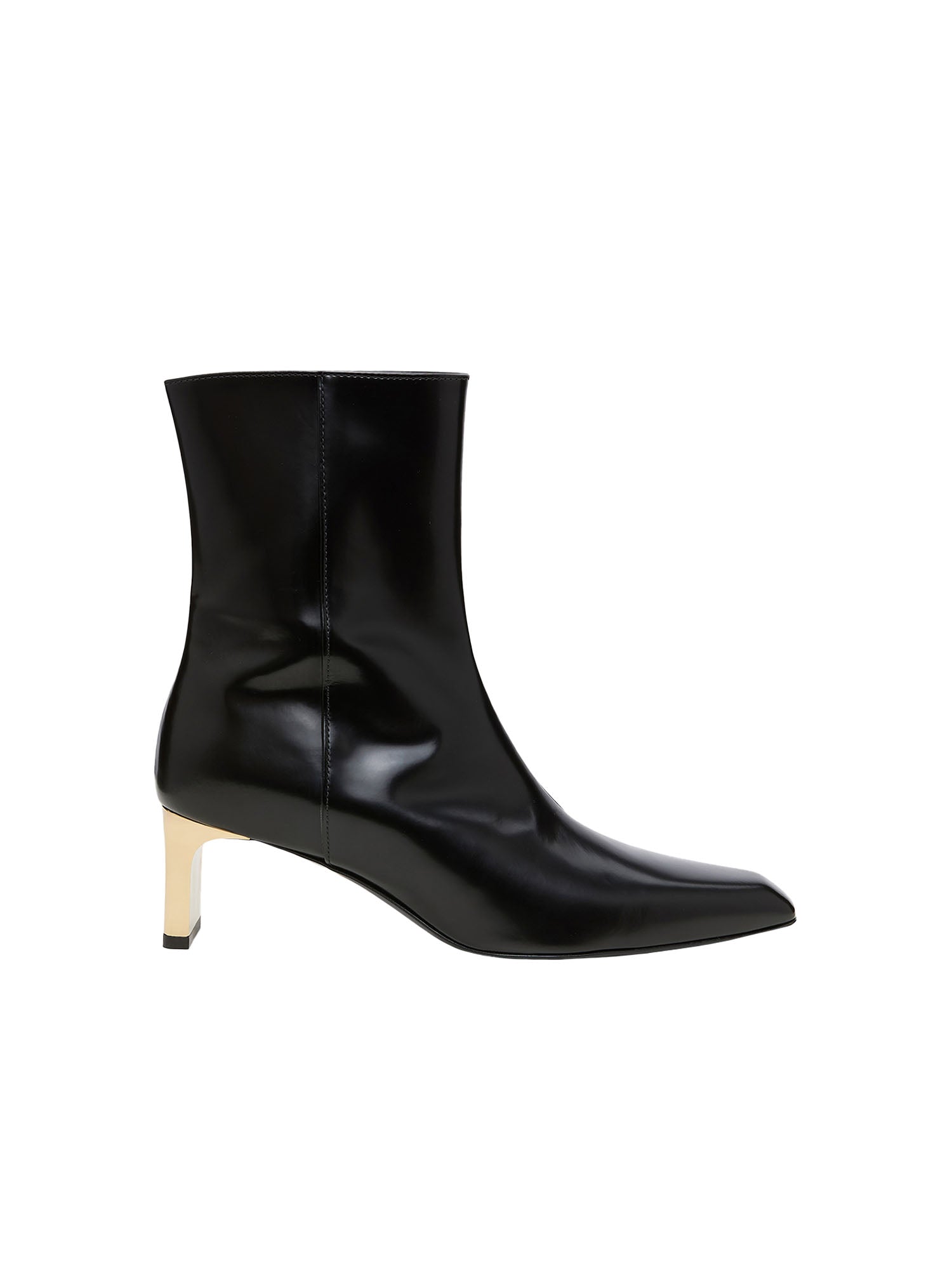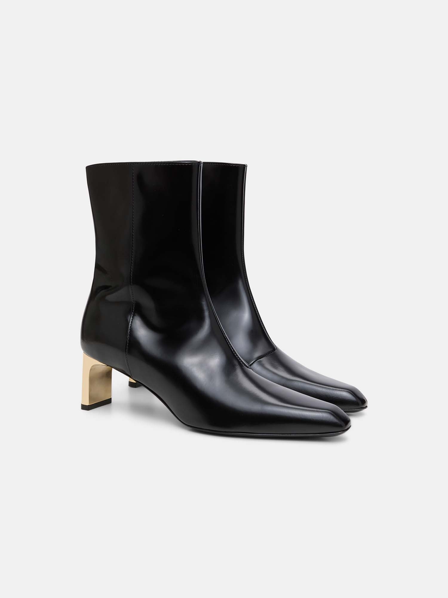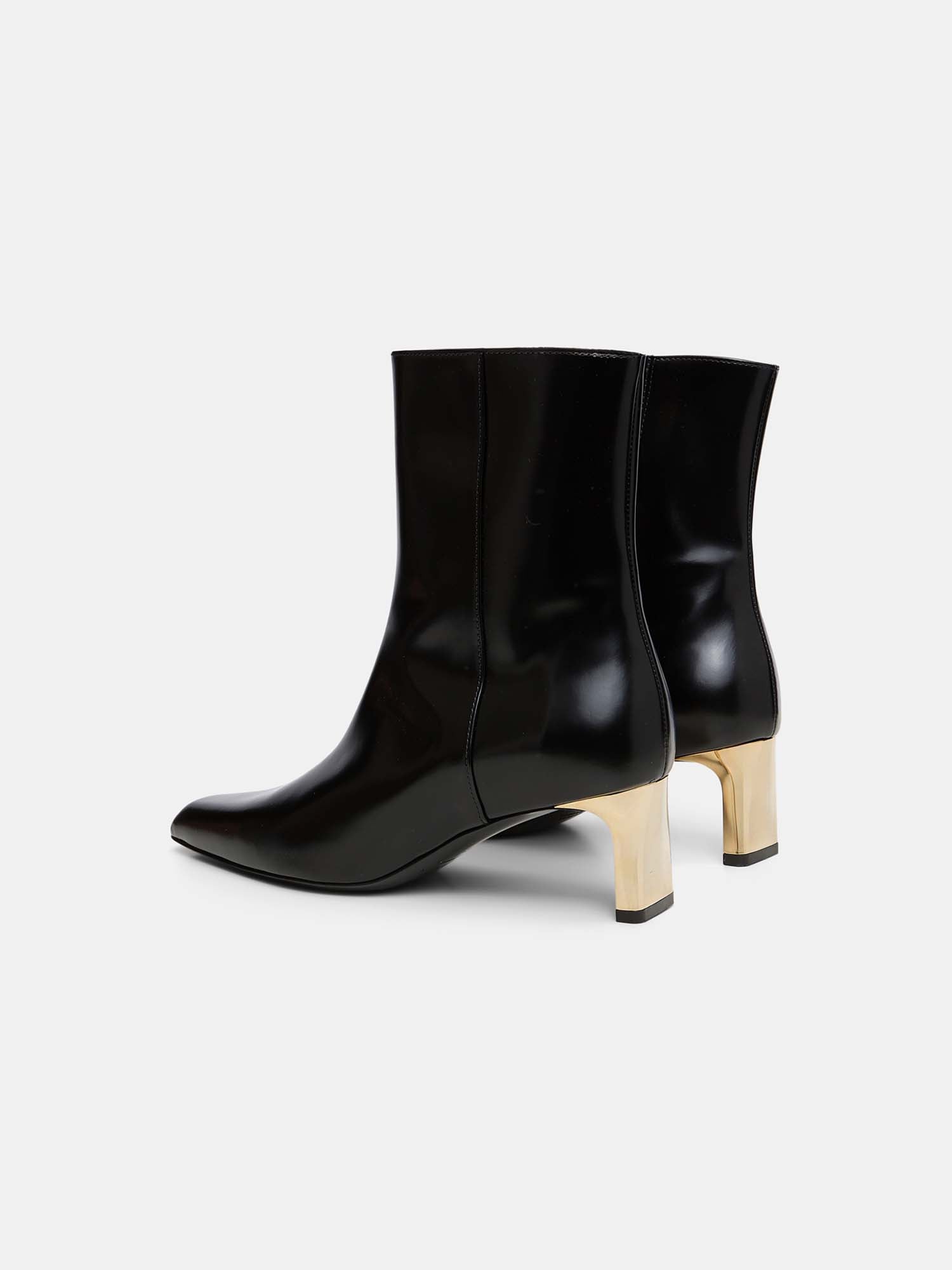 Dress it up, dress it down: Shoes set the styling mood. The mid-length boots pumps are crafted in mid-shine calfskin and have a chiseled toe. The set-back heels are golden and have a slim, rectangular shape.
