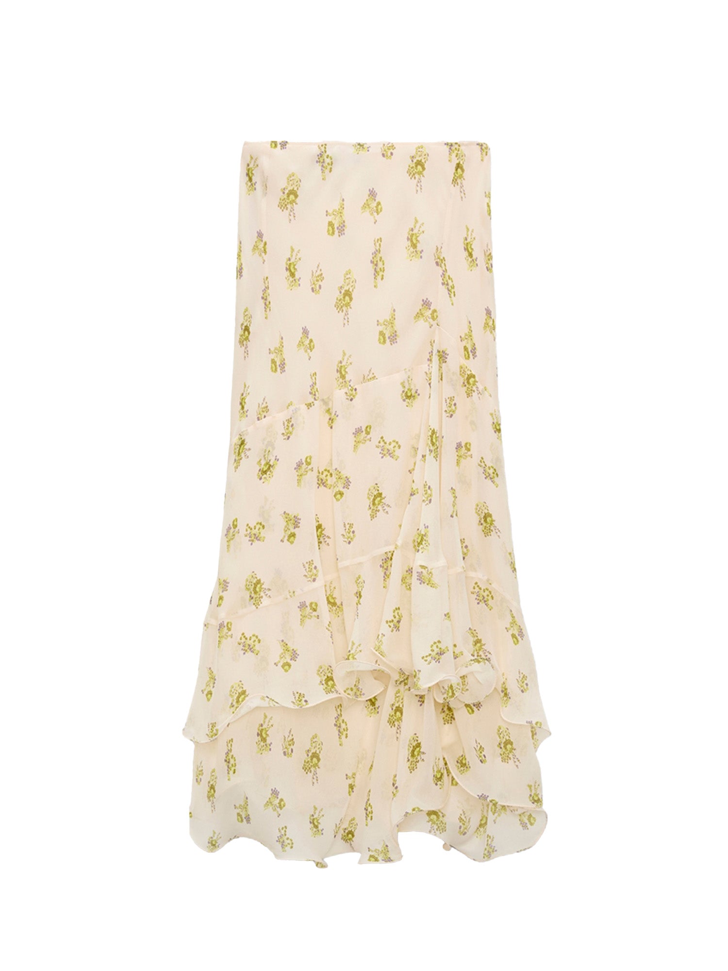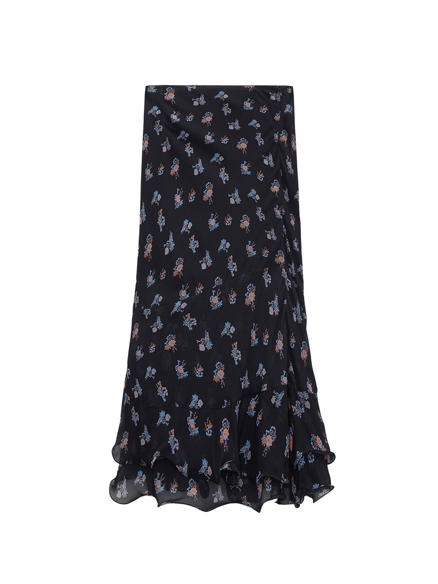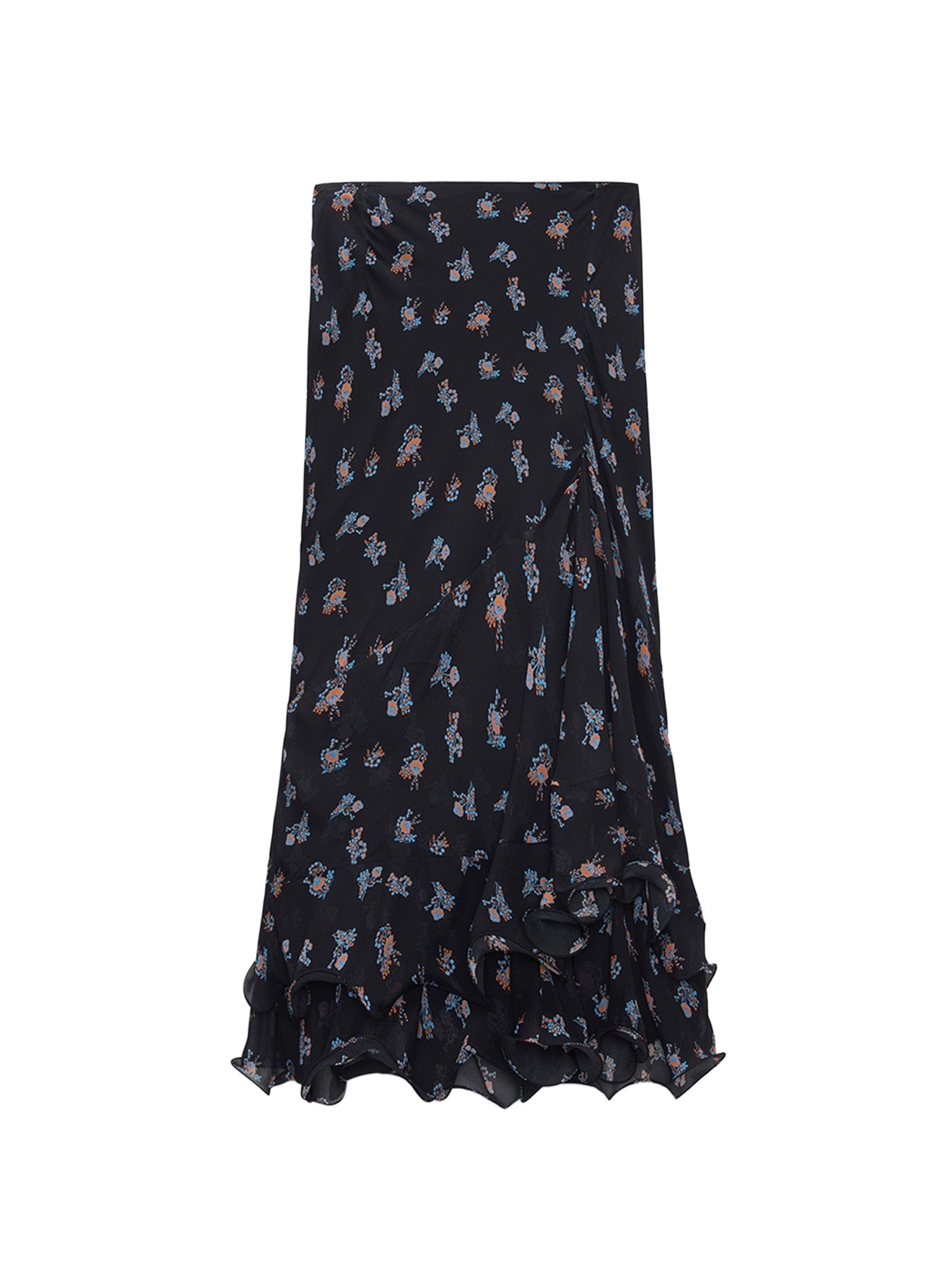 Expressive ruffles dress up the hemline of the printed georgette midi skirt. The bias cut skirt has an elastic waist and a hidden zip closure.