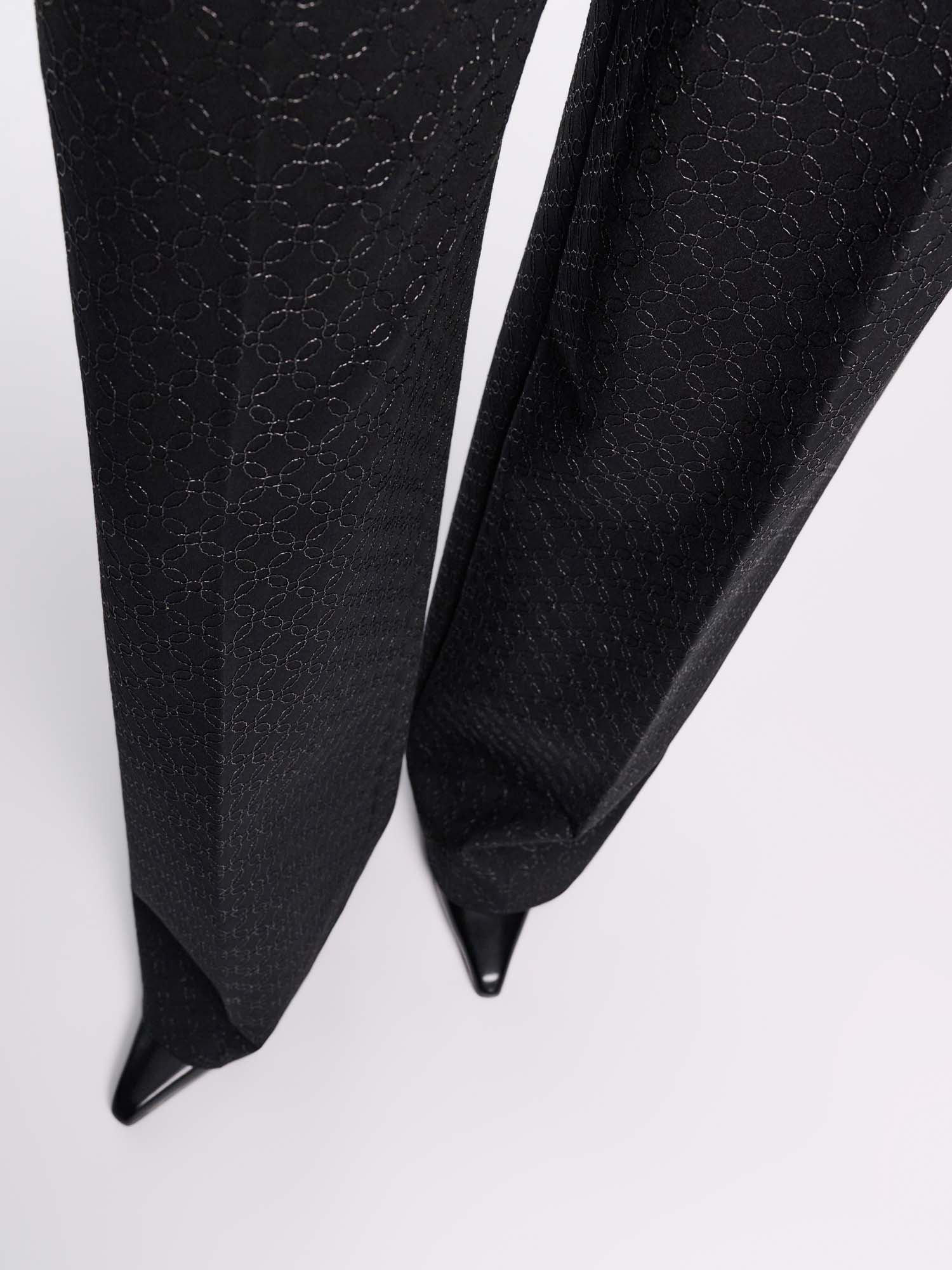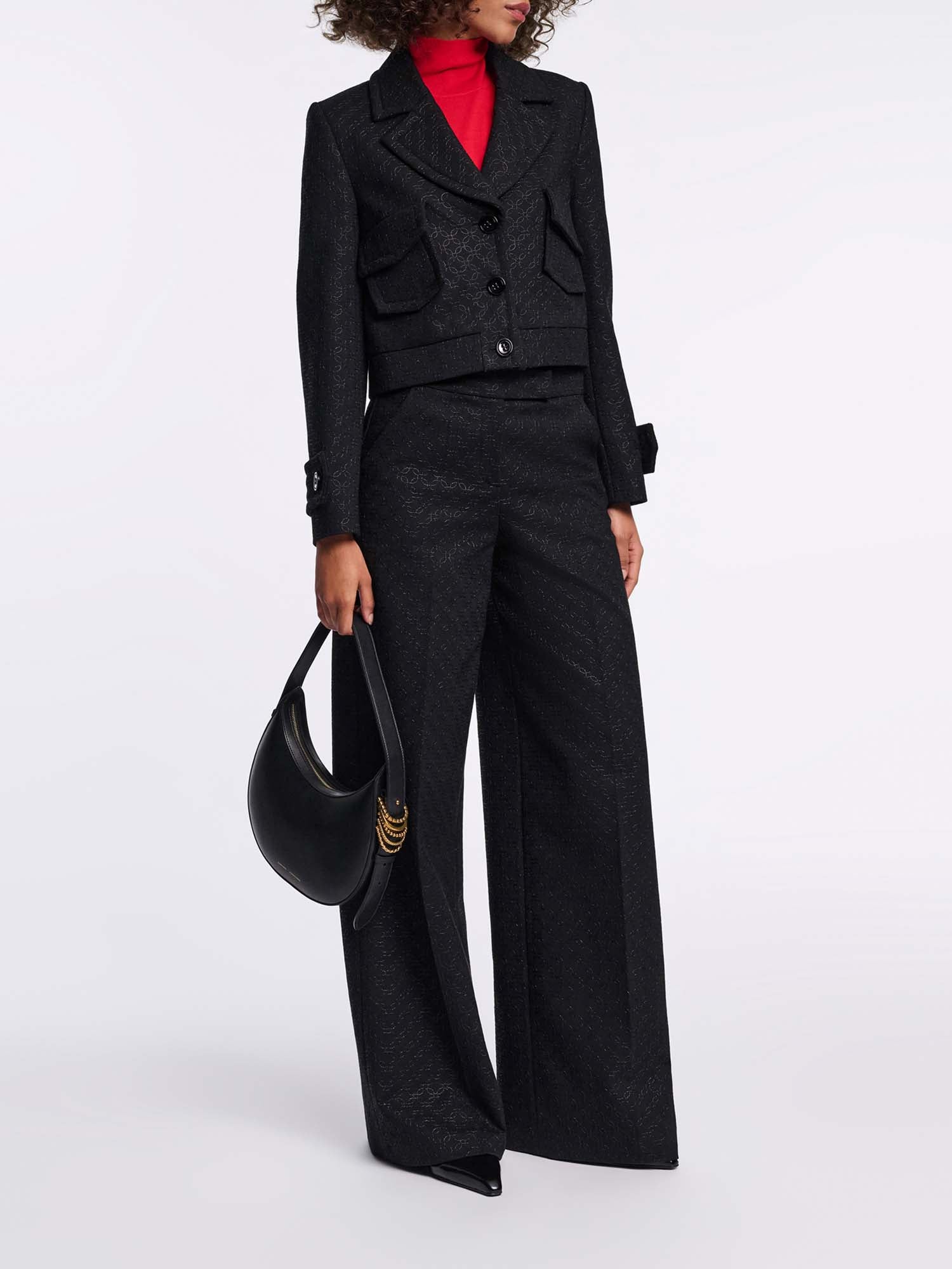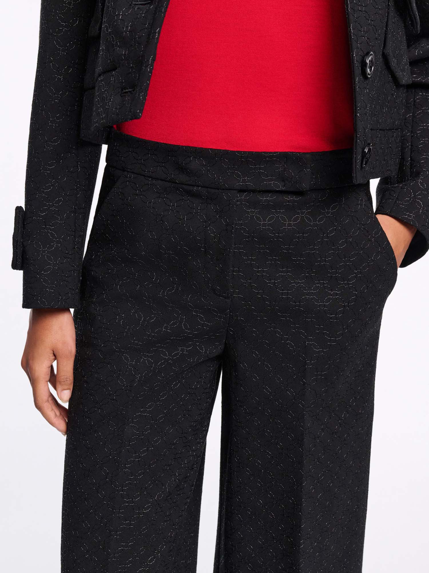 The pants are crafted in floral embroidered Punto Milano and have a wide leg. The pants can be worn as a set with one of our matching jackets.
