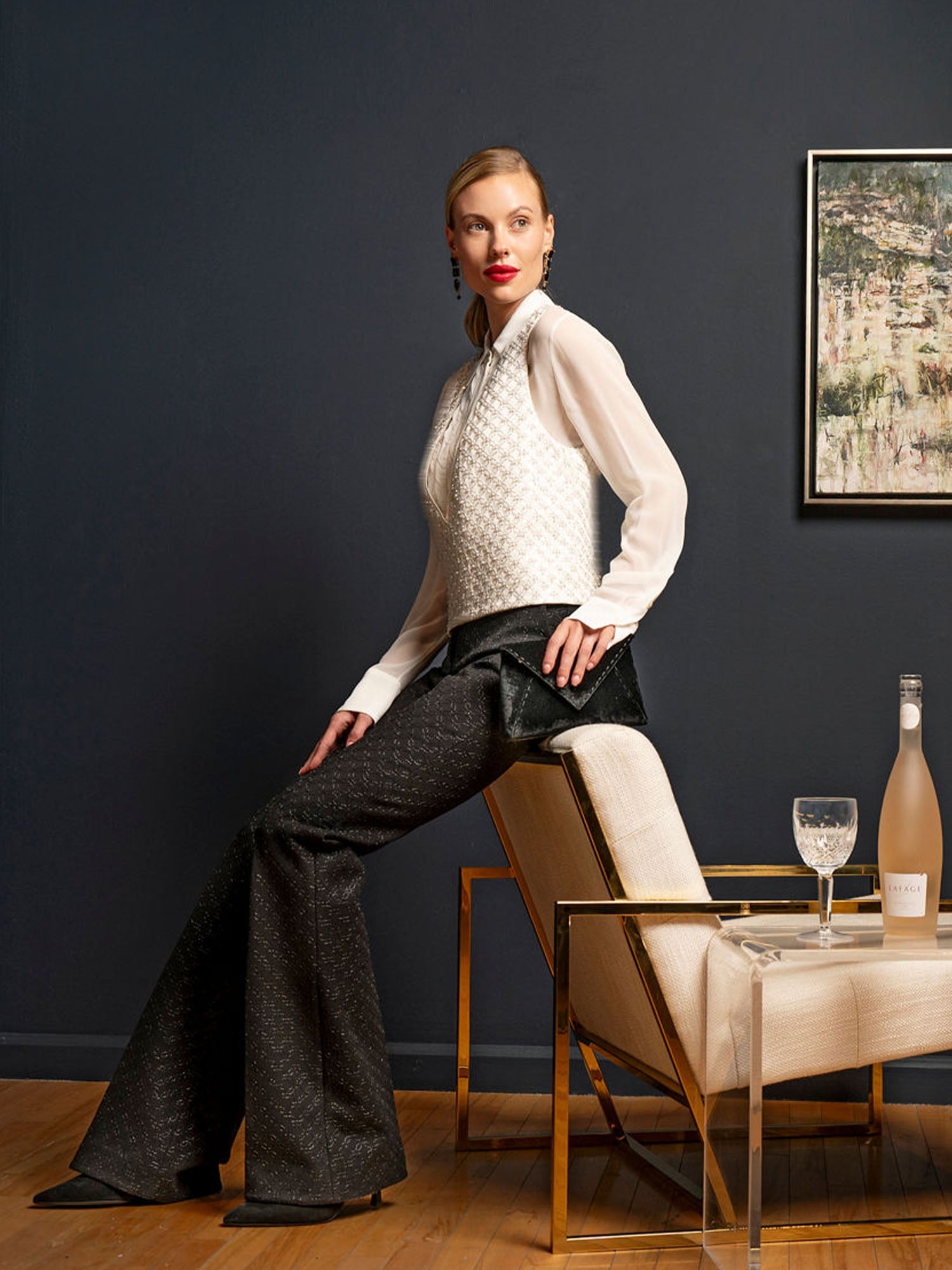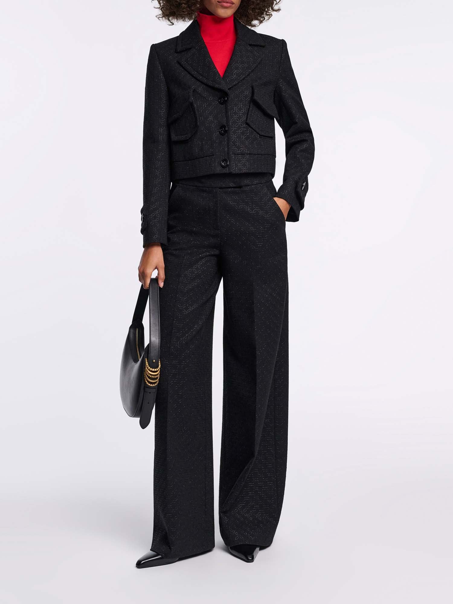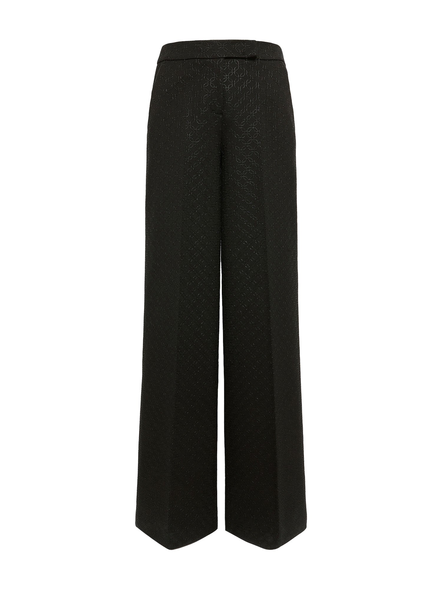 The pants are crafted in floral embroidered Punto Milano and have a wide leg. The pants can be worn as a set with one of our matching jackets.