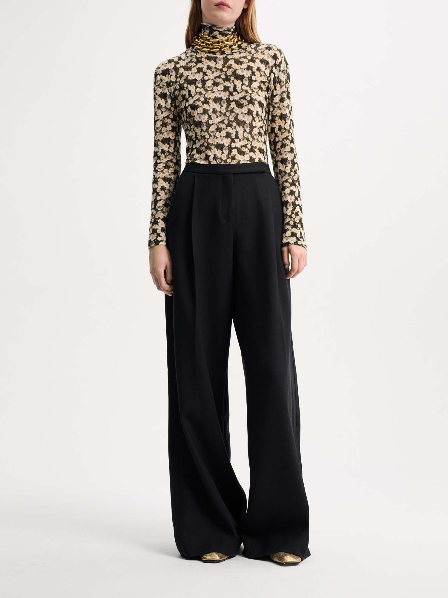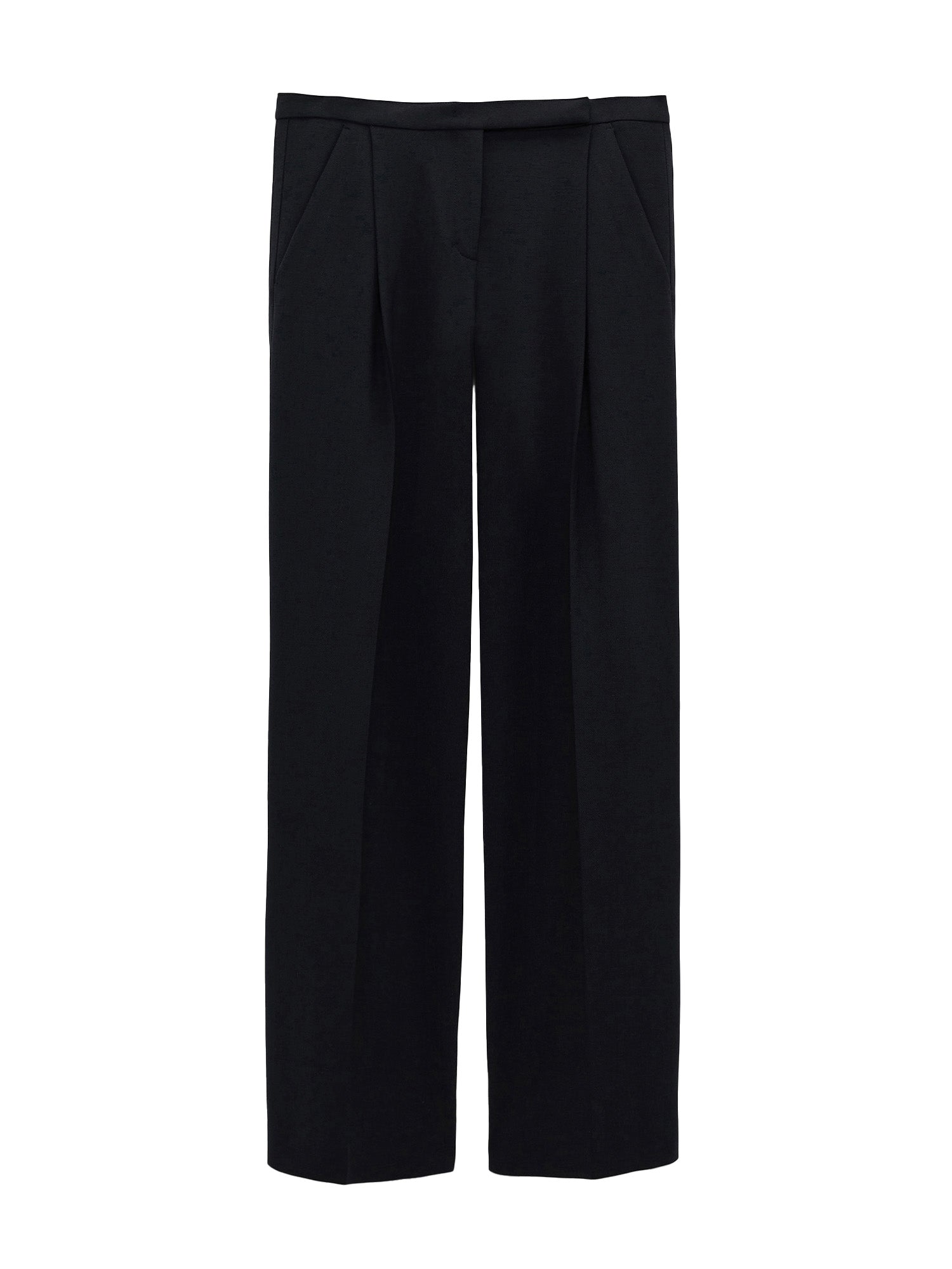 The wide leg pleated pants are crafted in a soft wool mix and have classic tailoring details. Pair together with the matching blazer as a suit.