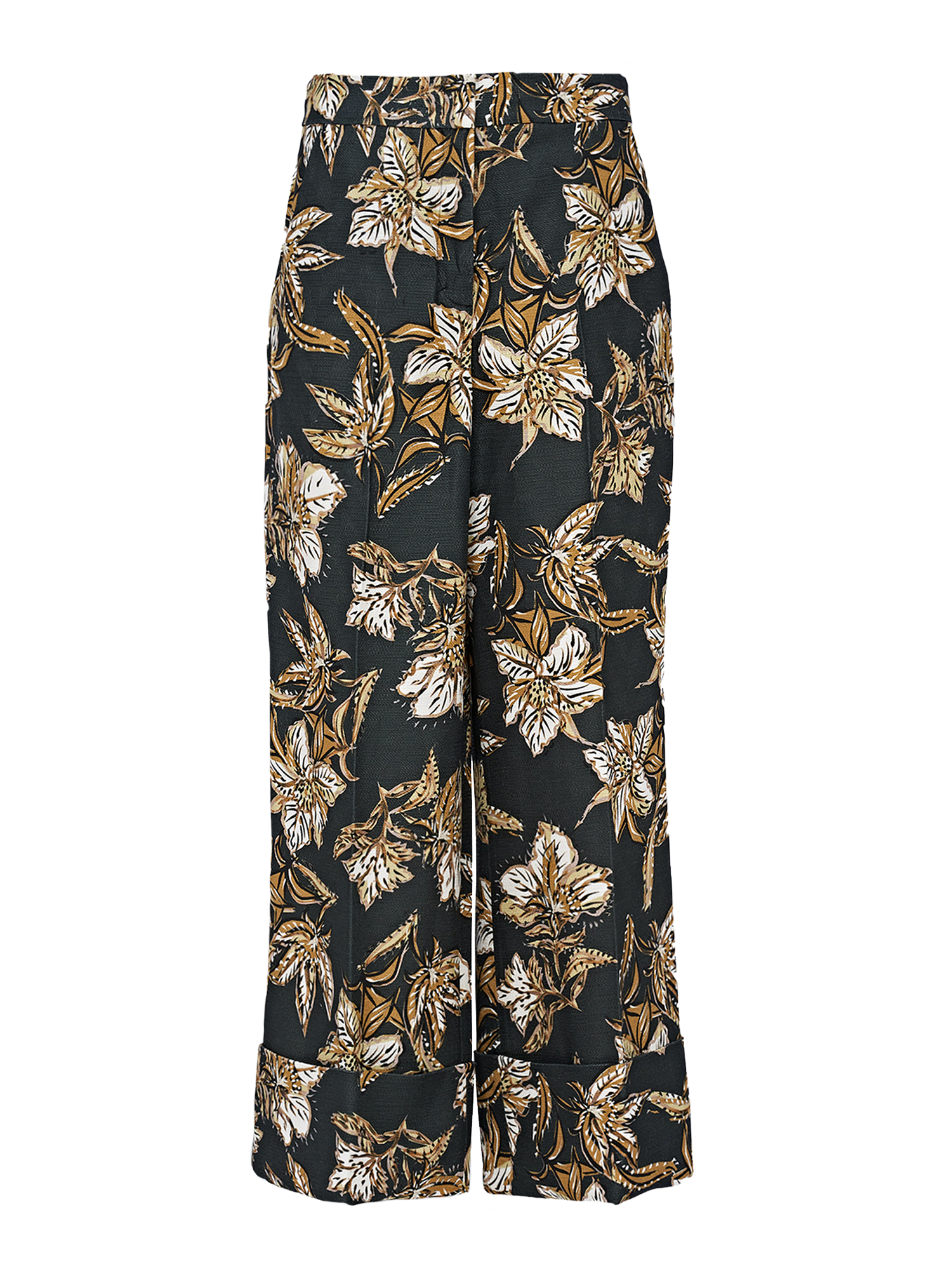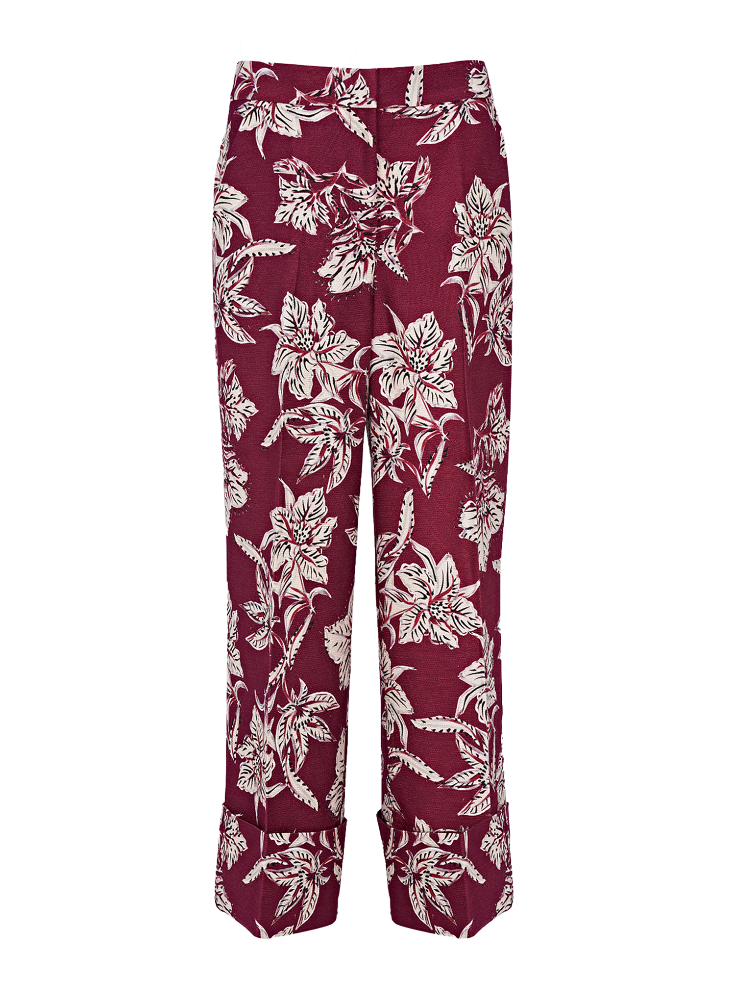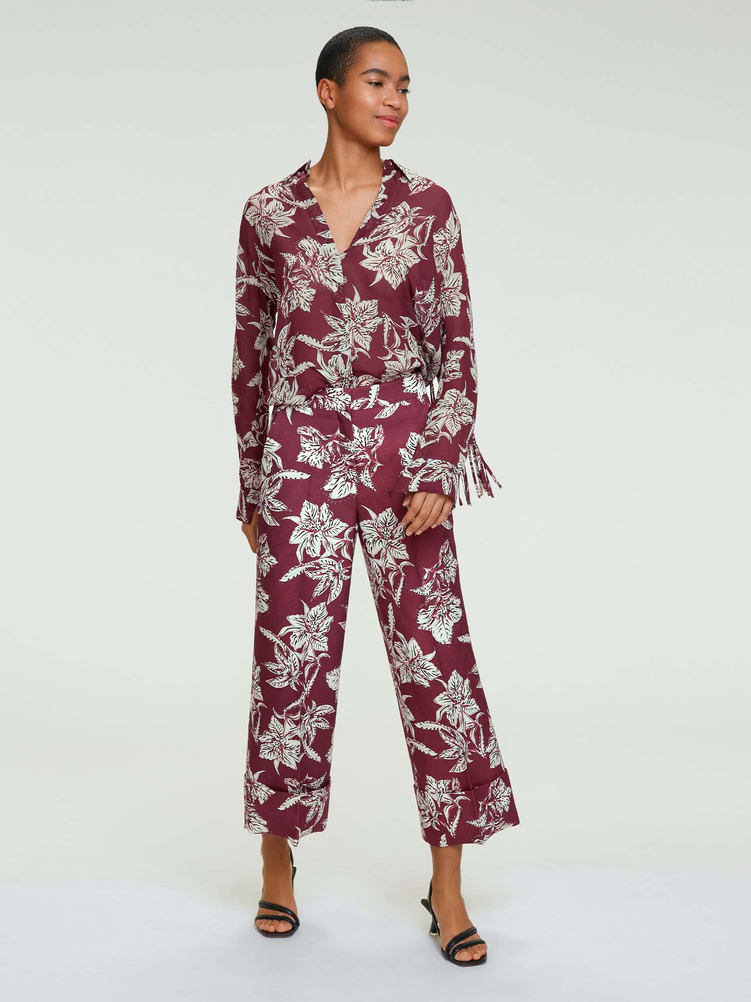The pants are made from textured summer tweed. The floral statement print turns the model into a favourite. The pants have a high turn-up. A summery key look is created with the perfectly coordinated blouse!