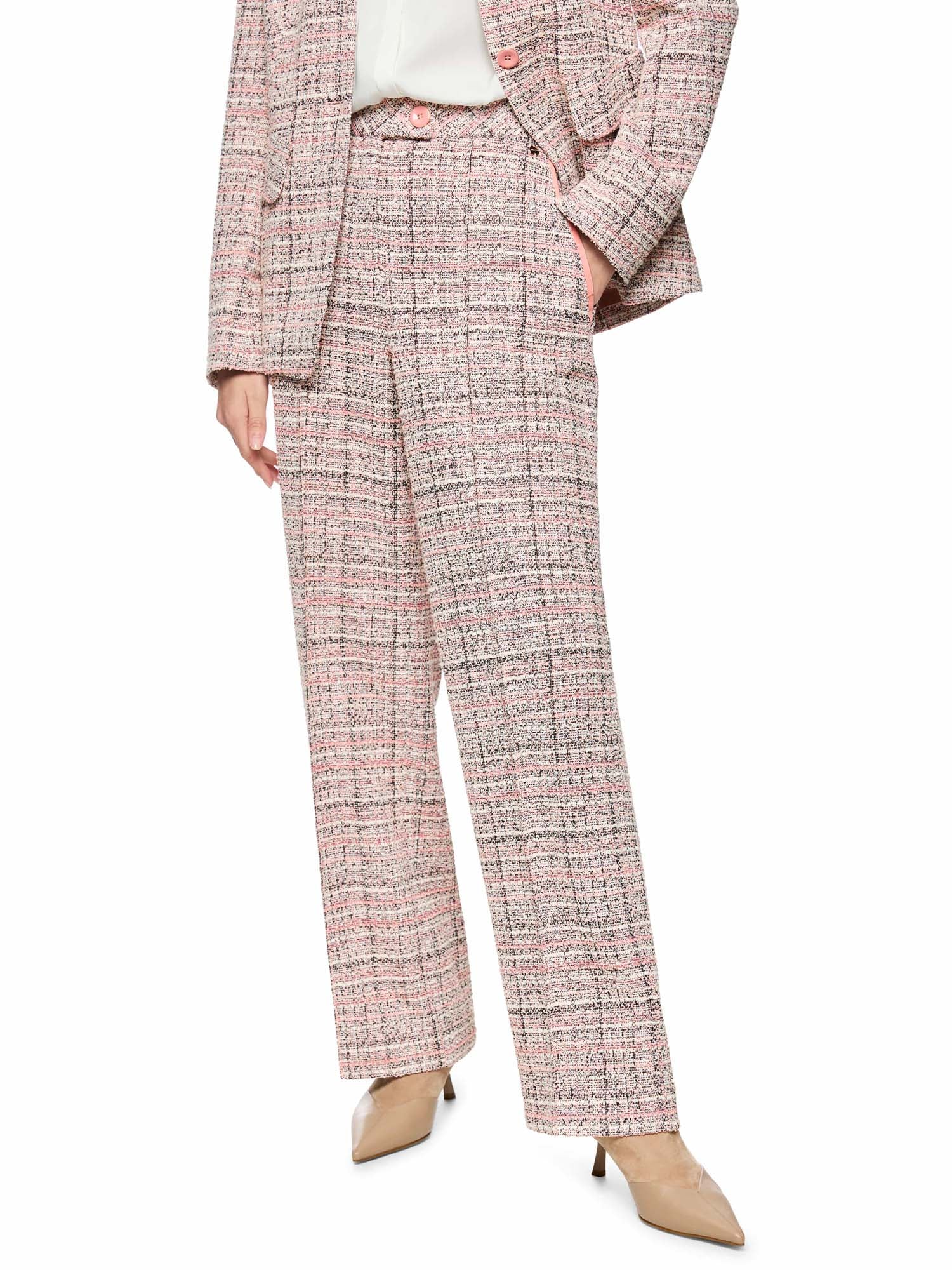 WUKARI wide fit, high waist trousers. The WUKARI trousers impress with their wide fit and high rise. The stitched piping along the leg emphasises the elegant silhouette. Practical wing pockets at the front and two faux welt pockets at the back complete the design. These trousers fasten in a classic way with a button and zip. With their high-quality material and wool content, the trousers look elegant and are comfortable to wear. Perfect for mixing and matching – a matching blazer in the same design completes the look.