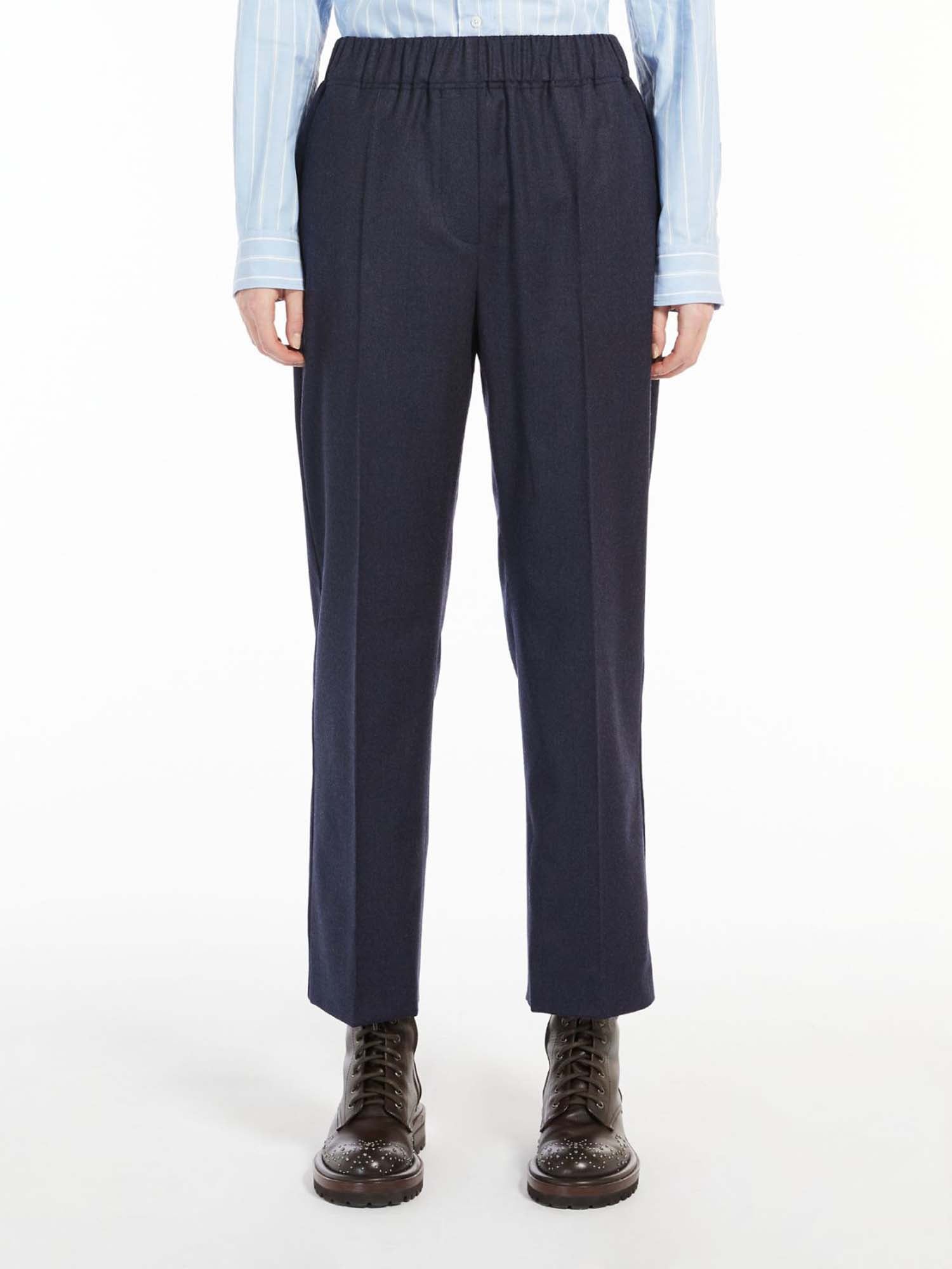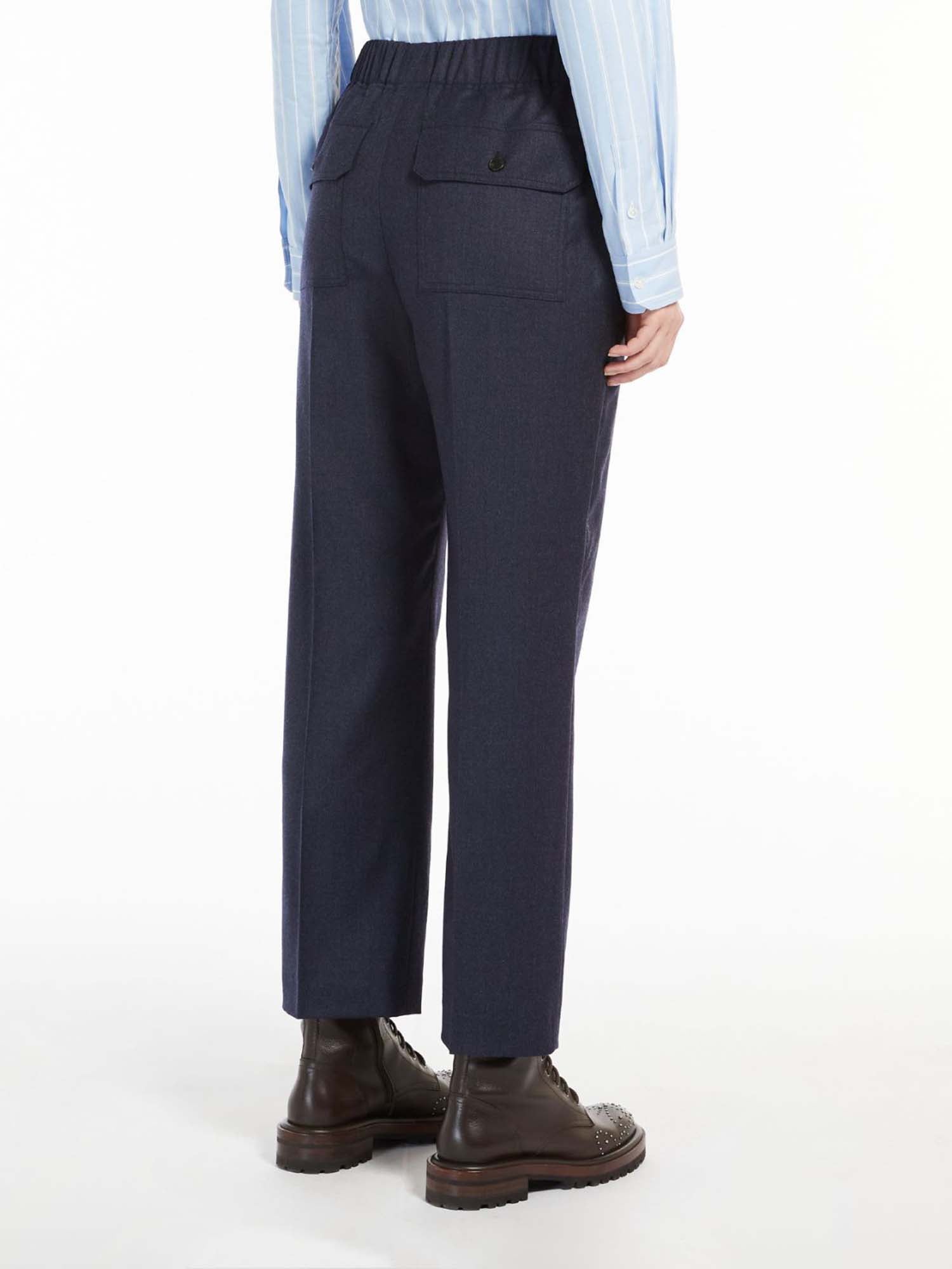 Stretch wool flannel trousers featuring an elasticated waistband, central pressed pleat detail, slant front pockets and flap-adorned patch rear pockets. Zip and hook-and-bar fastening. Length: 102 cm.