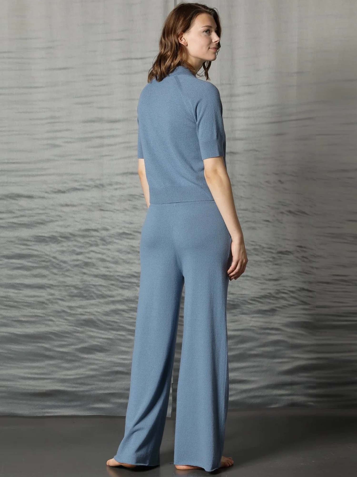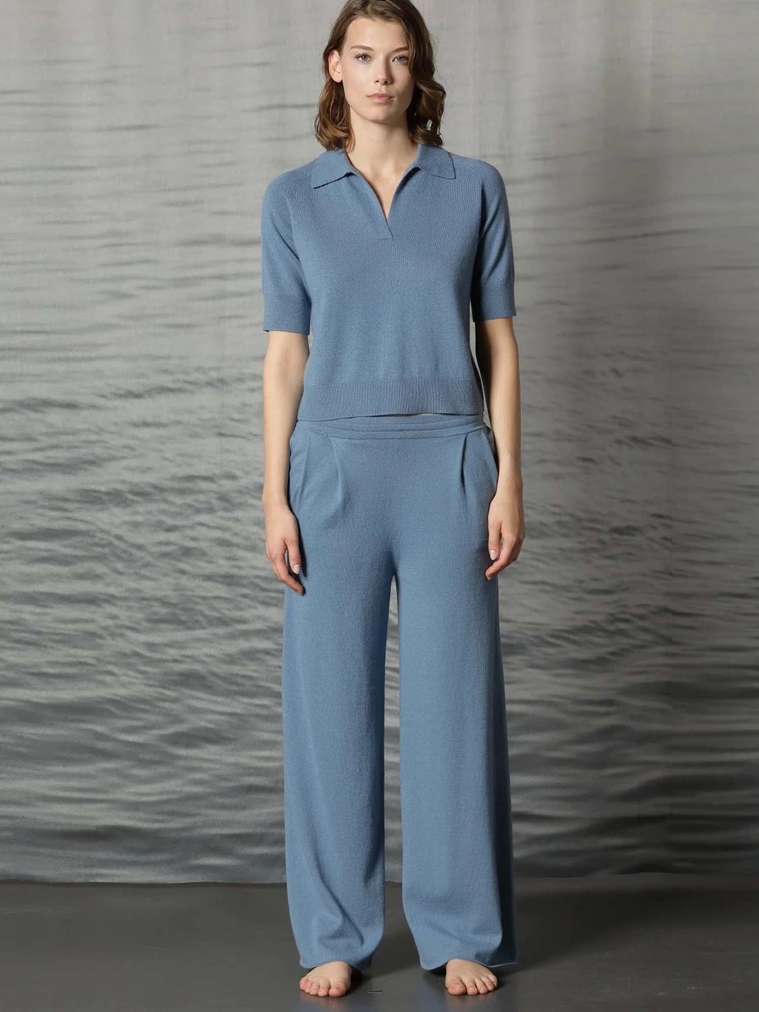 Crafted from a soft cashmere-cotton blend, these palazzo pants drape effortlessly with a fluid, wide-leg silhouette. Lightweight and refined, they offer understated luxury and all-day ease with a polished finish.
