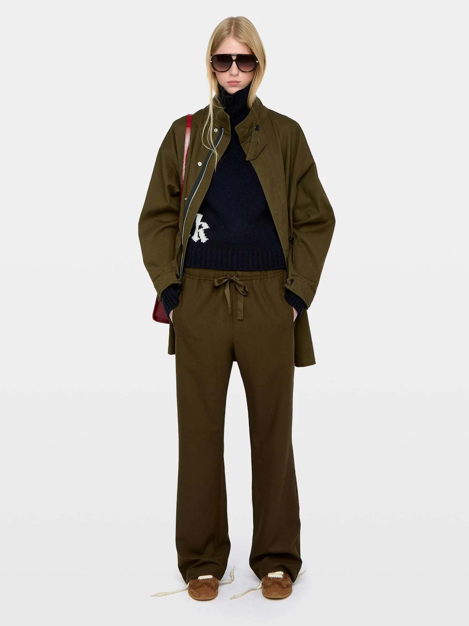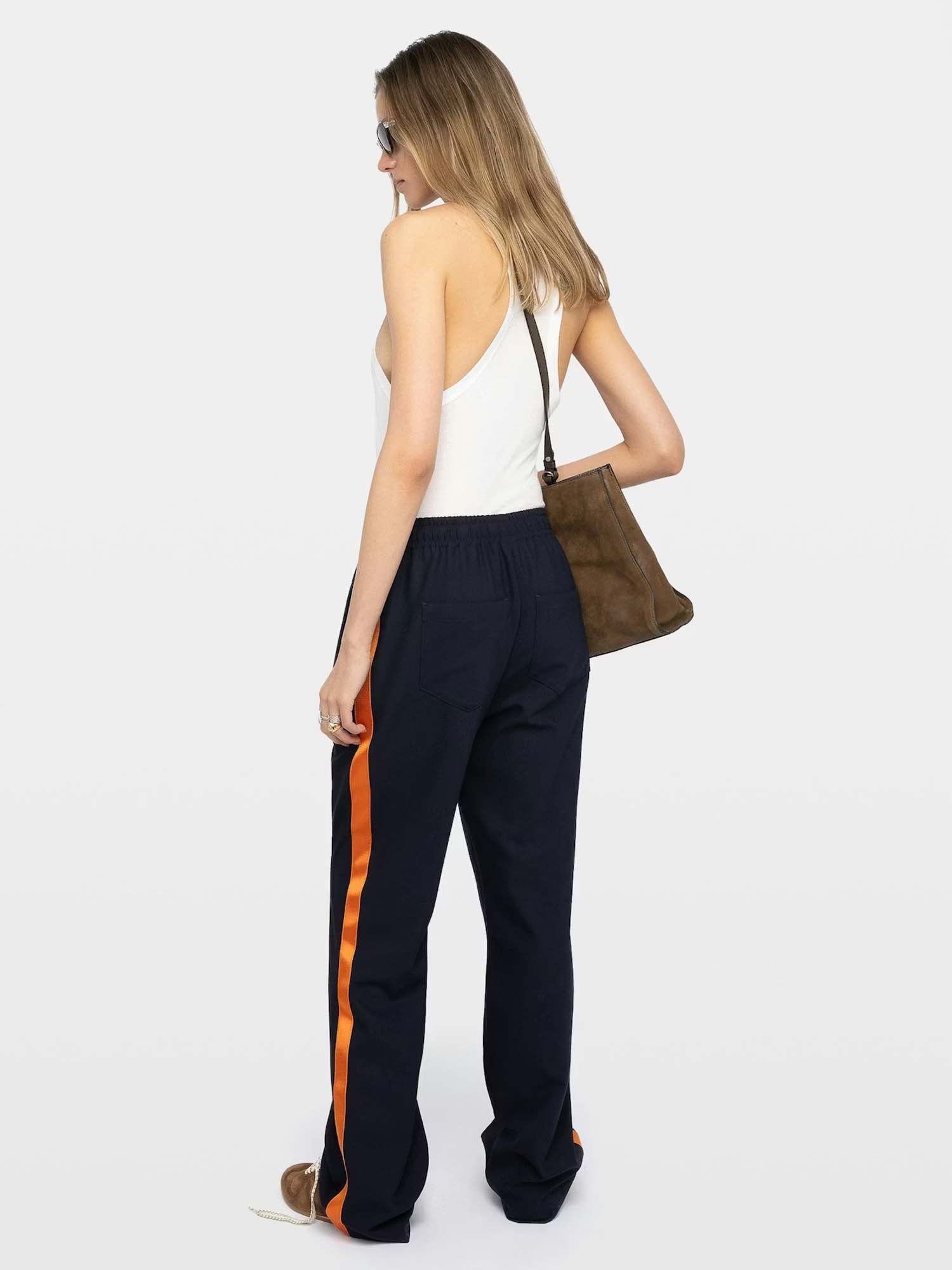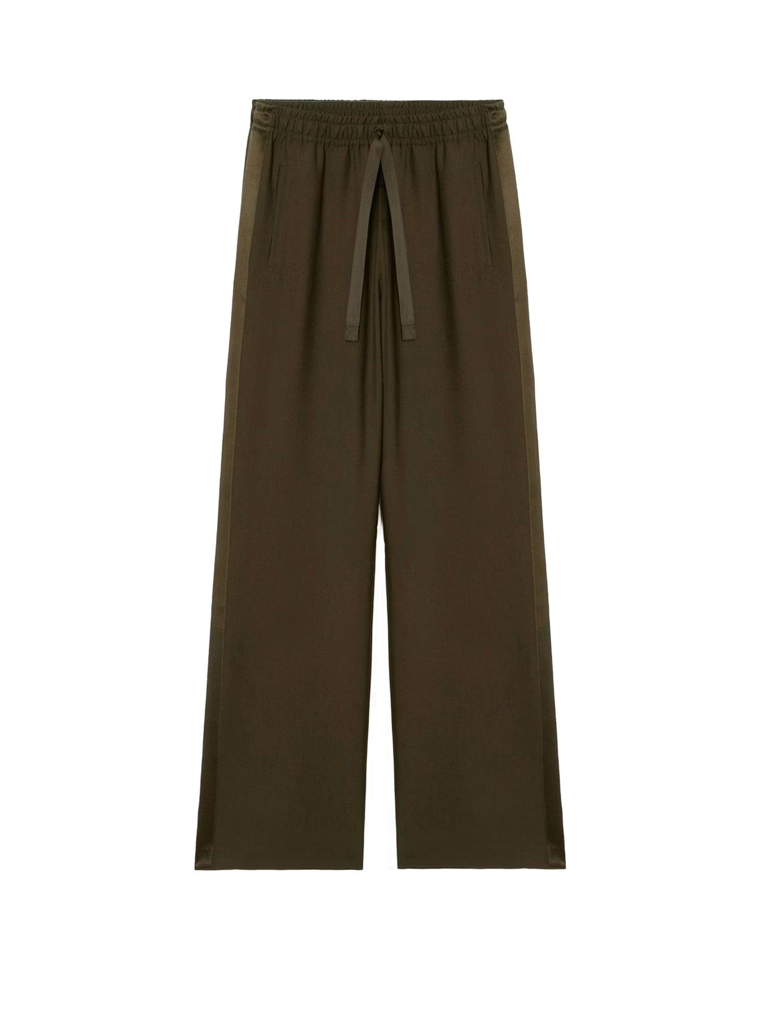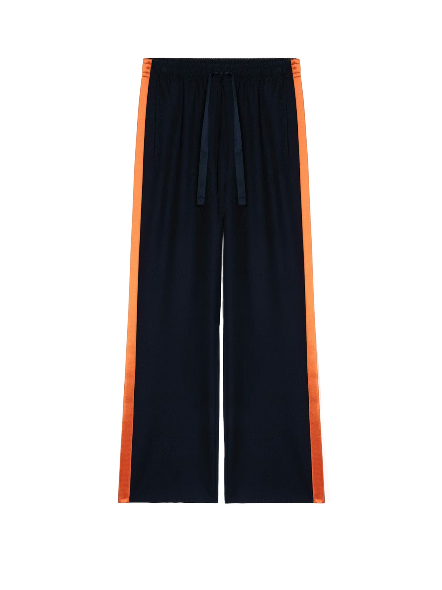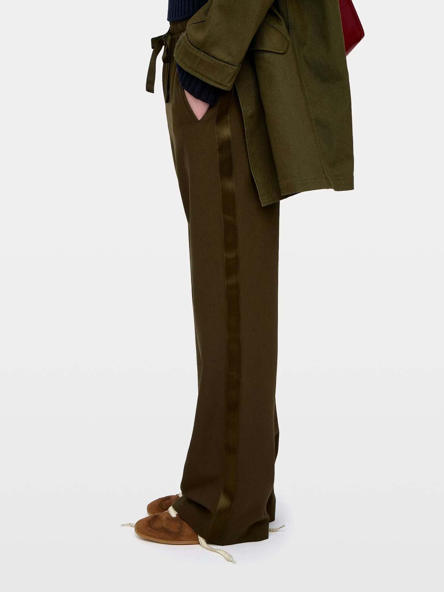 Straight-leg tailored trousers with a relaxed jogging-inspired silhouette. Designed with contrasting satin side stripes, welt pockets, and an elasticated low-rise waist for a modern, effortless fit.