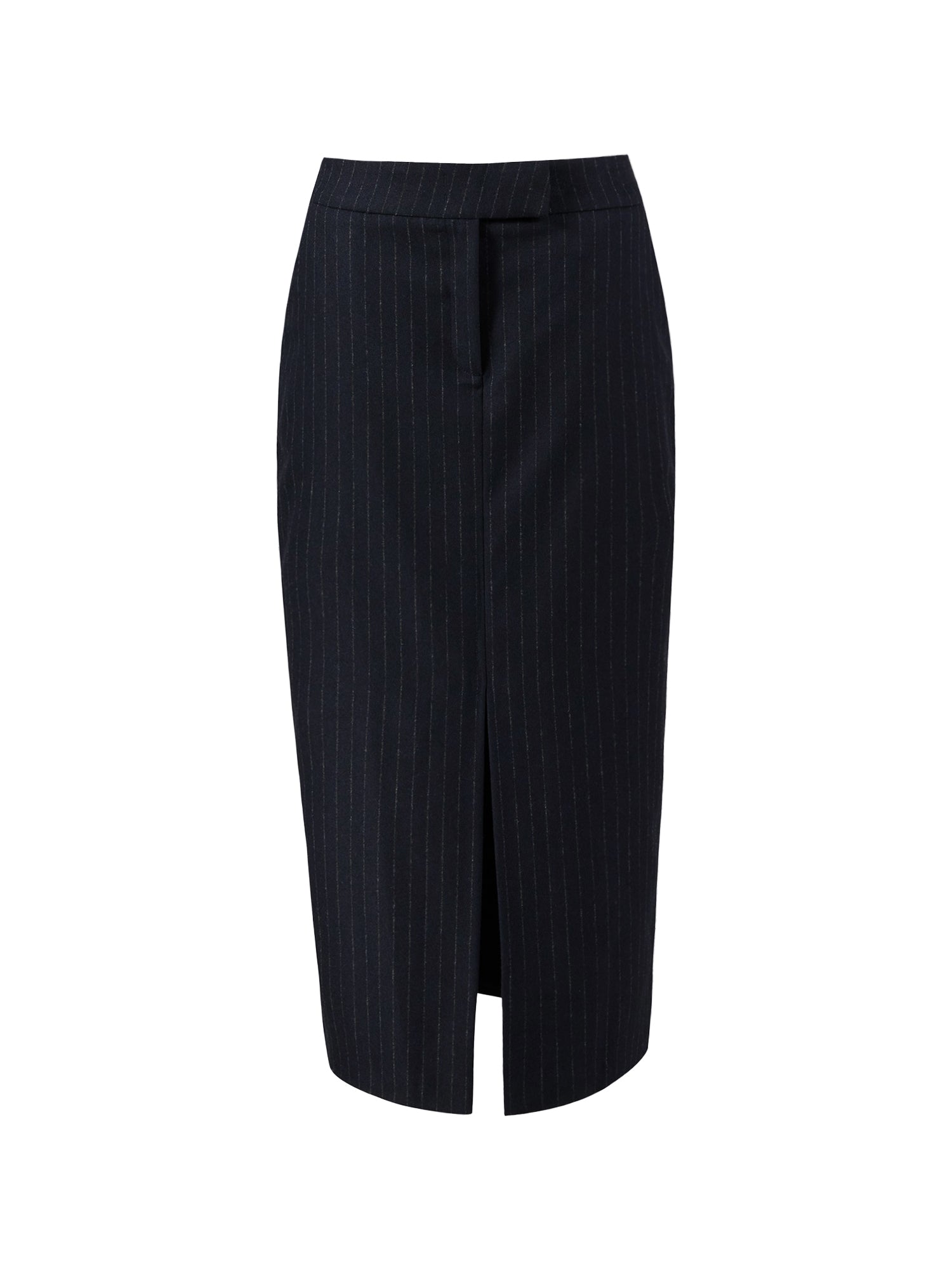 Flannel look pinstripe maxi slim skirt with center front slit and extanded tab waist detail. Slim fit.