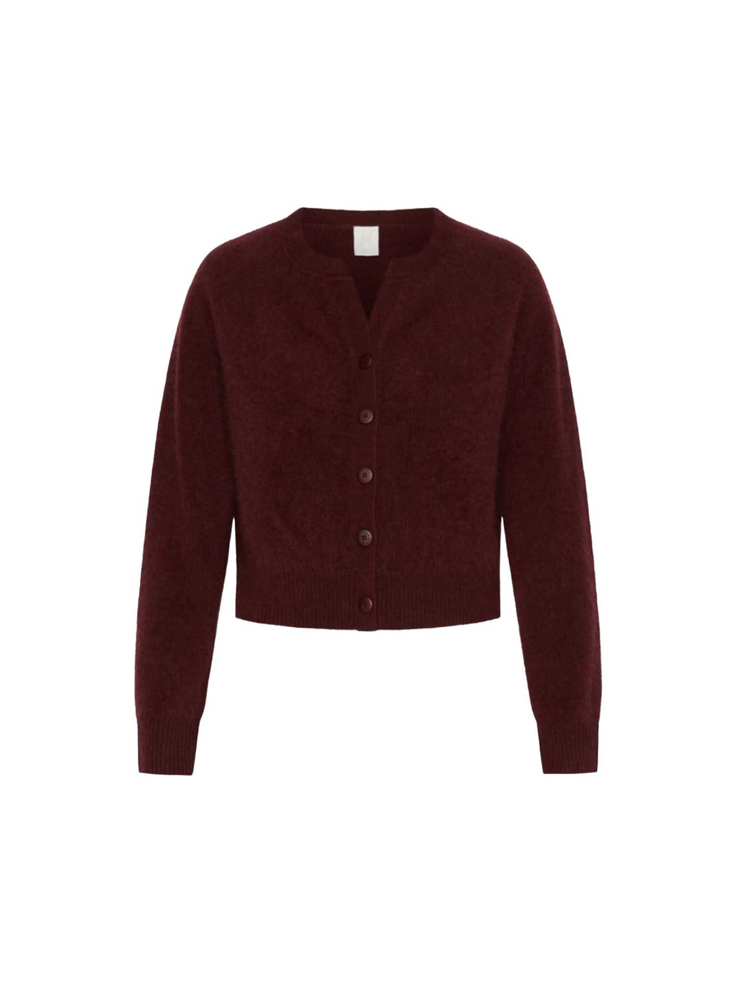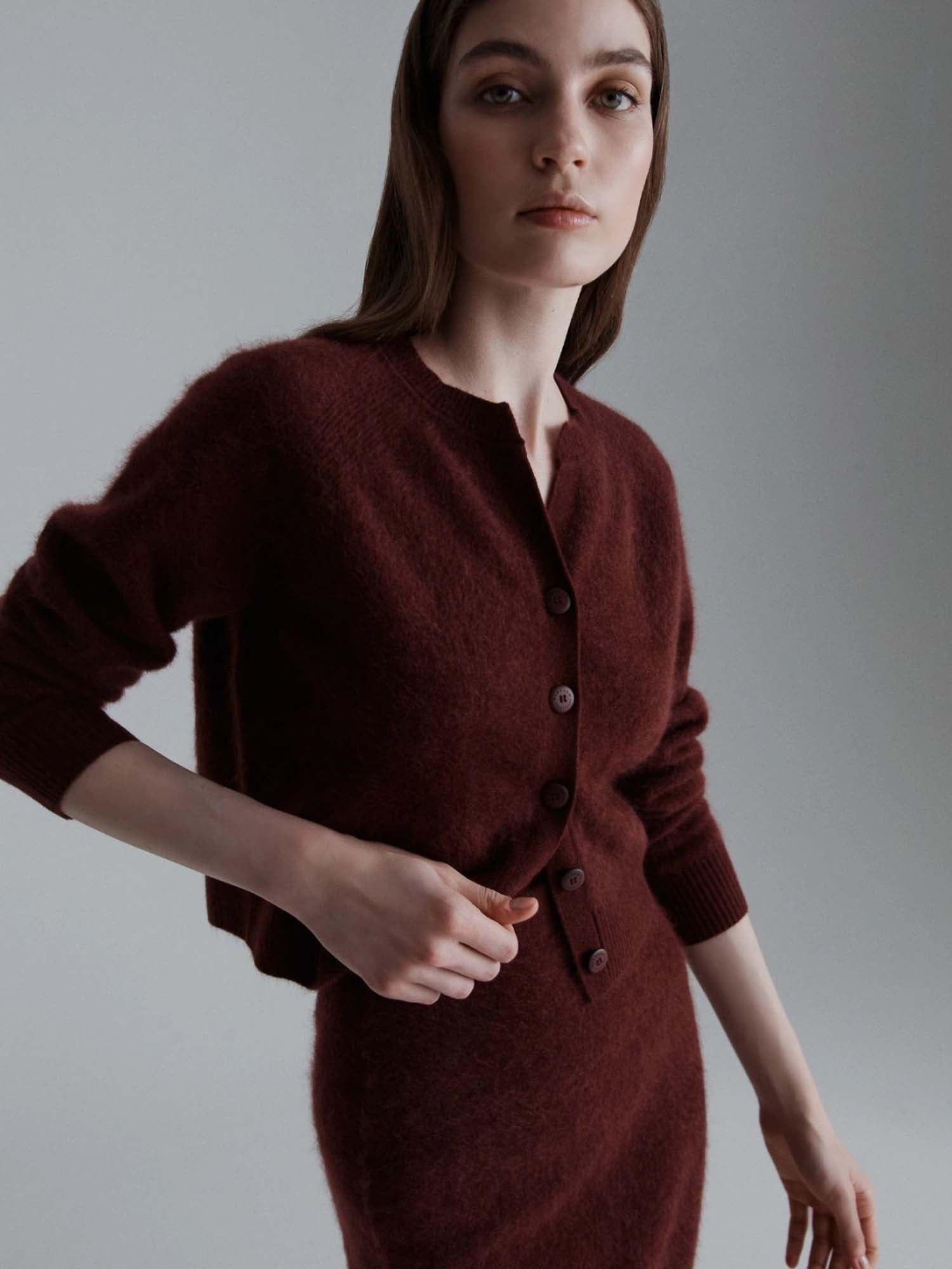The fluffy-look wool and cashmere yarn modernizes the timeless cardigan concept. The model features branded buttons and embroidered logo detail on the back of the neck.