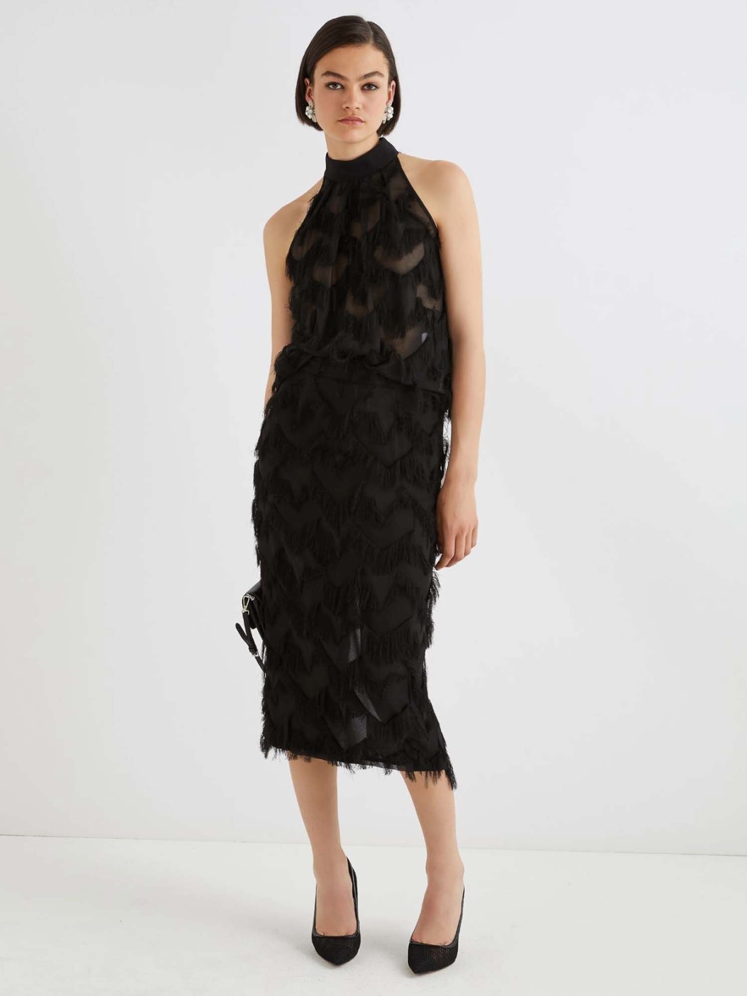 Designed for the most elegant occasions: this georgette skirt is decorated with a patterned fil coupé fringe. Wear the sensual and feminine model with the matching top for your glamorous evenings.