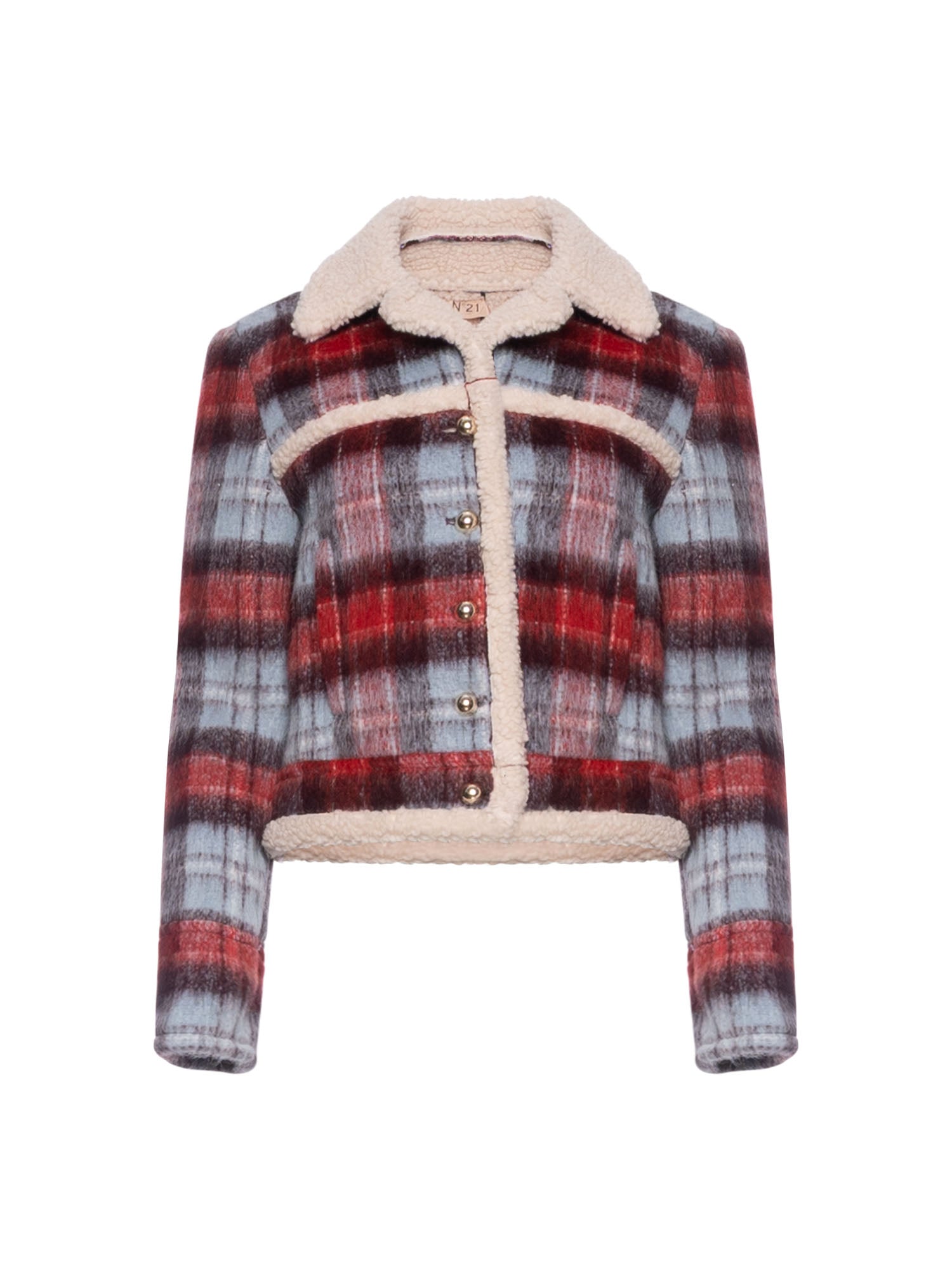 Eco-shearling-trimmed checked jacket featuring a cropped silhouette and straight fit. Crafted from a wool blend with a checked pattern in shades of red, light blue, and brown, it features beige eco-shearling trim on the collar, front, and hem, and a front button closure. The jacket has long sleeves and high front patch pockets.