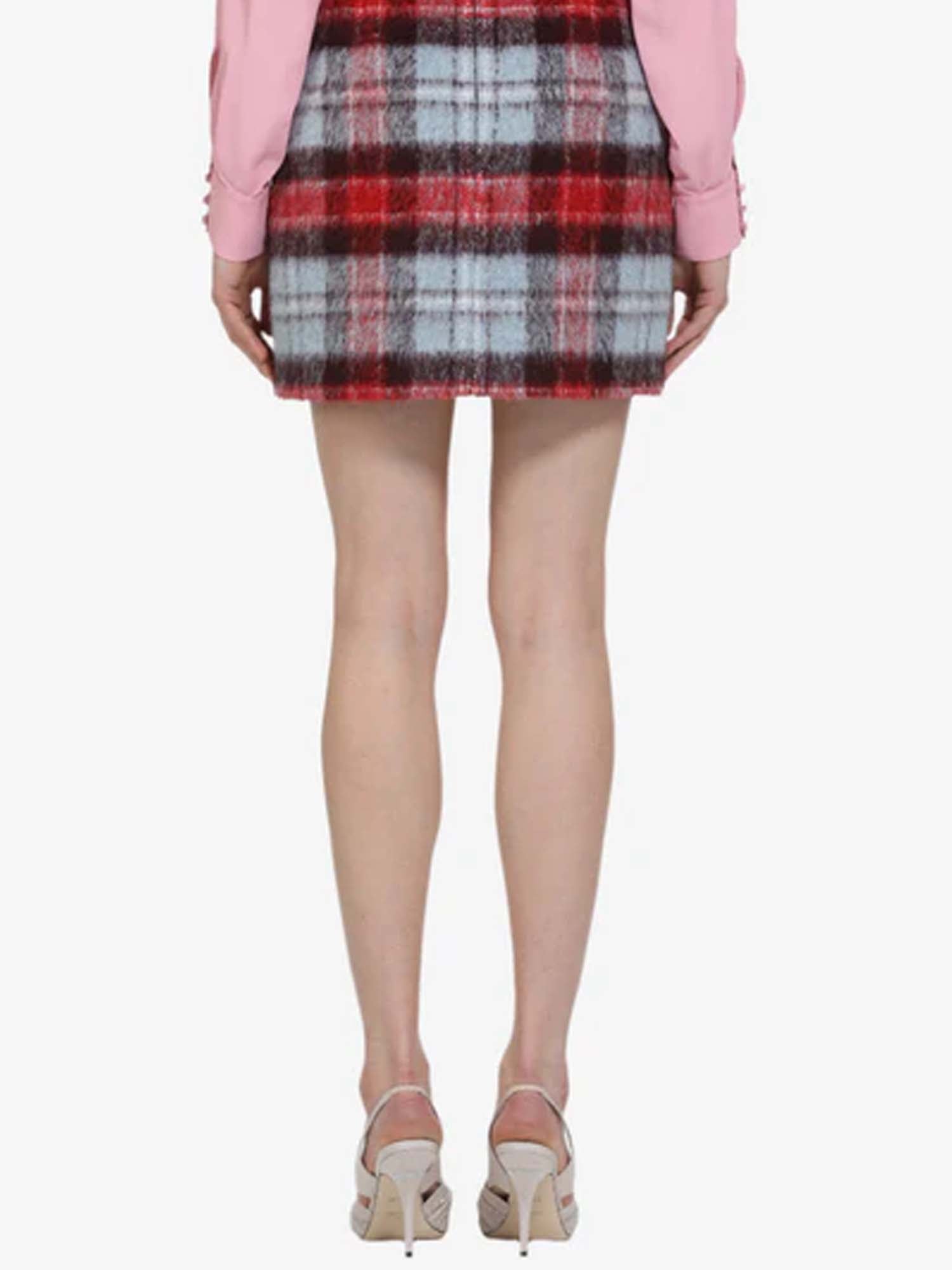 Checkered mini skirt made of a blended fabric with a soft, slightly shaggy texture. It features a straight, short silhouette with a high waist, two front patch pockets, and a concealed back zip closure. The check pattern features shades of red, gray, and black, creating a classic and versatile look.