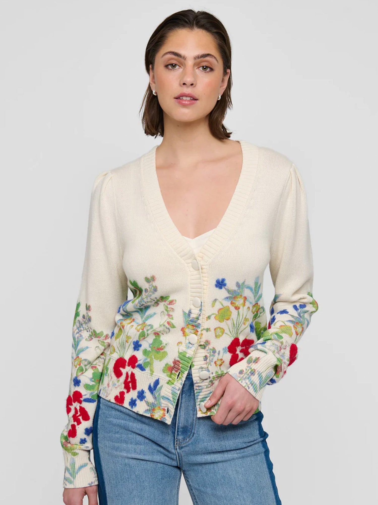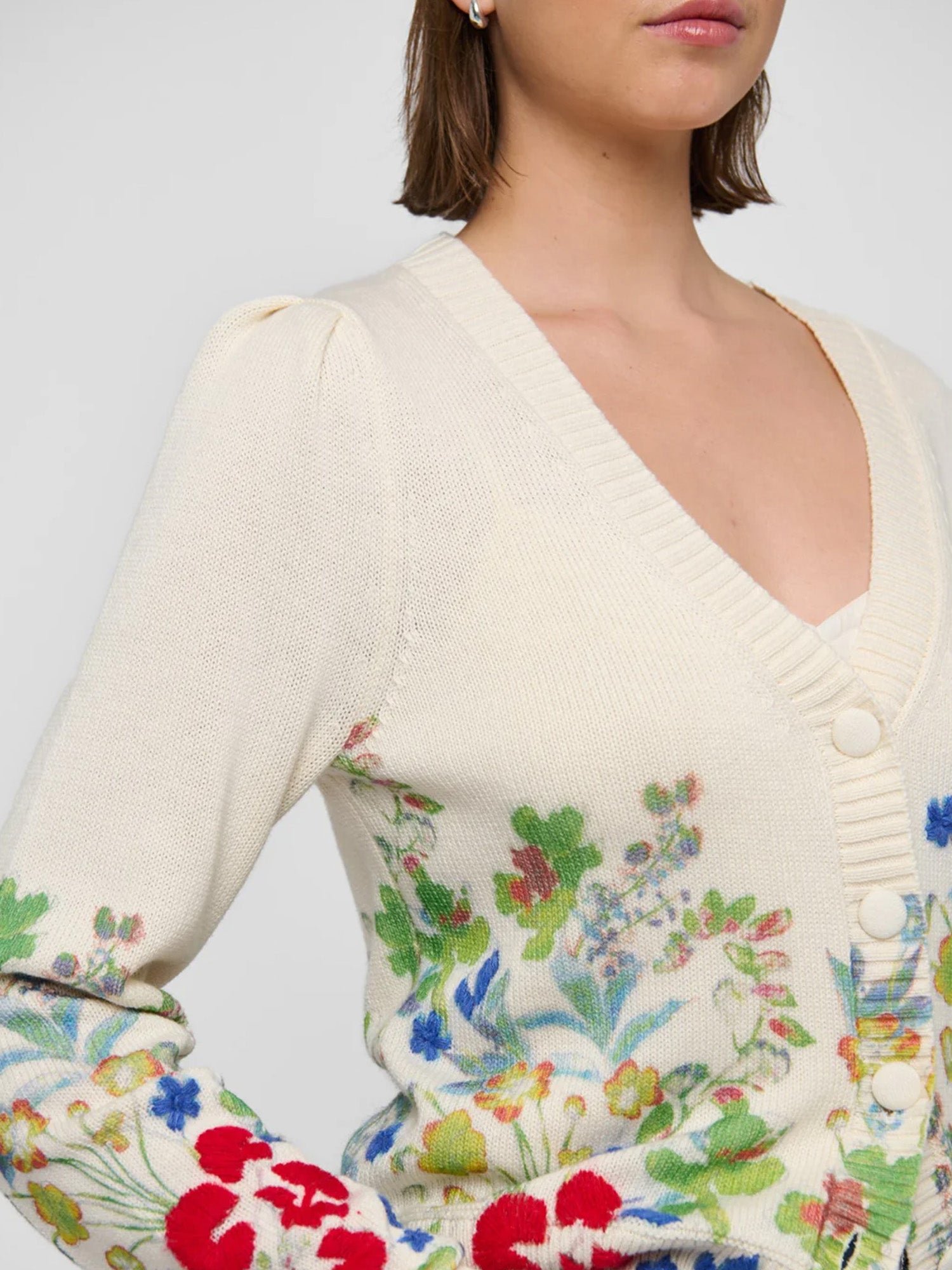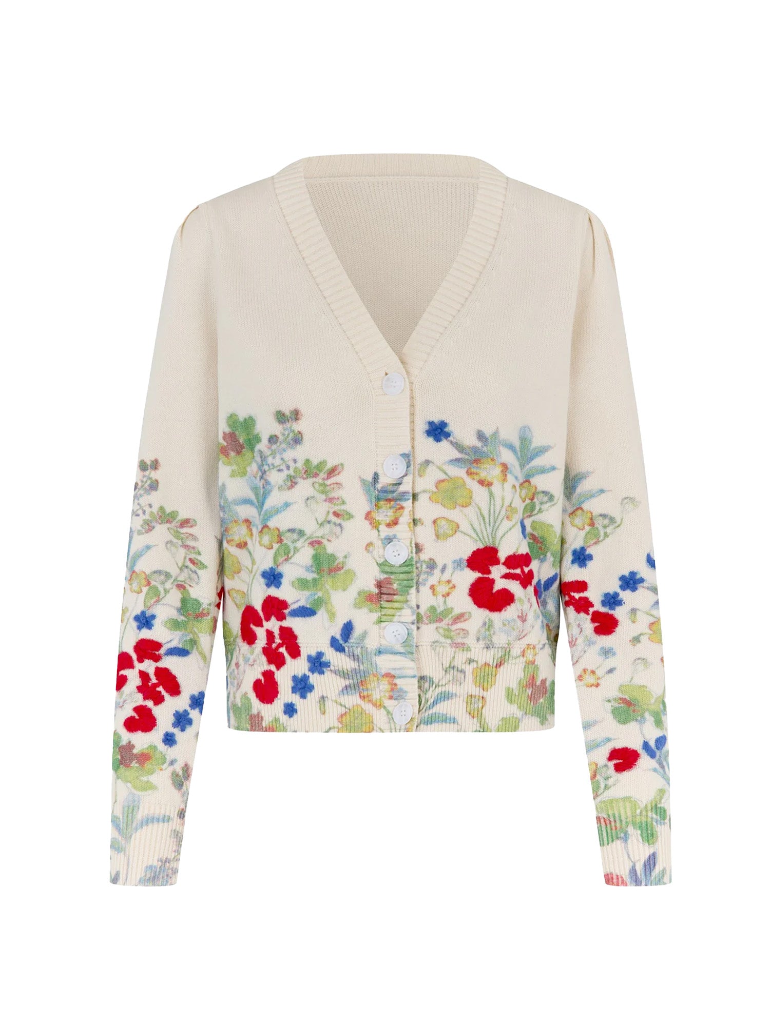 Painterly spring flowers blossom along the border of this printed cotton blend cardigan. Feminine as well as cosy, it is perfect for a chilly day worn with jeans or more dressed up in the evening with a skirt.