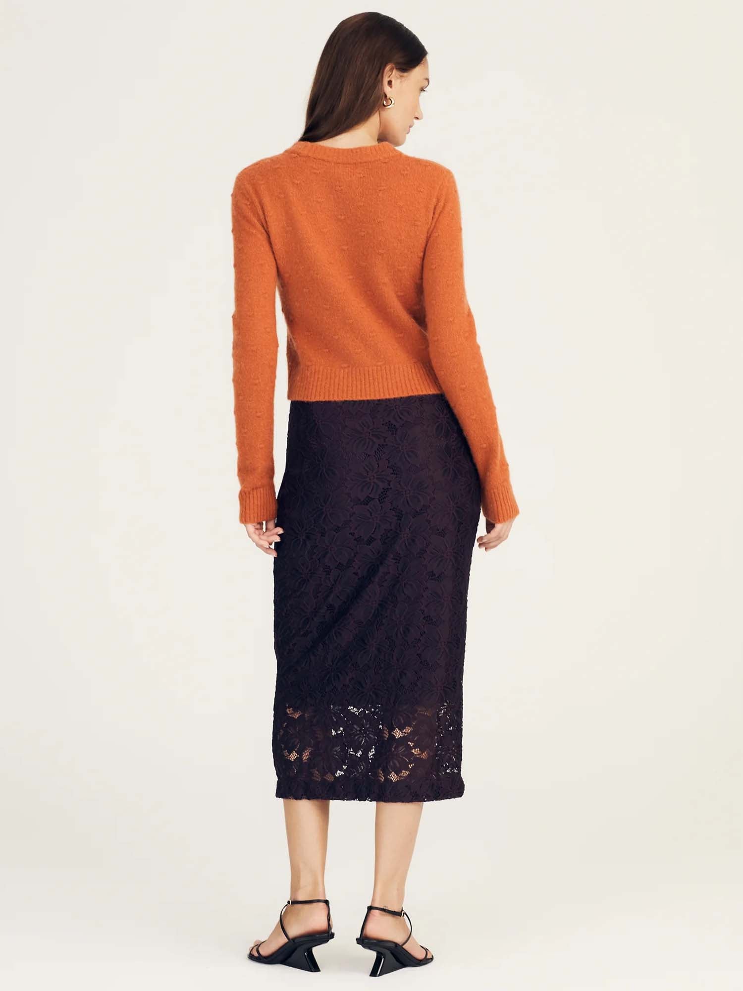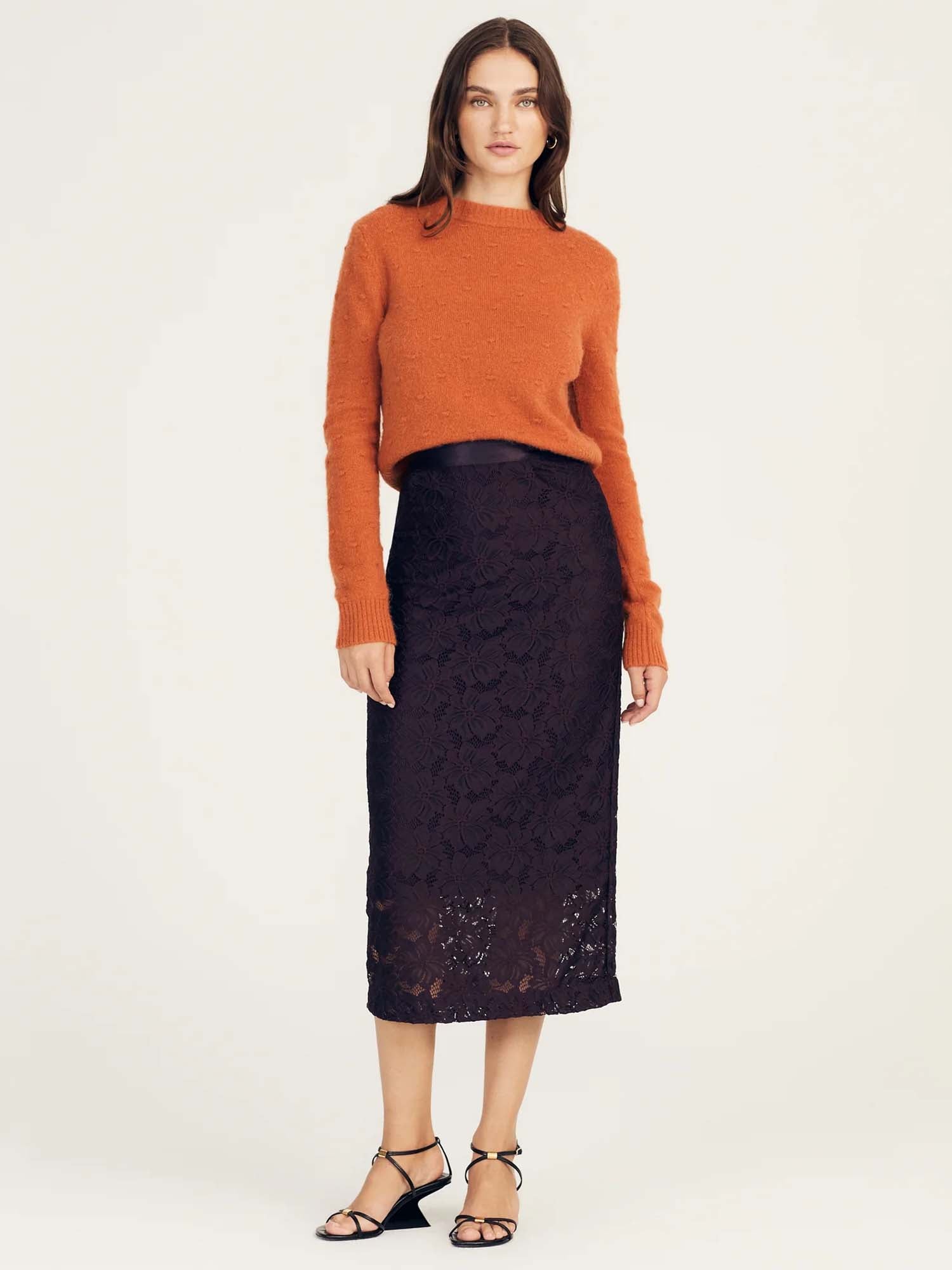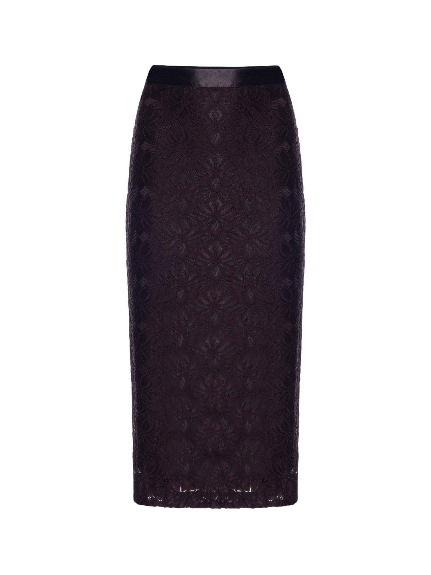 The Marjorie Pencil Skirt is a relaxed-fitting, stretch style with a decorative floral feel. It features a contrast satin waistband, partial lining, and a side zip closure. Part of a set with matching top.