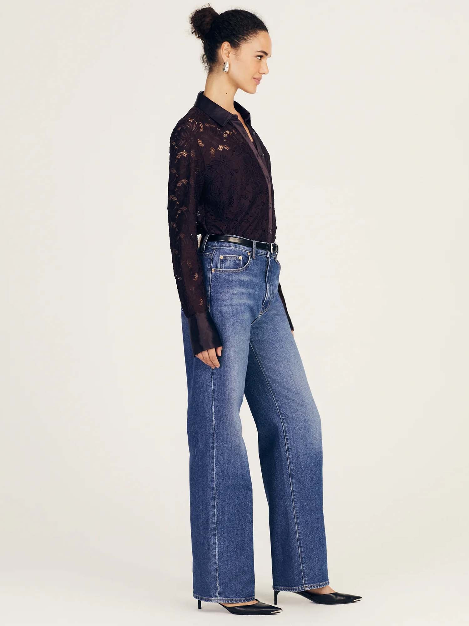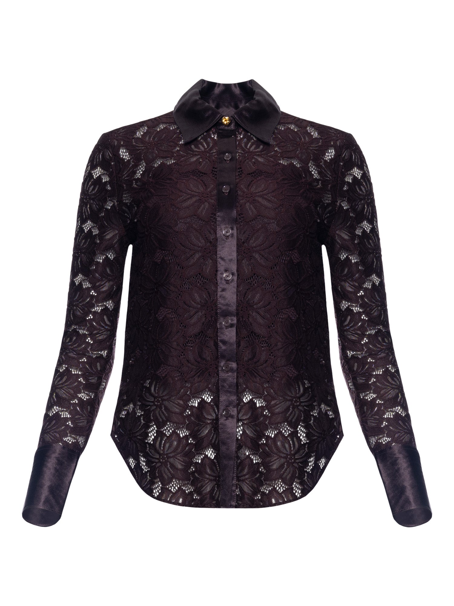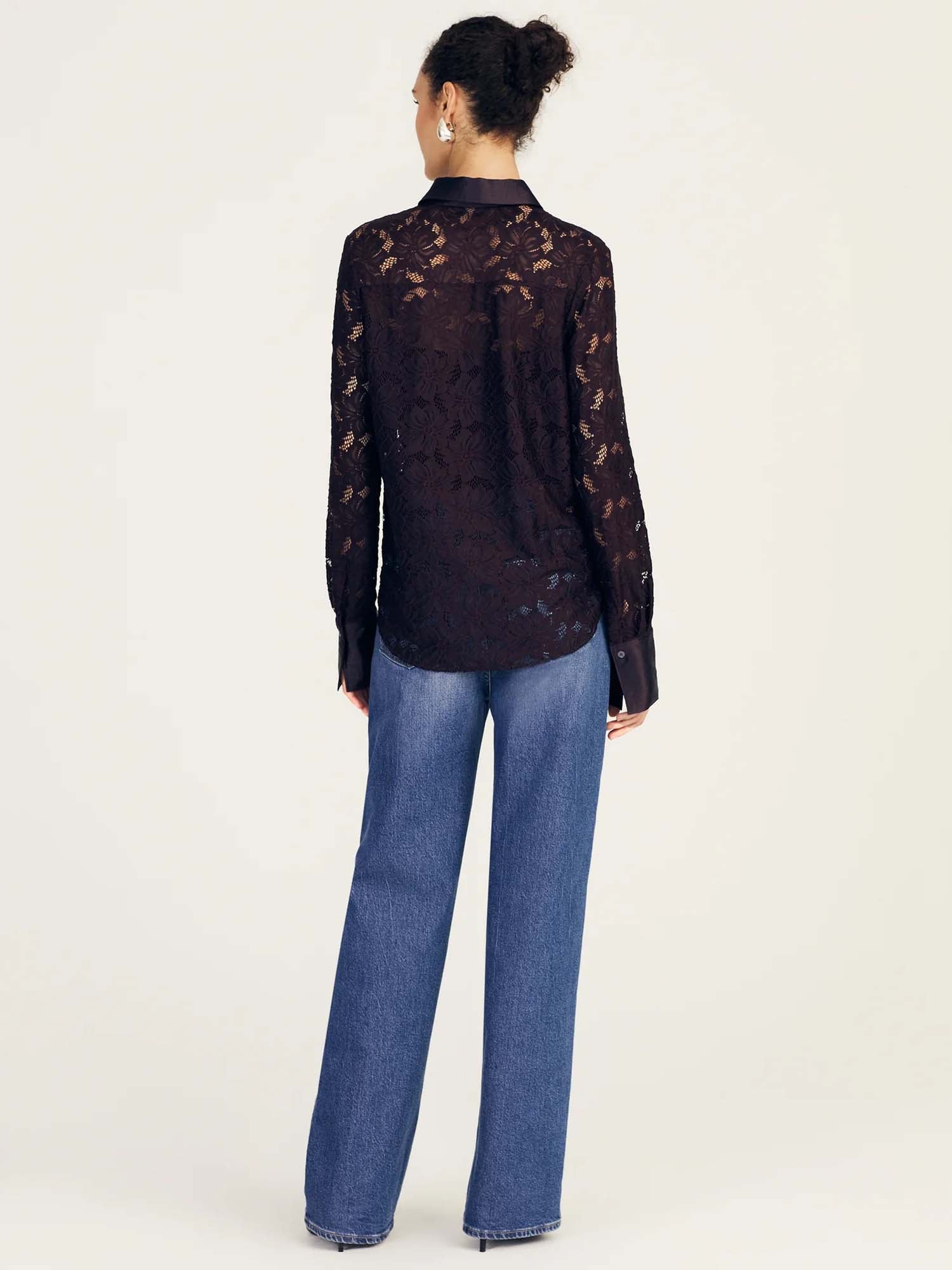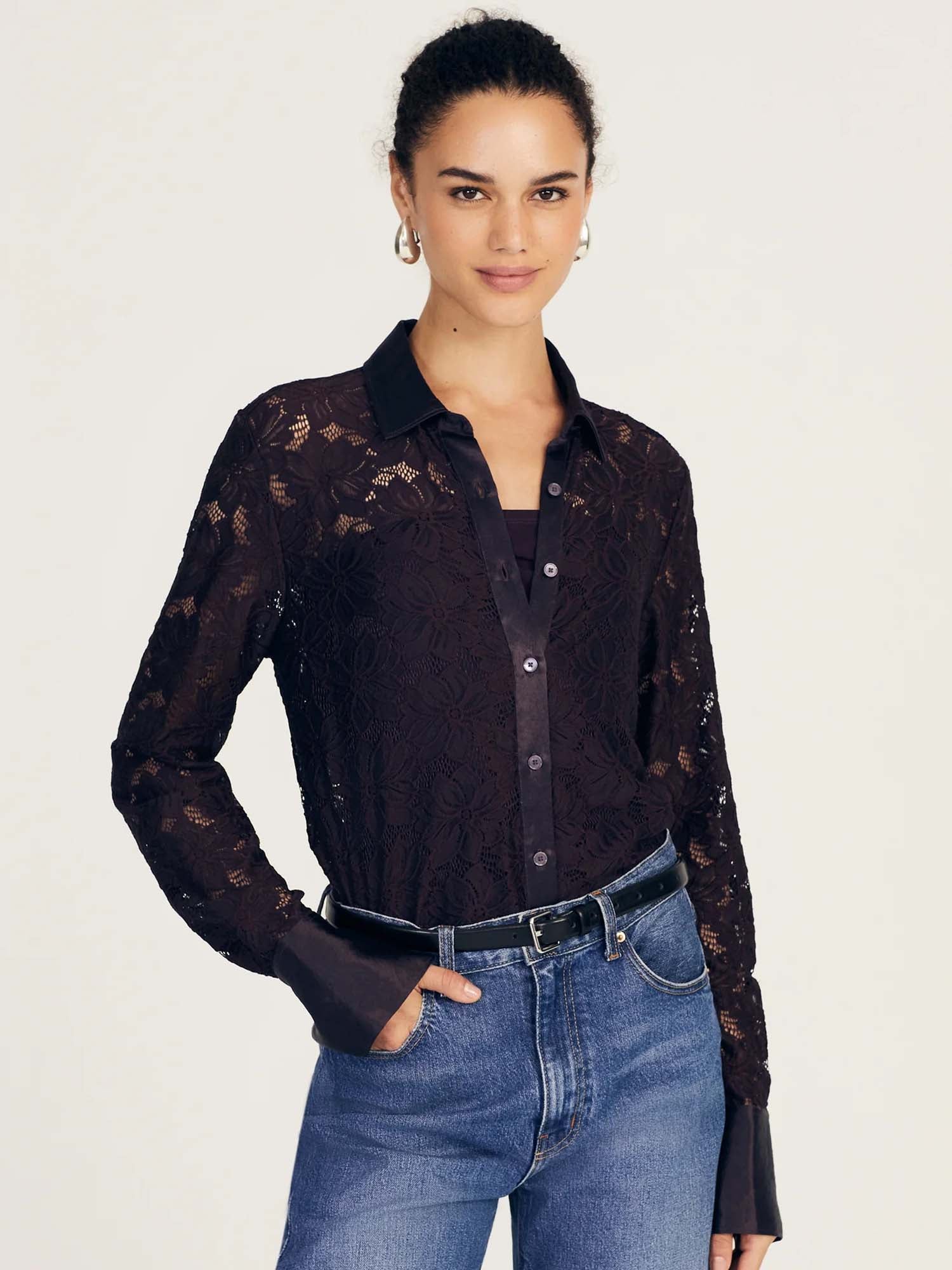 The Raissa Button Down Top is a relaxed-fitting, stretch style with a decorative floral feel. It features a contrast satin collar, placket, and cuffs with a cami lining. Part of a set with a matching skirt.