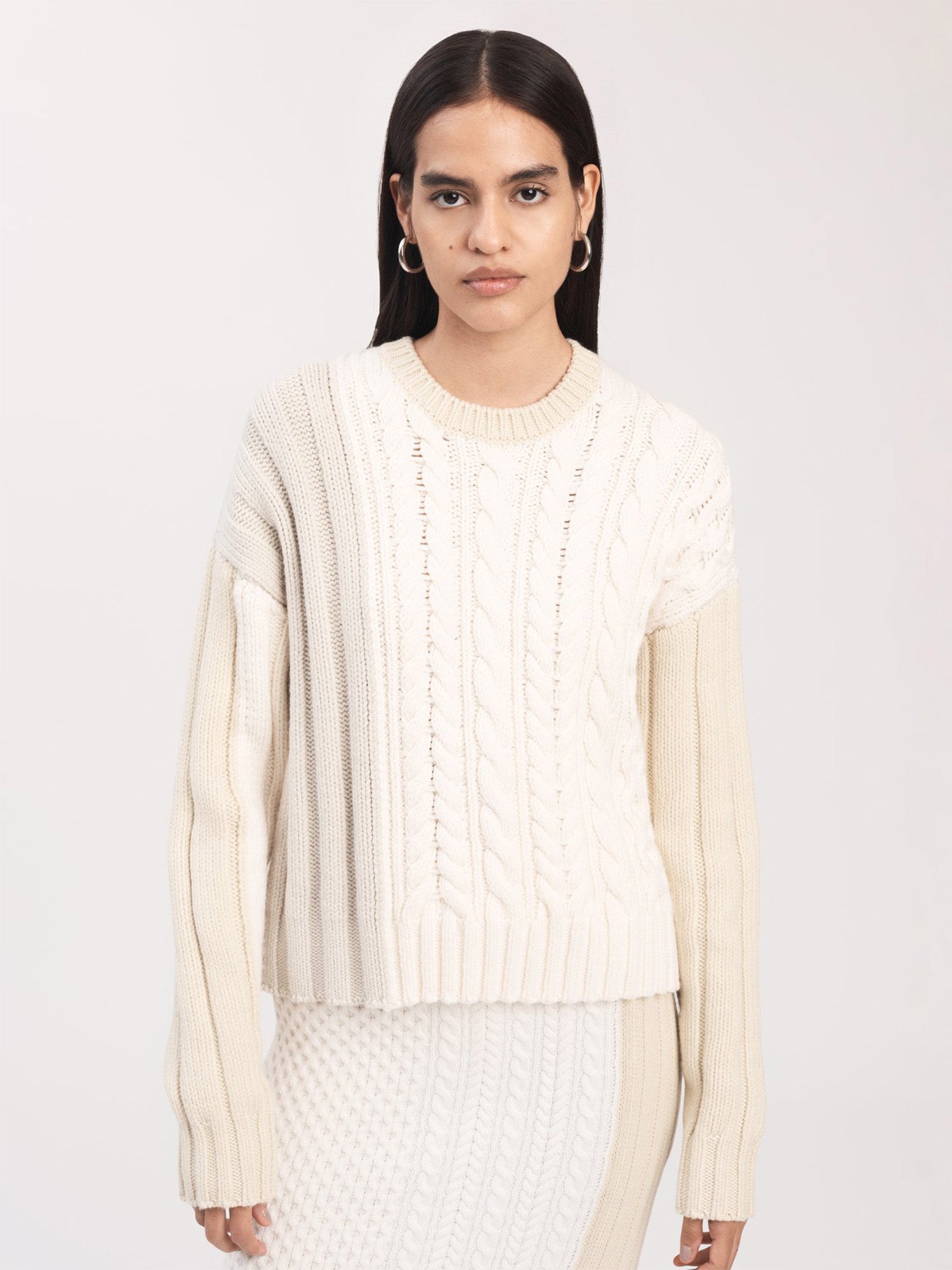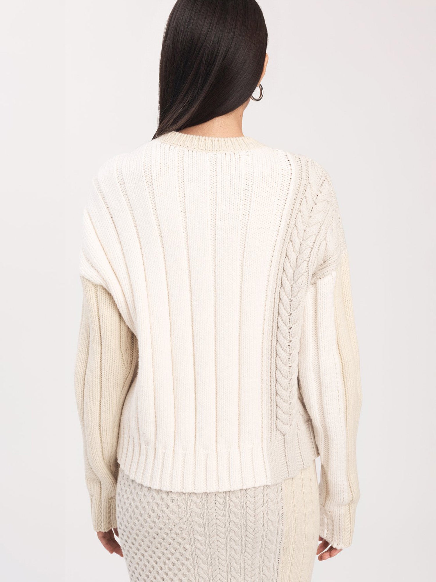The Rory Mixed Cable Knit Sweater is crafted from a soft wool in three shades of ivory. It features a ribbed crew neckline, drop shoulders, and a cozy and relaxed fit. The cable knit bodice is contrasted with various panels of ribbing. Pair with the Lexi Skirt to complete the full look.