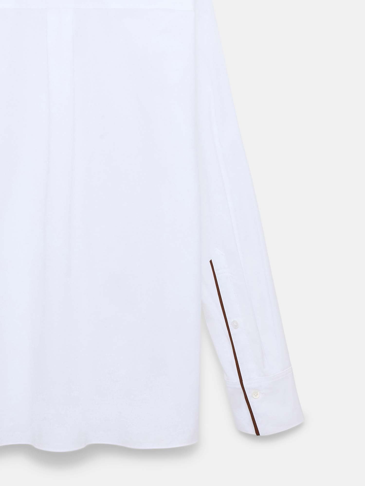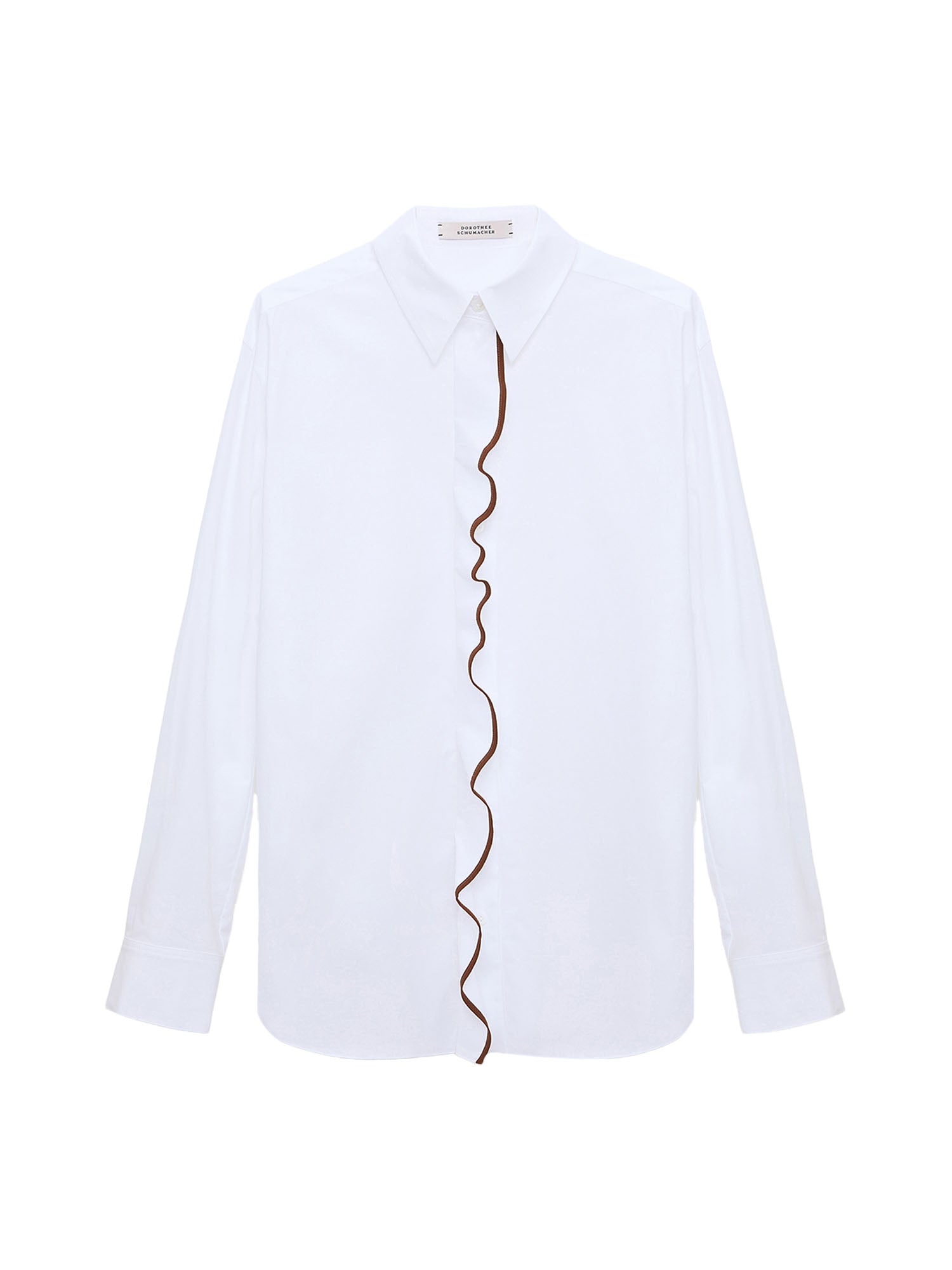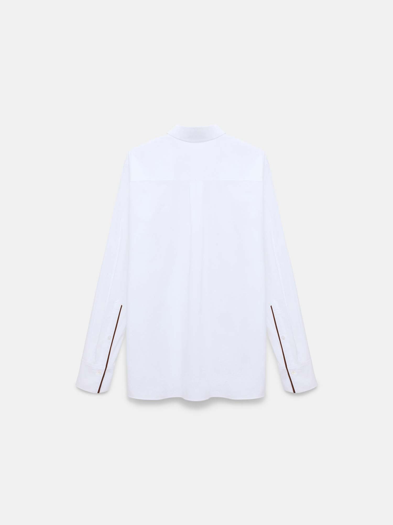 The cotton poplin shirt has a relaxed fit and features a ruffle hidden button placket with contrast piping. The shirt has button slit cuffs with contrast piping and a back yoke with a single pleat.