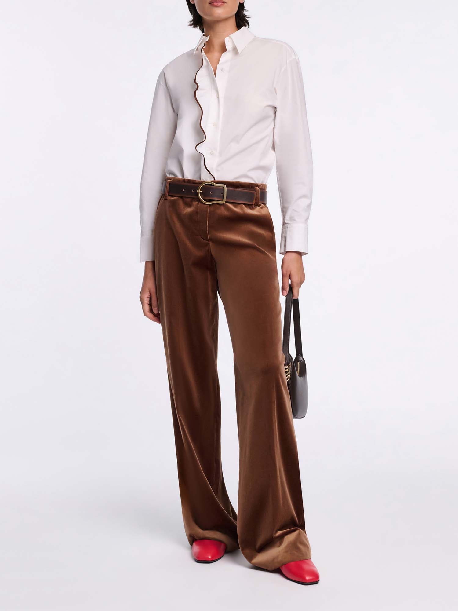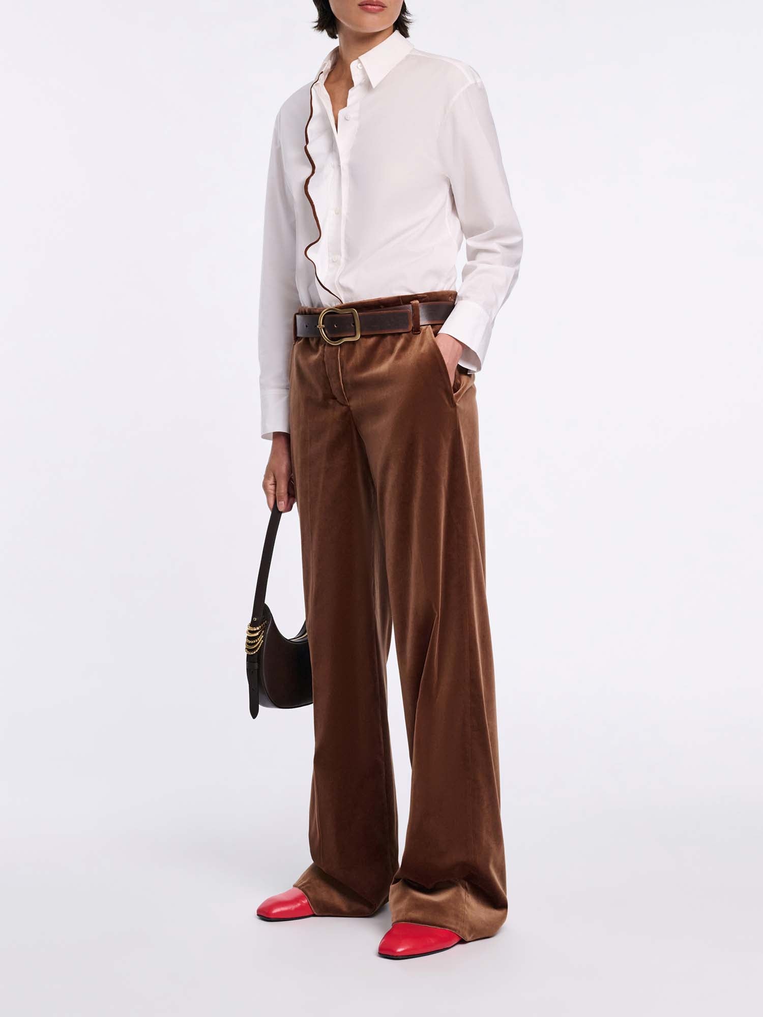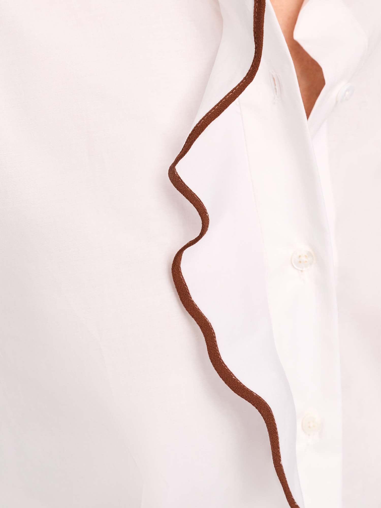 The cotton poplin shirt has a relaxed fit and features a ruffle hidden button placket with contrast piping. The shirt has button slit cuffs with contrast piping and a back yoke with a single pleat.