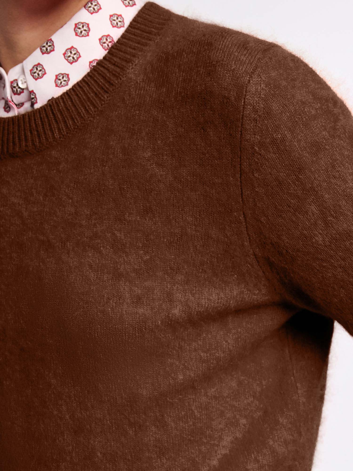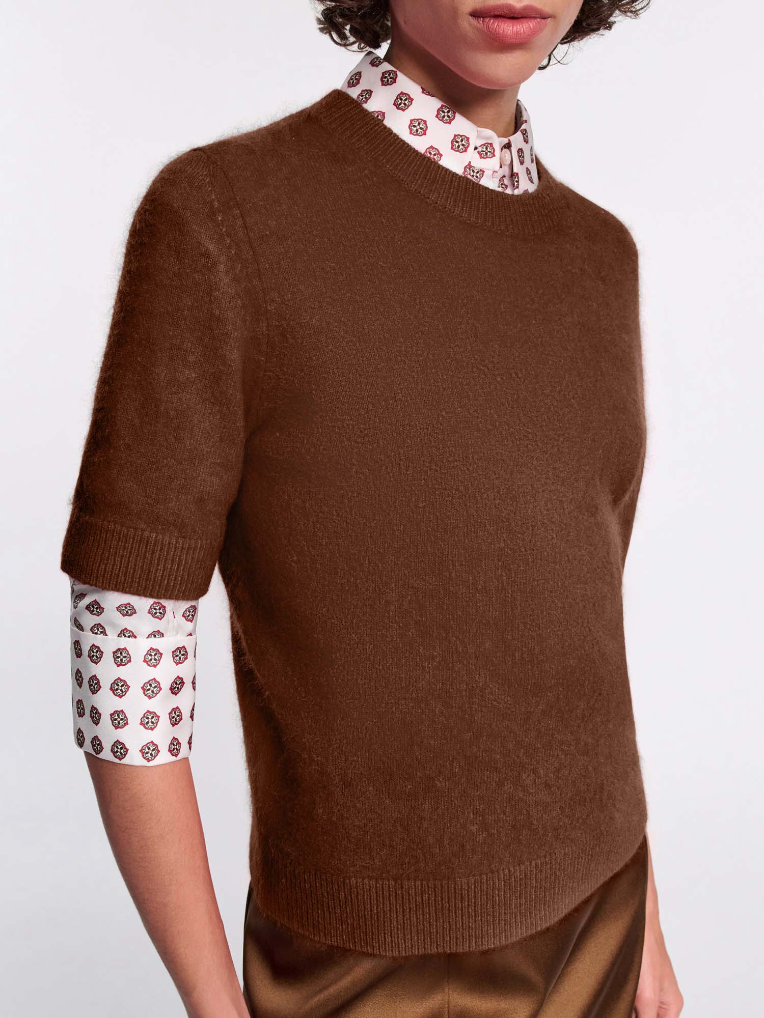 Cozy comes to mind: The short sleeve pullover has a round neckline and is knit in a soft cashmere-Merino wool mix. Our fluffy wash gives the loosely fitted style an extra soft feel.