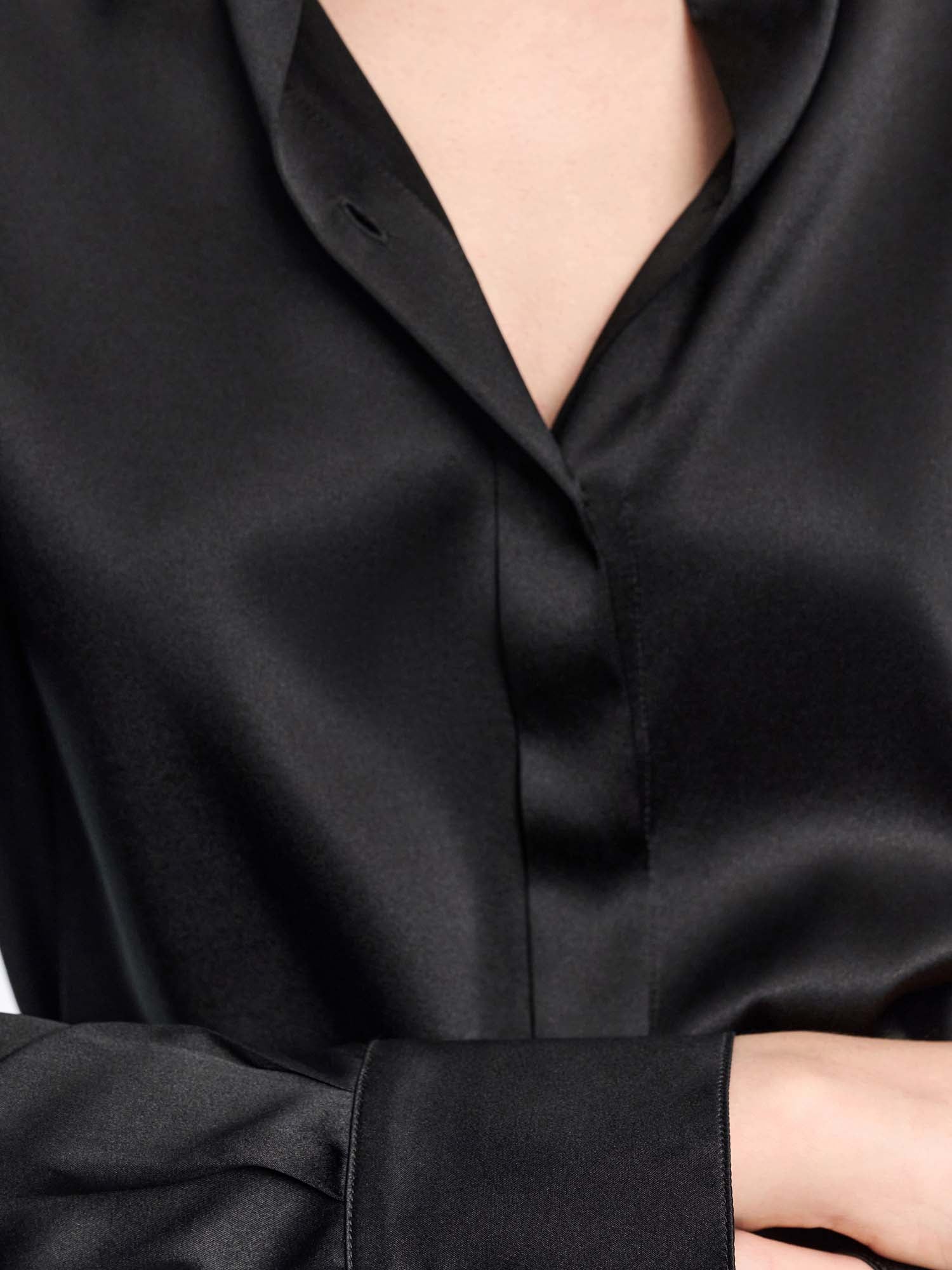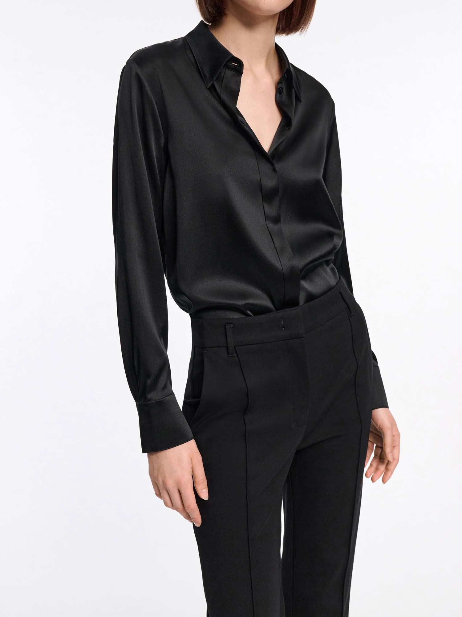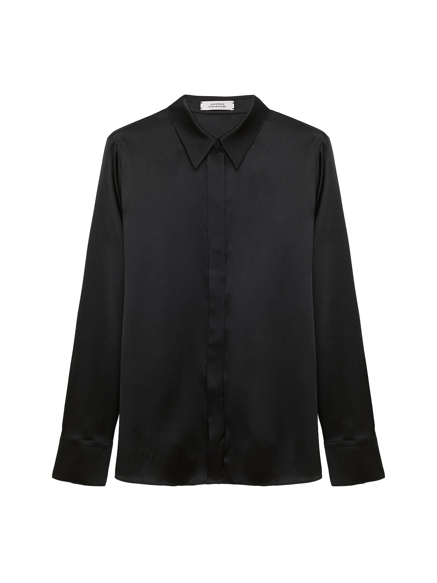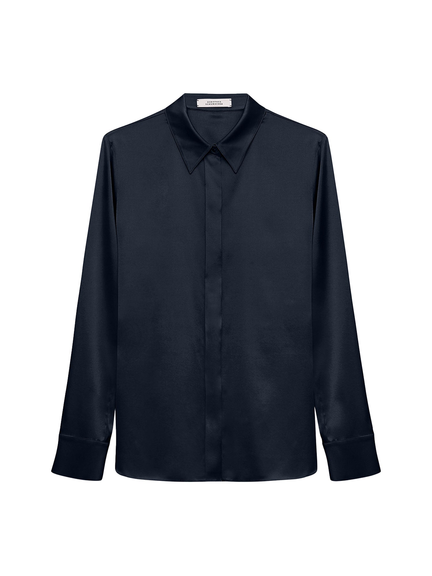 The blouse is made from stretch silk satin and is fitted. The essential style has a classic collar and side slits.