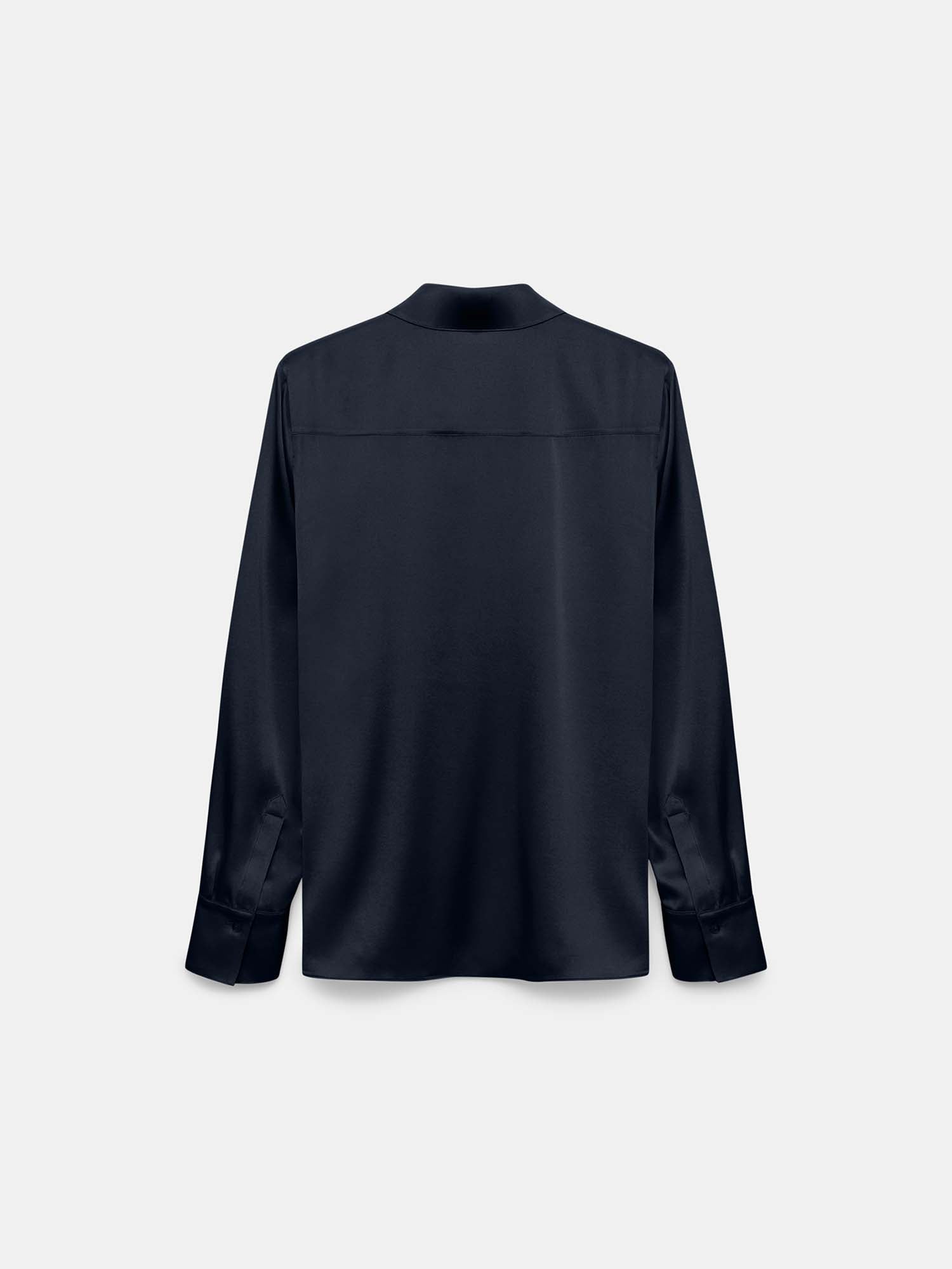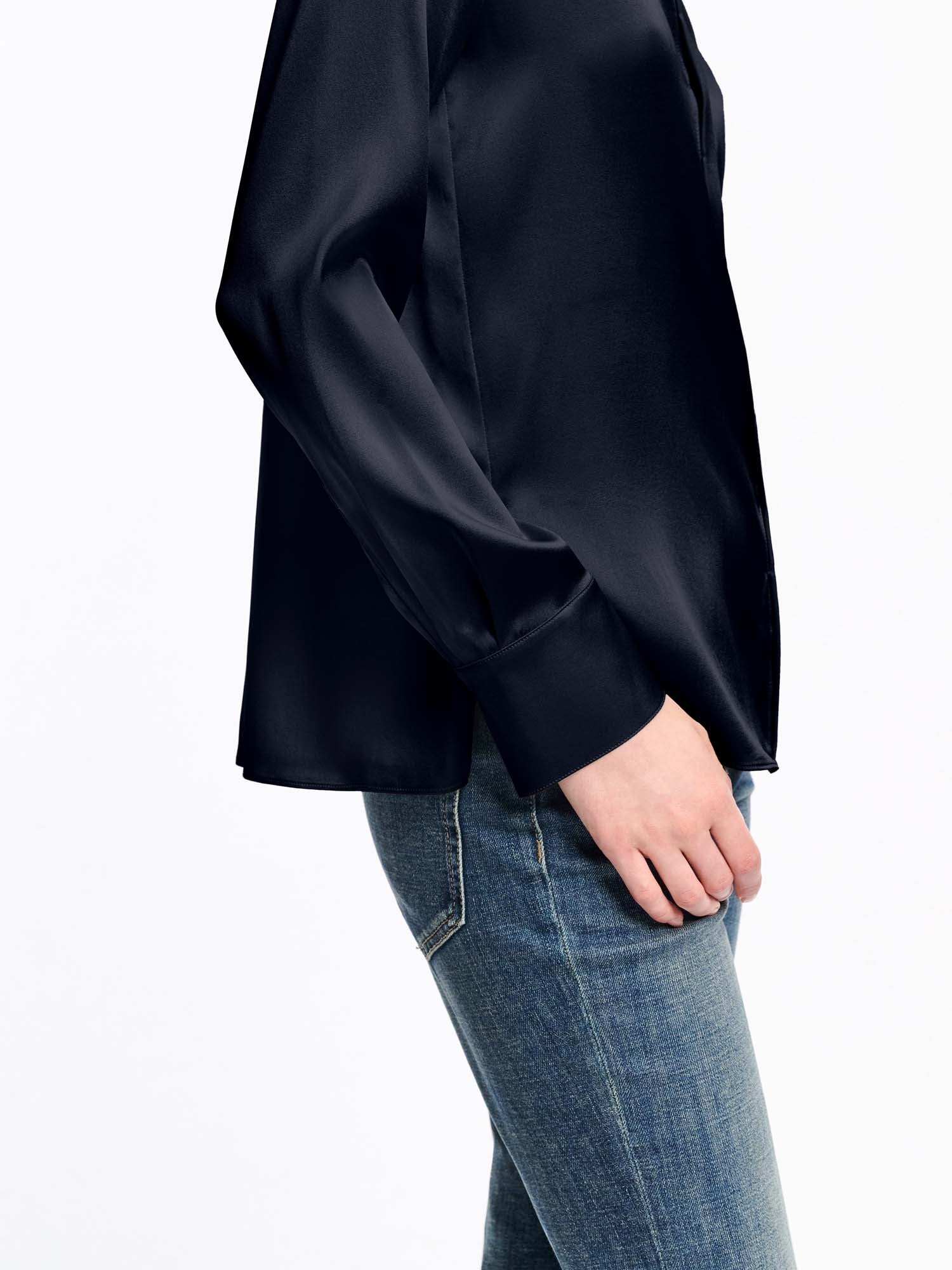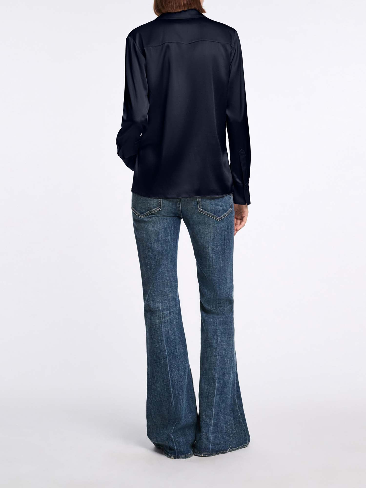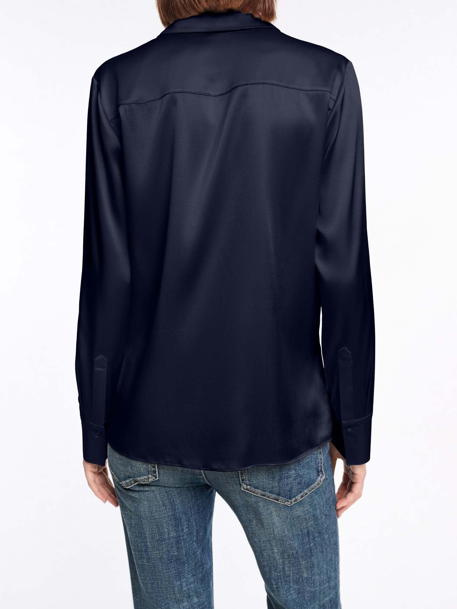 The blouse is made from stretch silk satin and is fitted. The essential style has a classic collar and side slits.