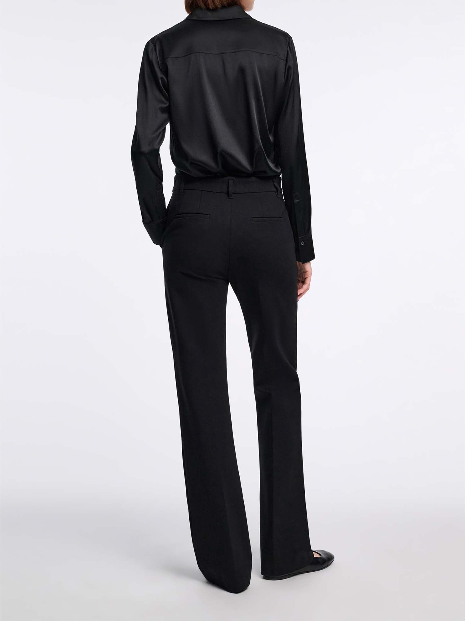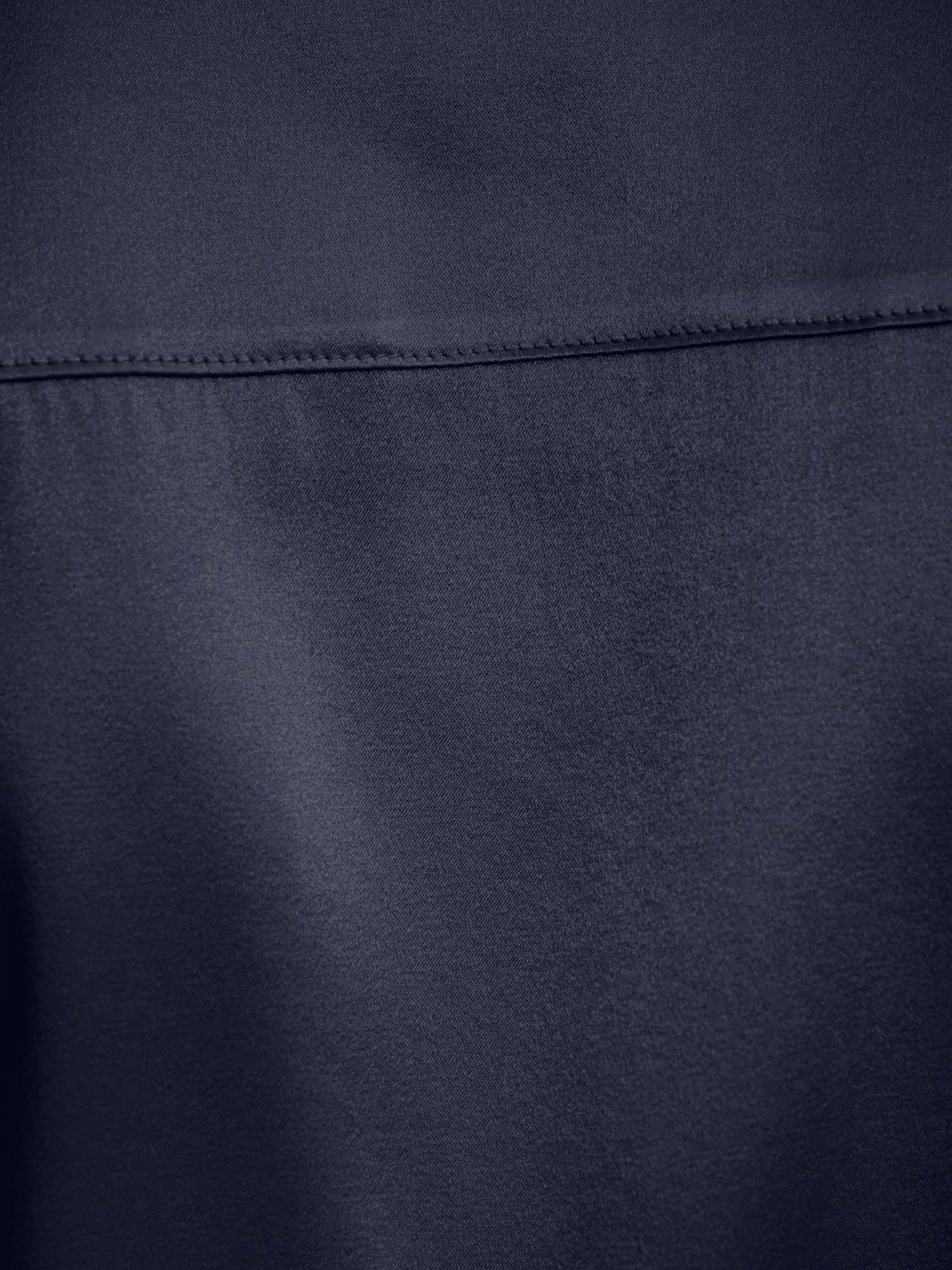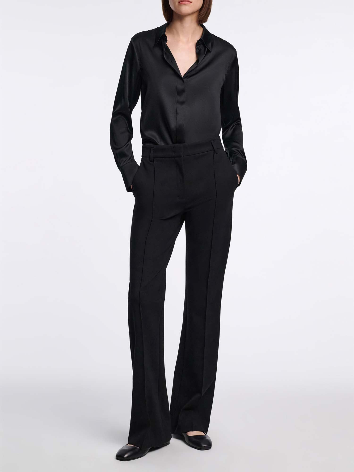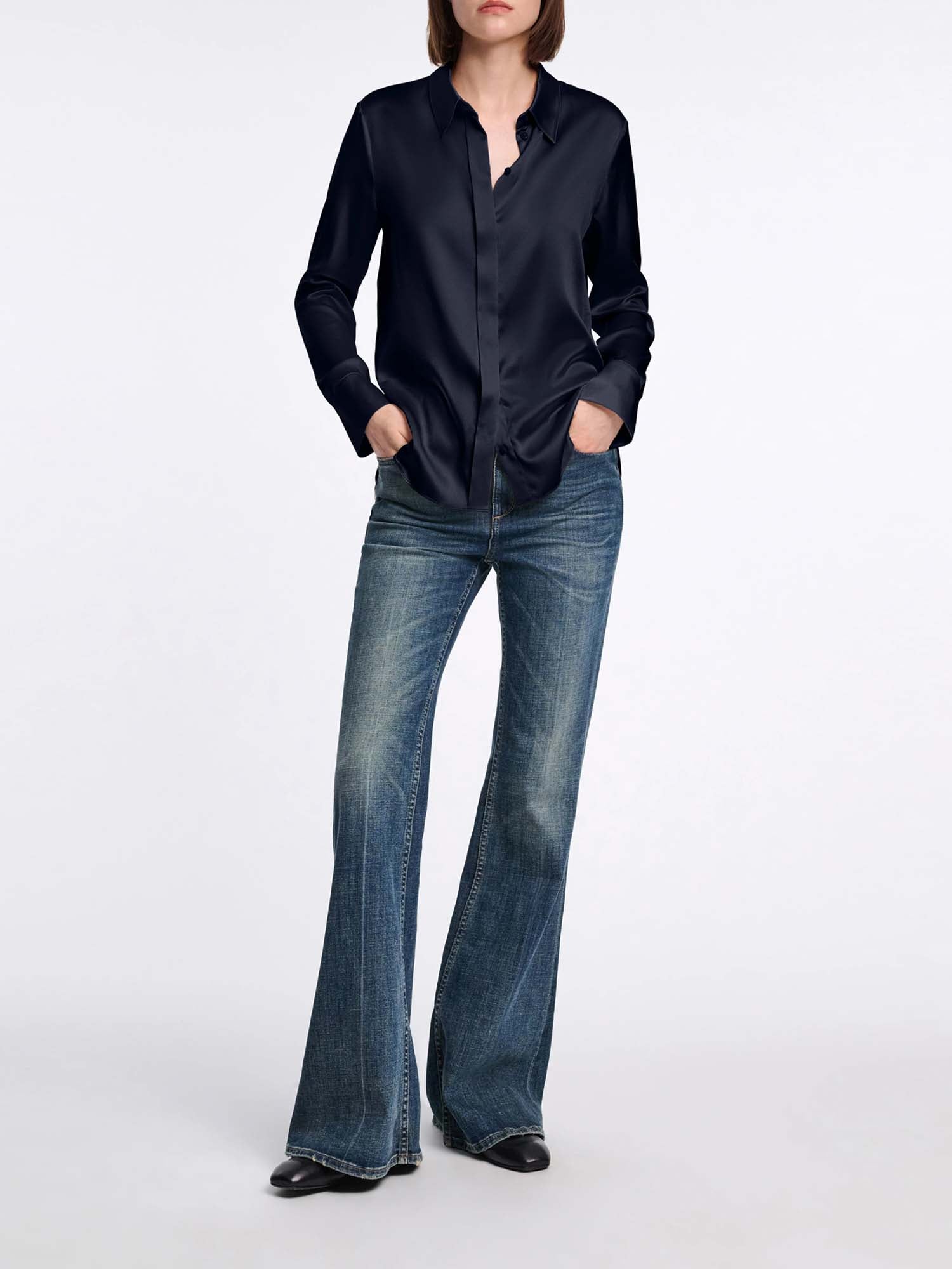 The blouse is made from stretch silk satin and is fitted. The essential style has a classic collar and side slits.