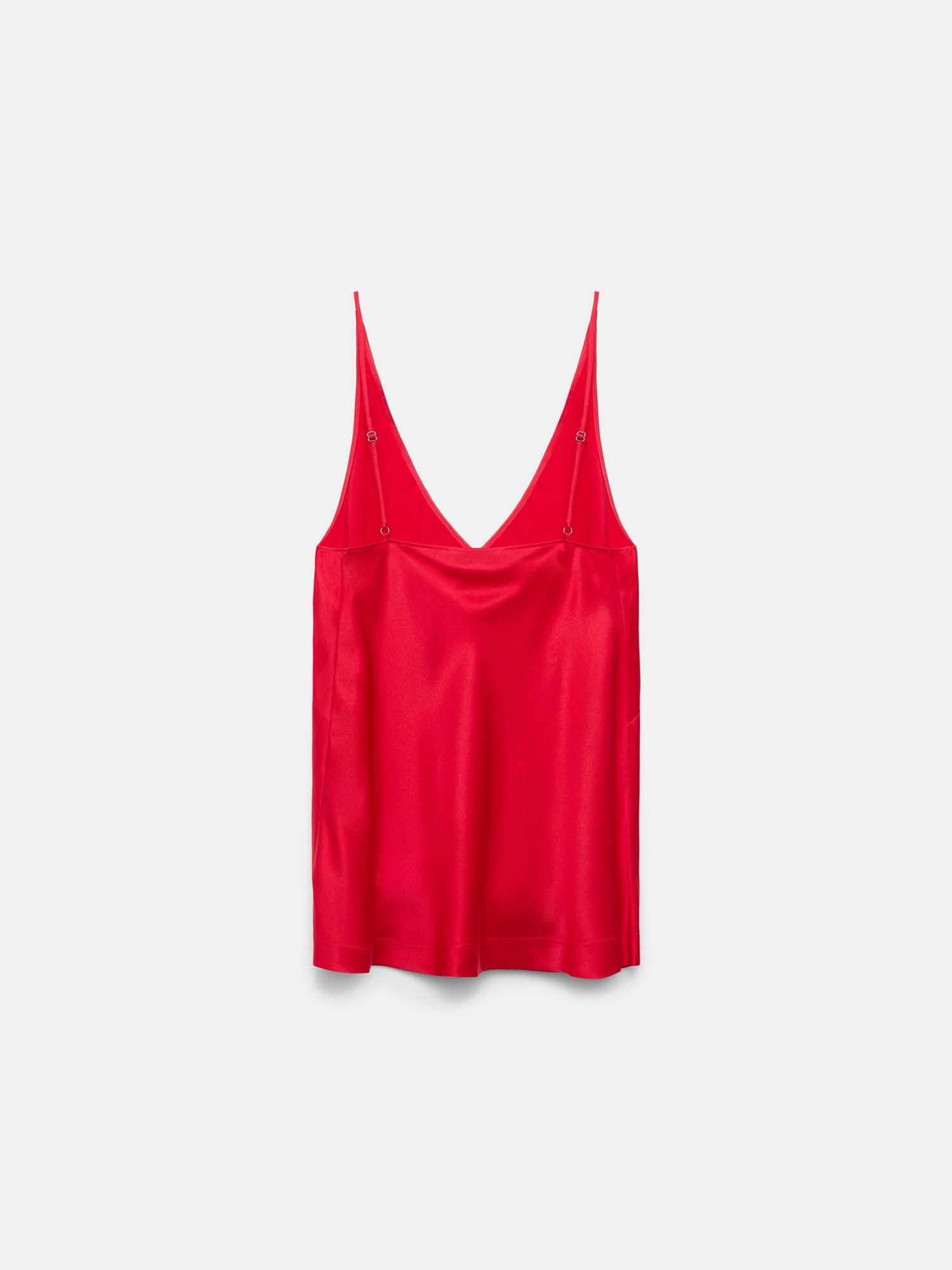 The bias-cut tank top is styled in a bright shade of red silk satin. The top has a V-neckline, which tapers into thin, adjustable straps.