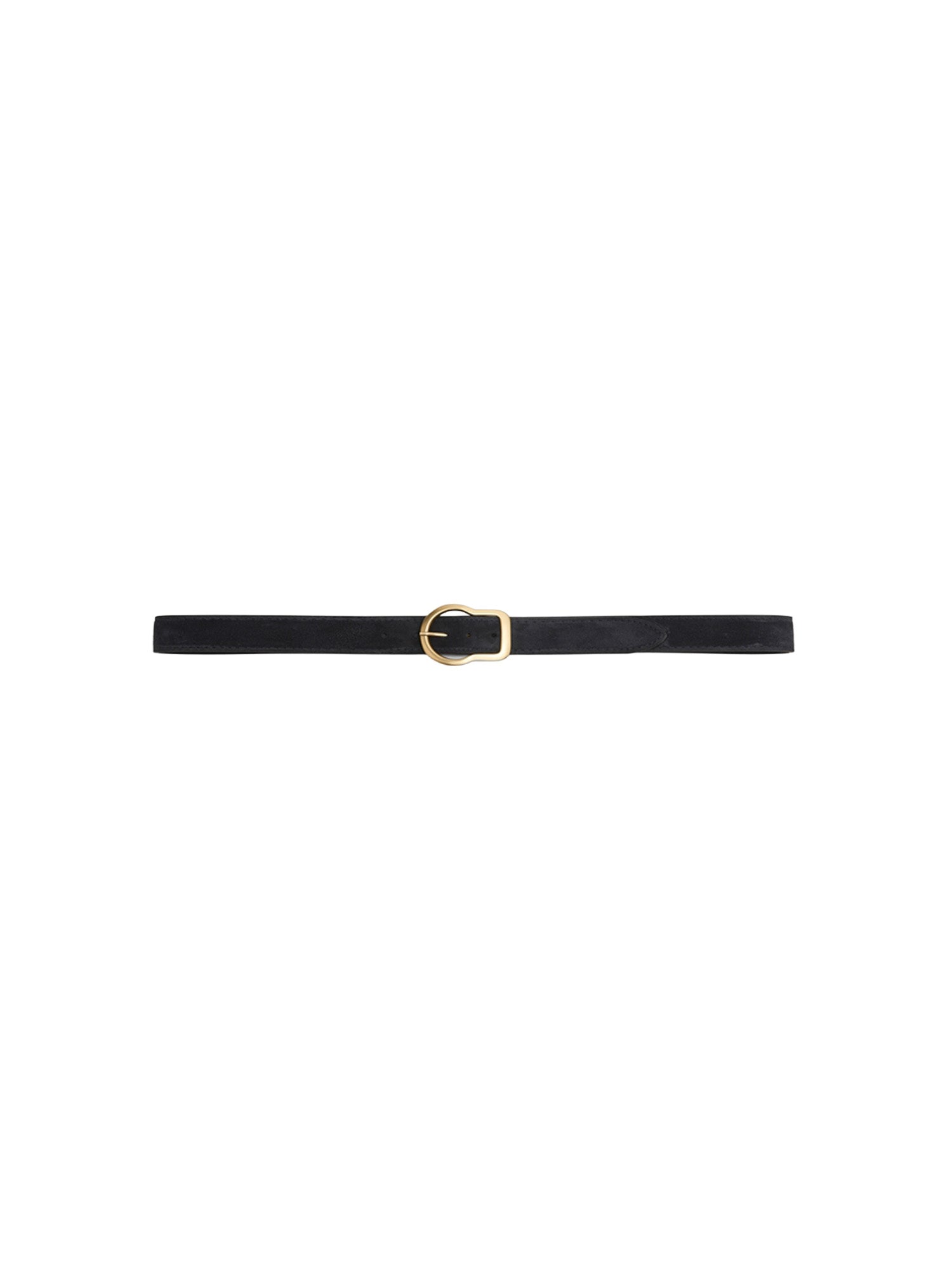 The 2 cm belt is crafted in calf suede and has a gold-tone signature buckle.