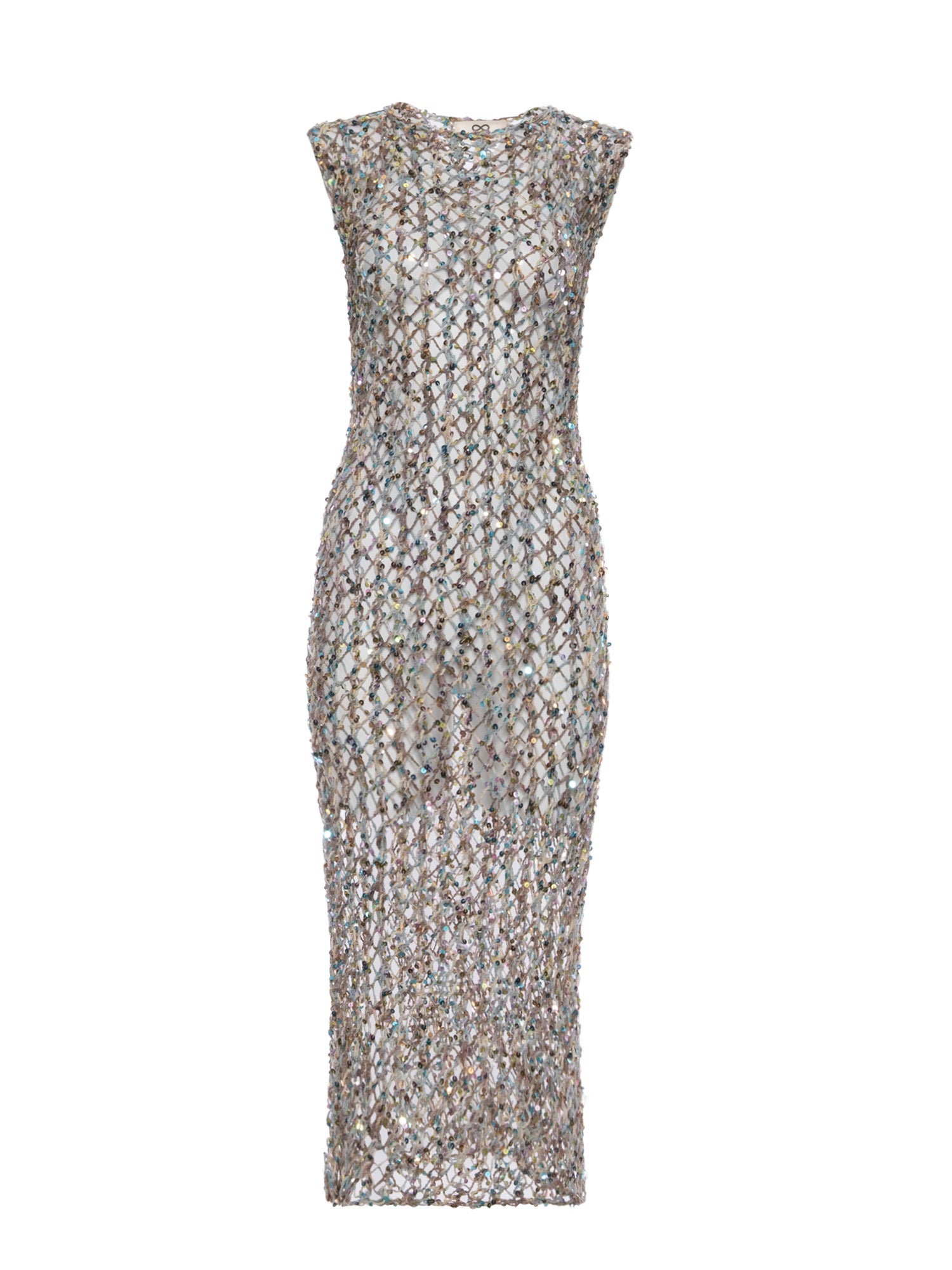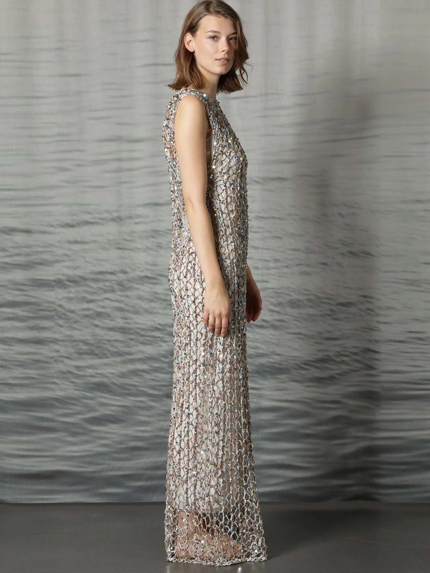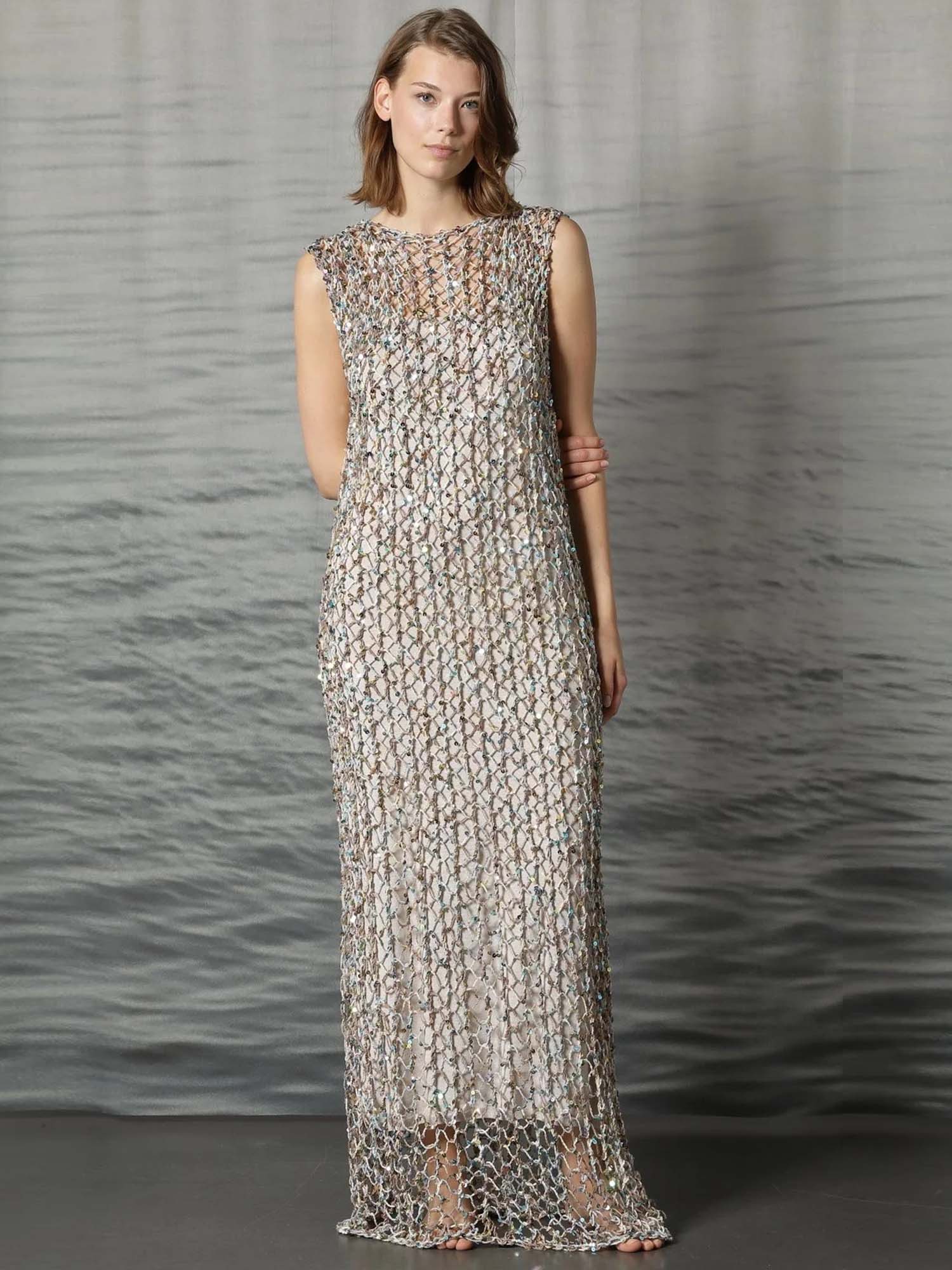 A floor-length net crochet dress crafted from pure cotton and traced with delicate sequins for soft, light-catching texture. The openwork silhouette feels airy yet refined, striking a balance between effortless elegance and modern allure.