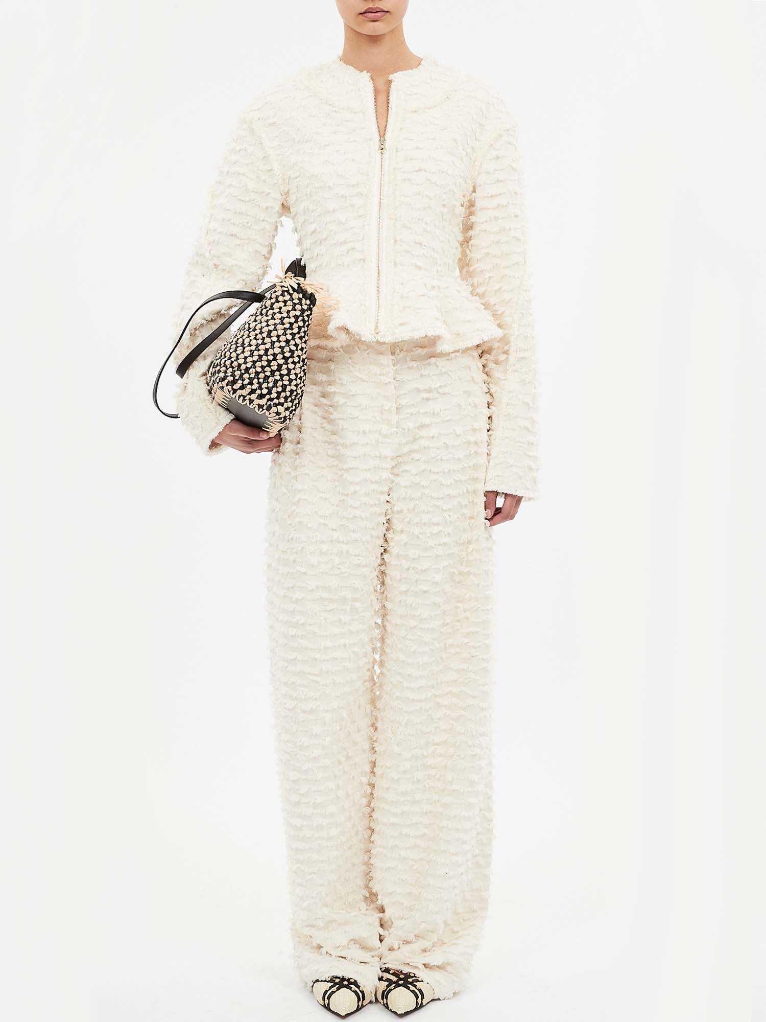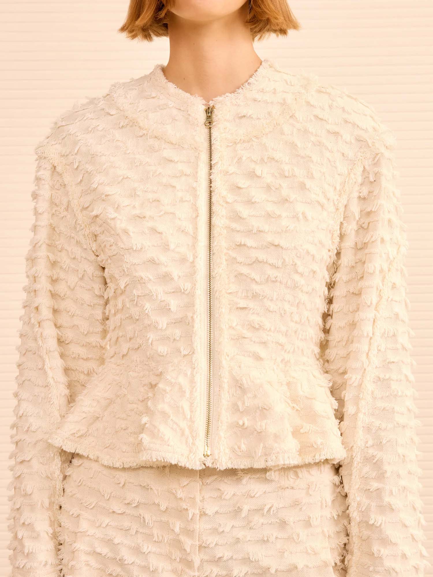 Artfully refined, the Rosalind Jacket is tailored from cotton twill with fil coupé threads that create a fringed checked motif. This textured, white jacket is streamlined and elegant with a collarless neckline and a peplum hem.