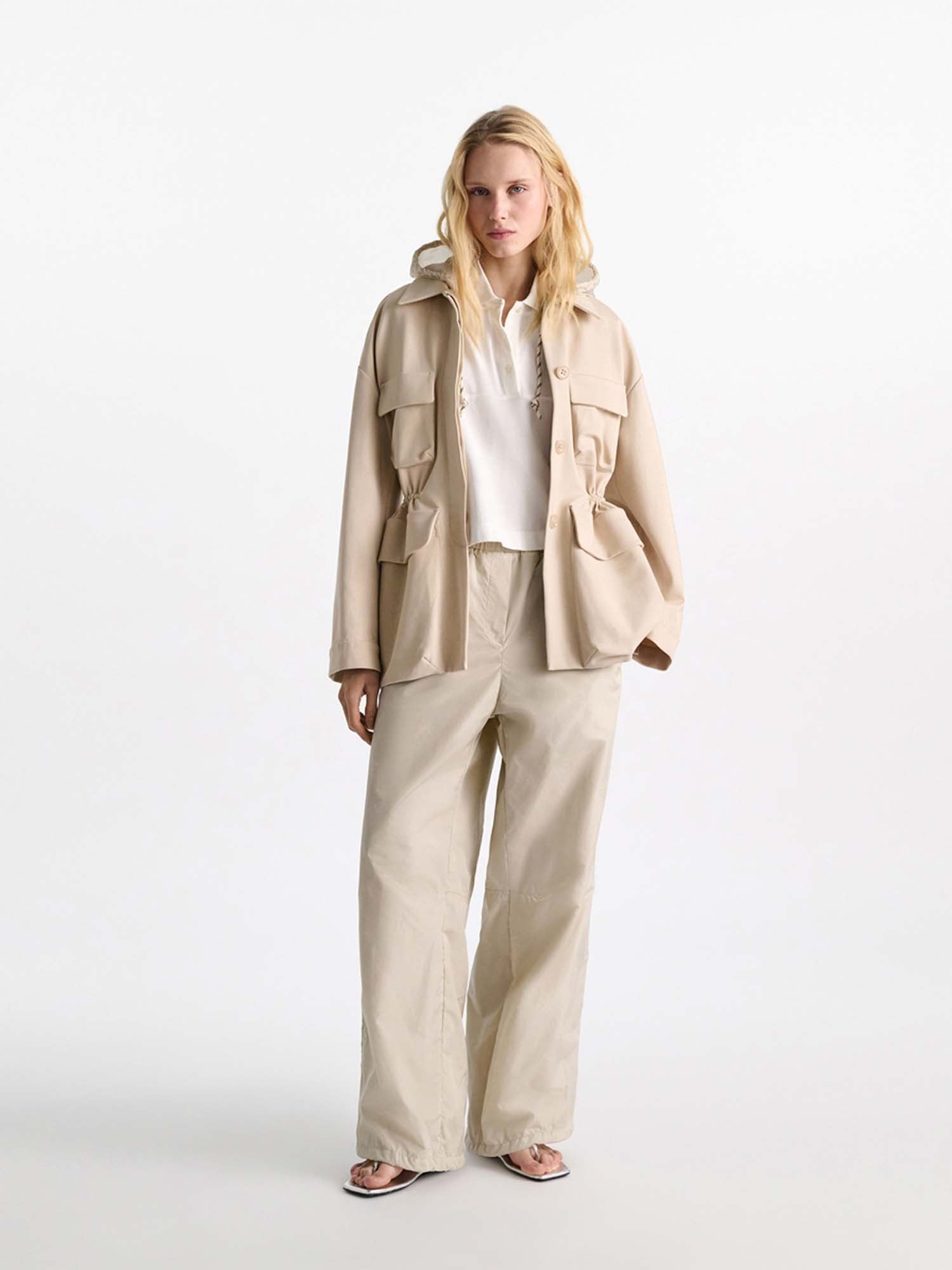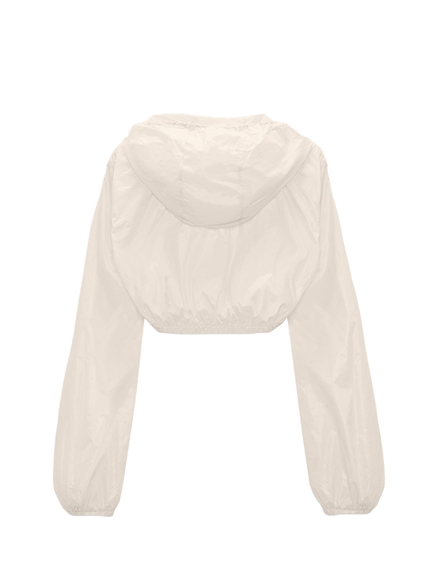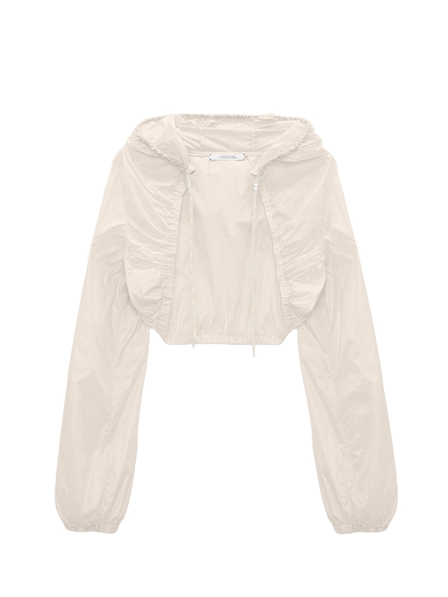 The sporty shrug is made from nylon and has a drawstring hood with signature hardware. The cropped silhouette is ideal for layering and has a ruffle-trimmed front panel.