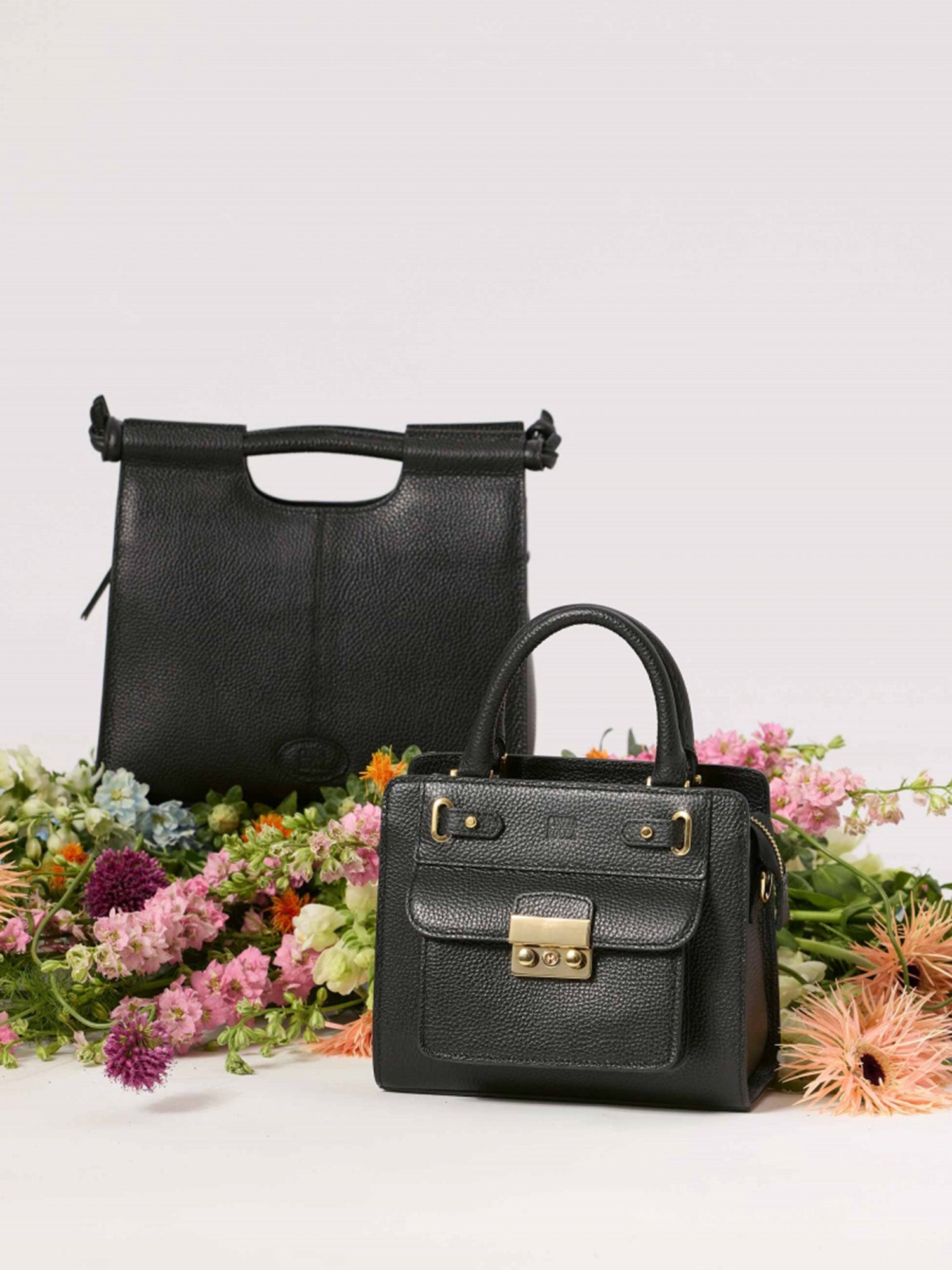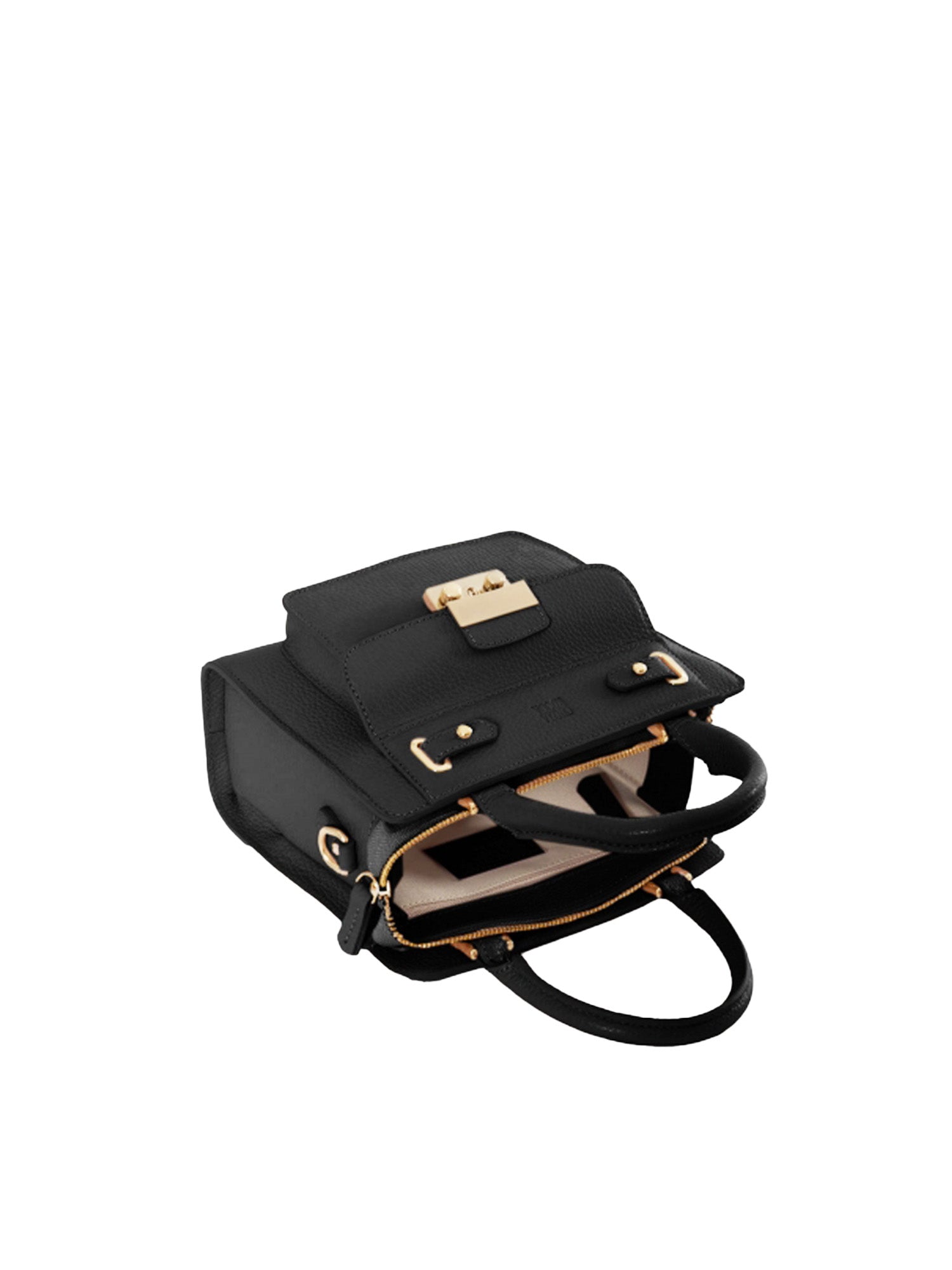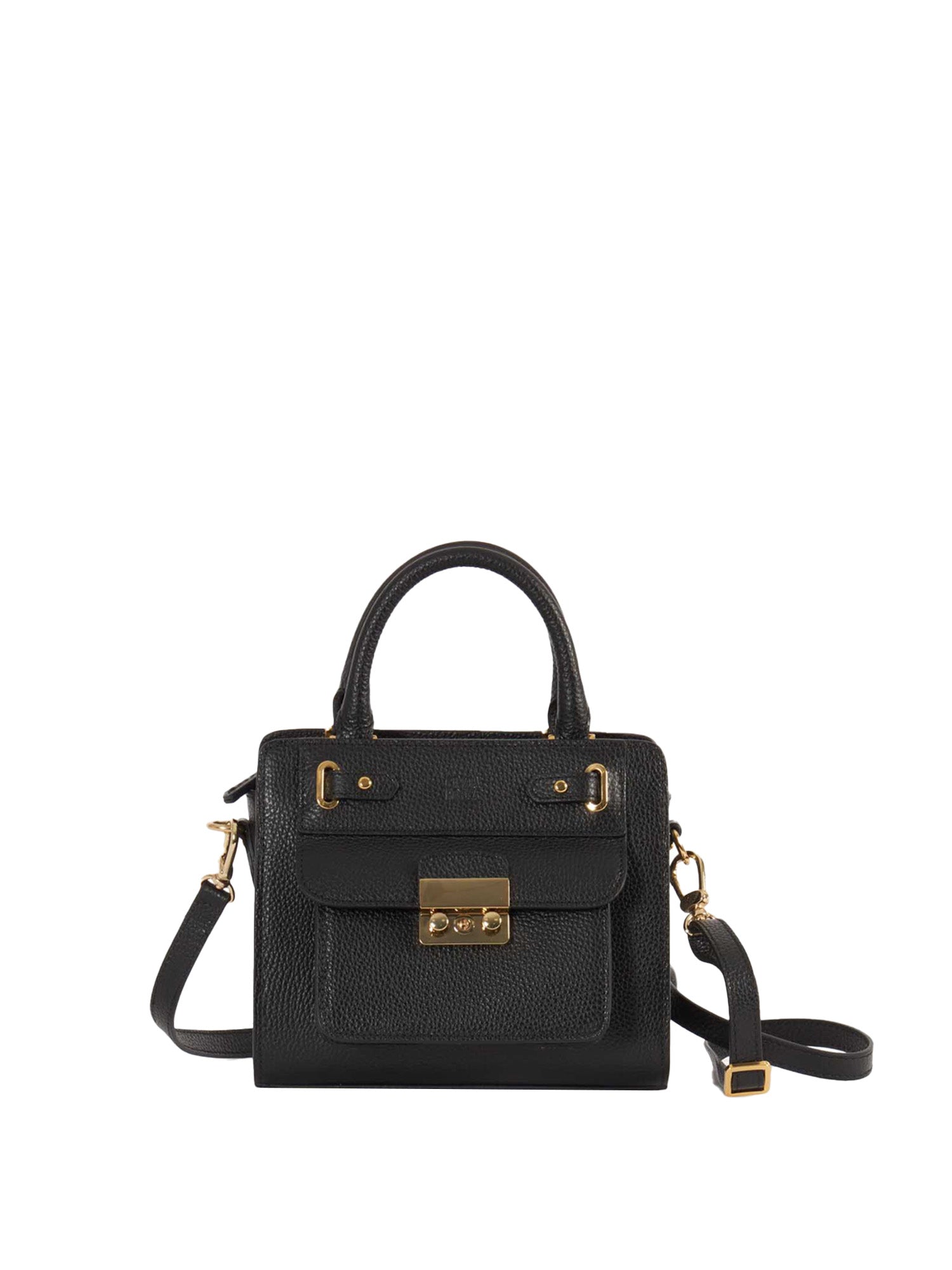 A rigid mini leather bag defined by a structured shape and polished metal clasp. Designed with top handles and a detachable, adjustable strap, it’s finished with the embossed Cinzia Rocca logo and multiple pockets for refined organization.