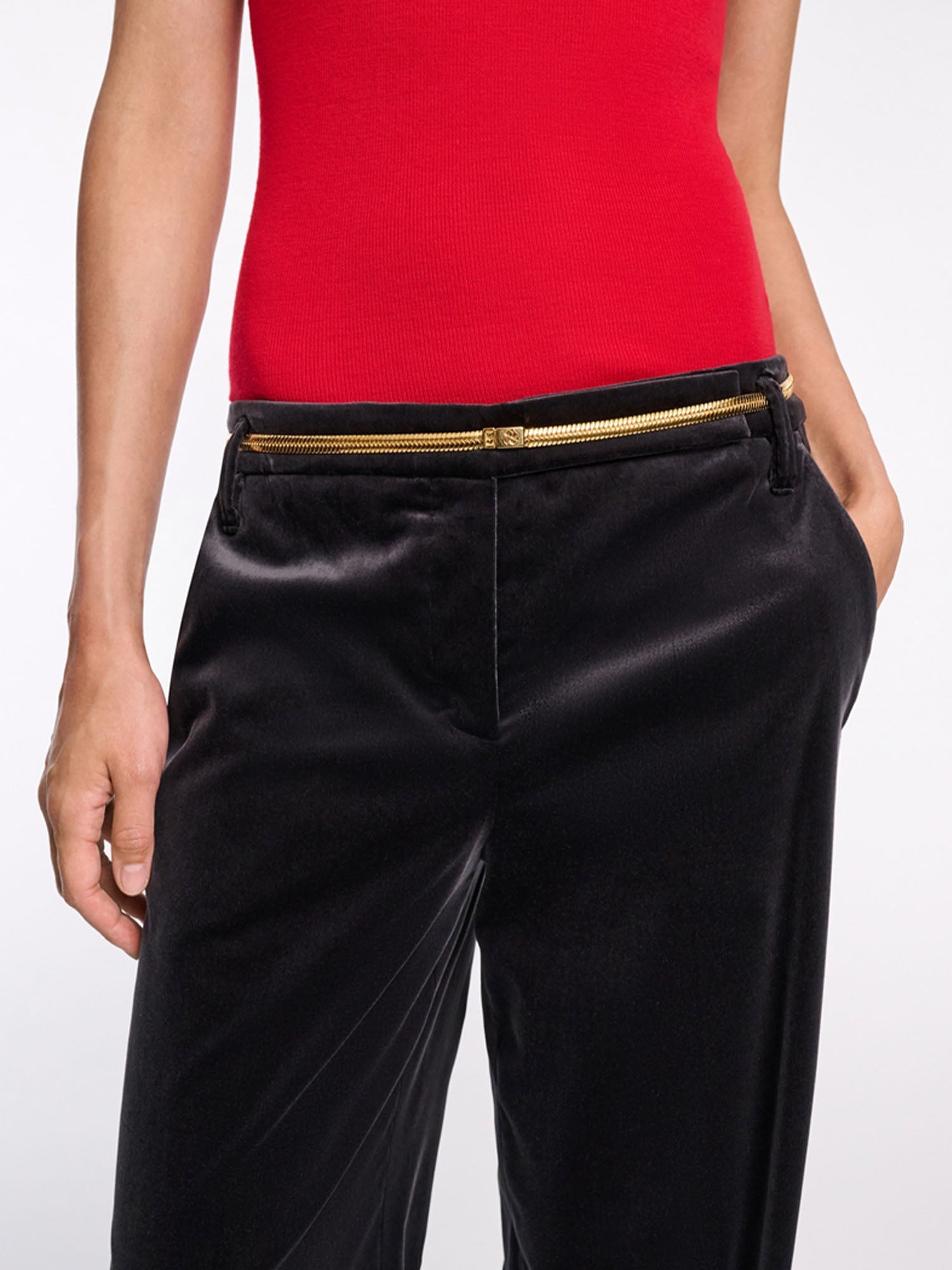 The snake chain belt has a gold-tone finish and closes with a D-rose engraved clip.