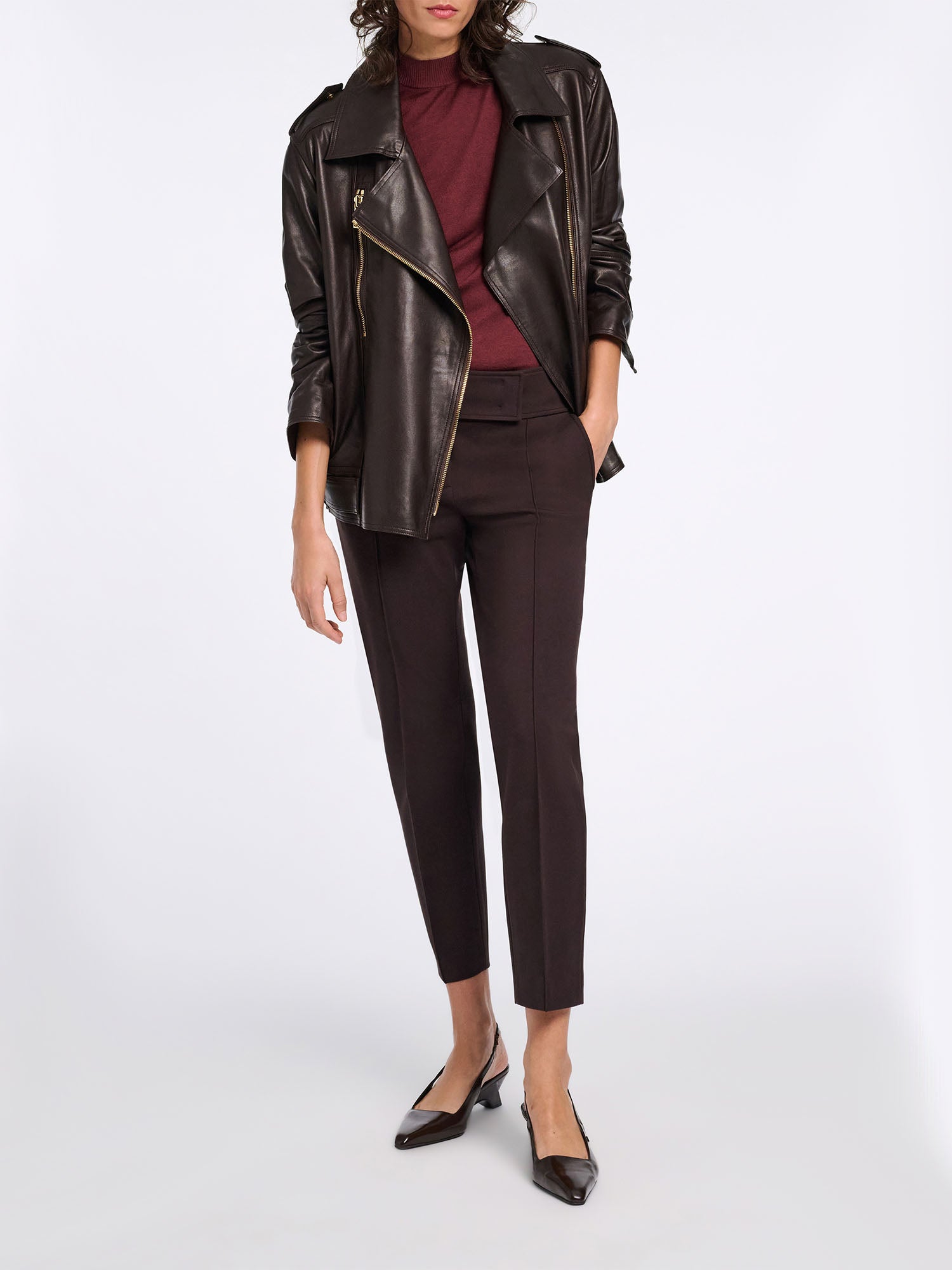 Coloured in a rich shade of espresso, the Punto Milano cigarette pants channel a key colourway of the collection. The pants have a wide waistband and a slightly cropped leg. The pants can be paired with a matching blazer for a suit look.