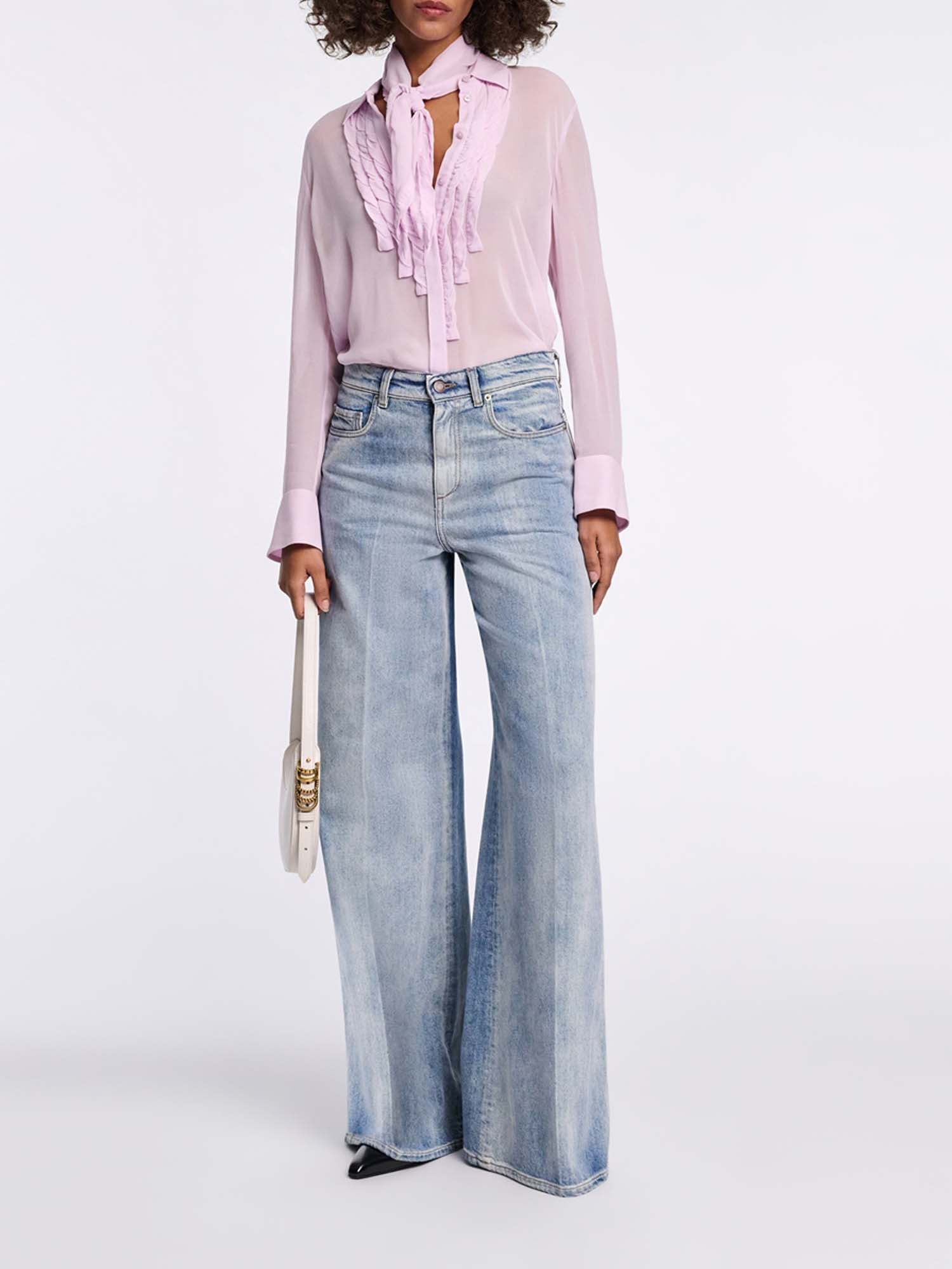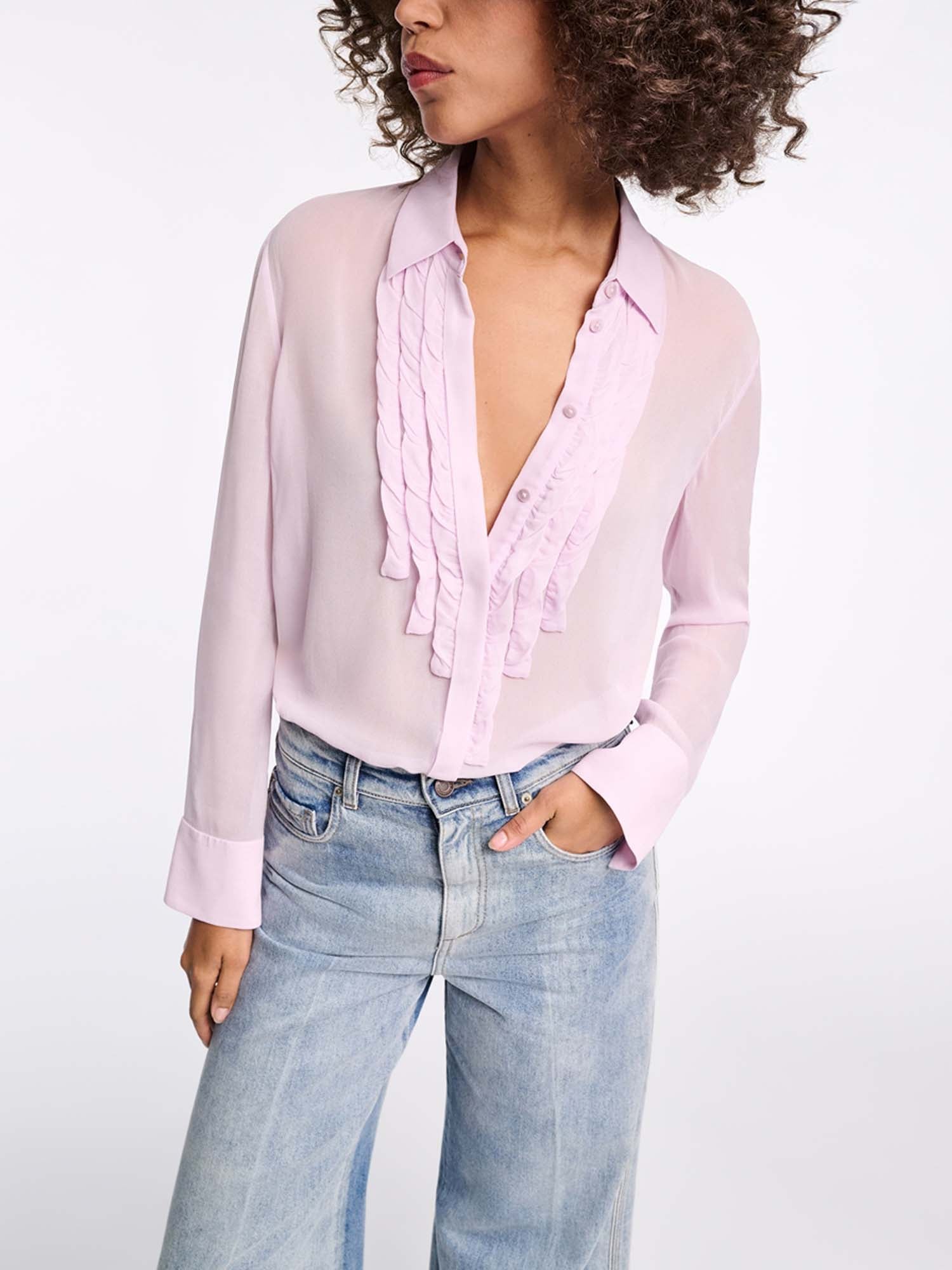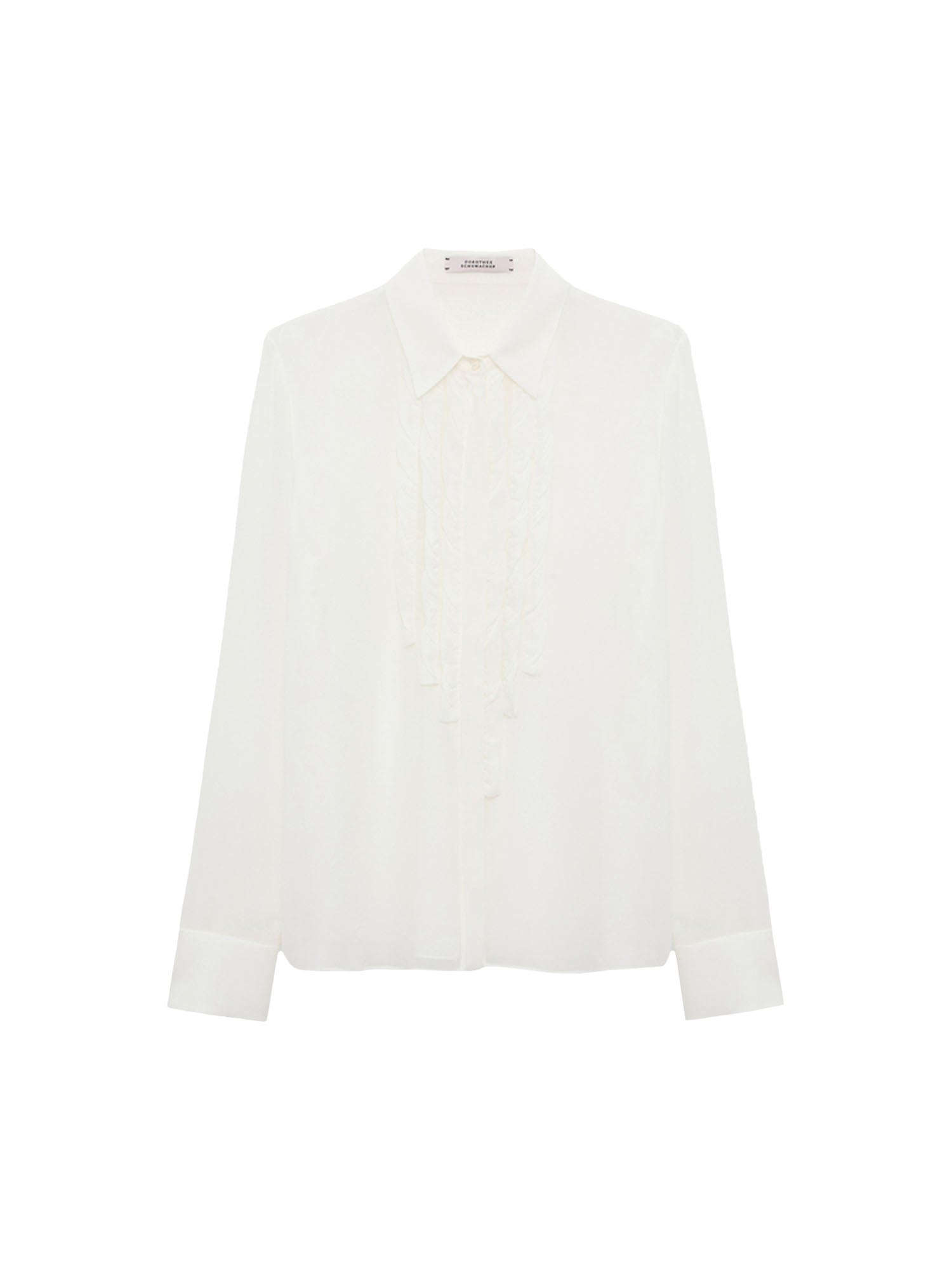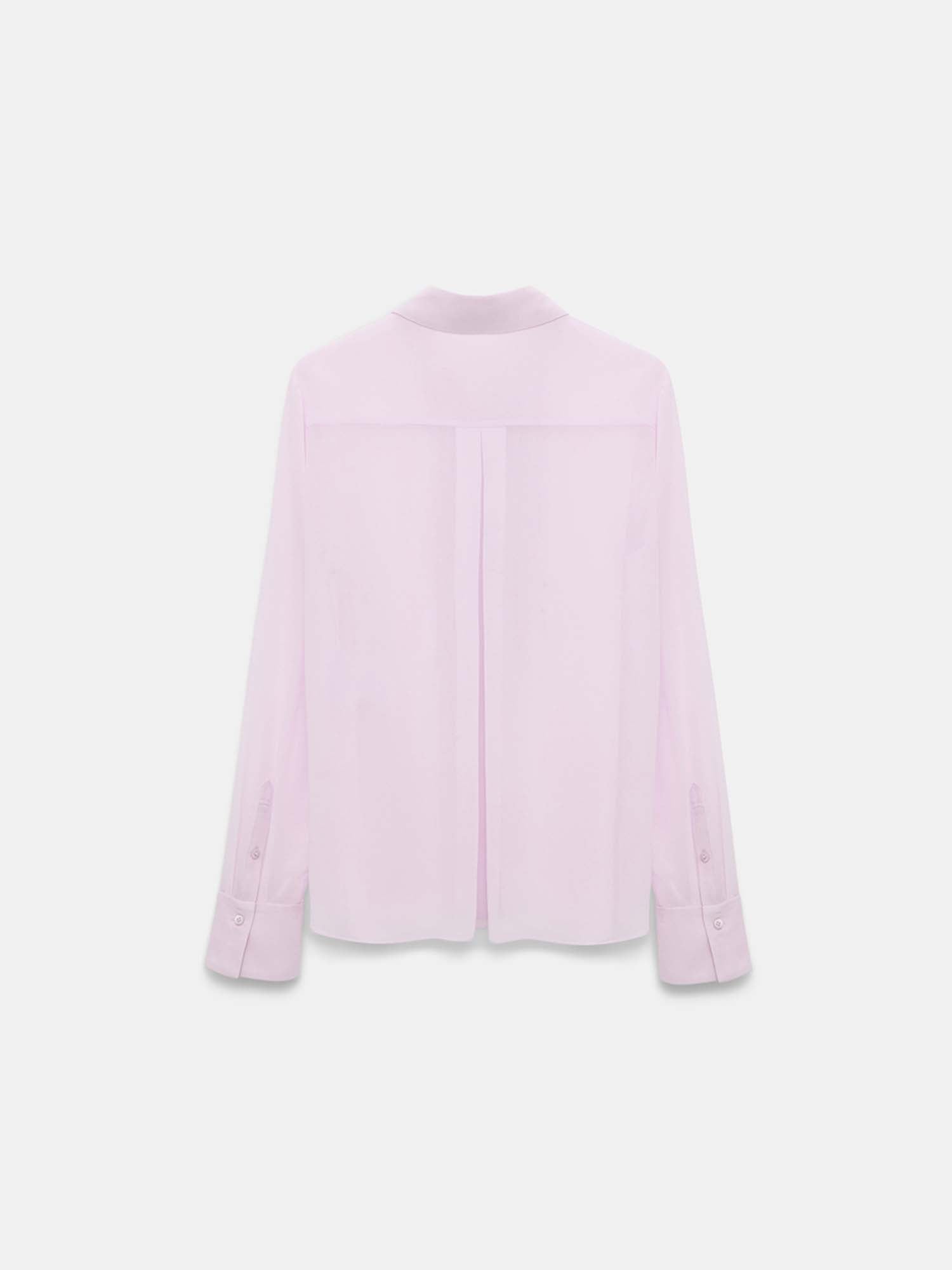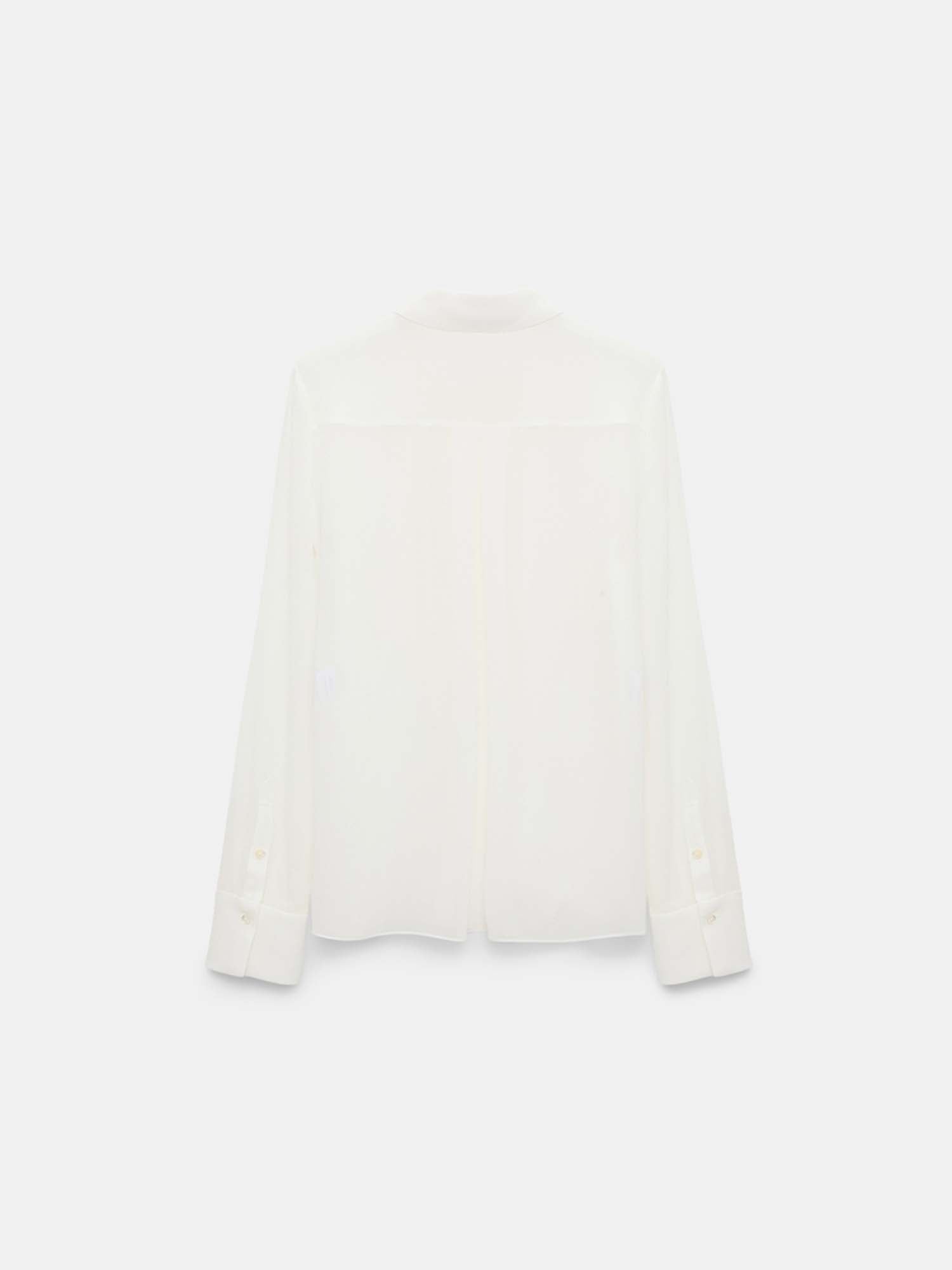The georgette blouse has a relaxed fit and twisted edge detailing on the asymmetrical plastron. The shirt has a back yoke with an inverted pleat.