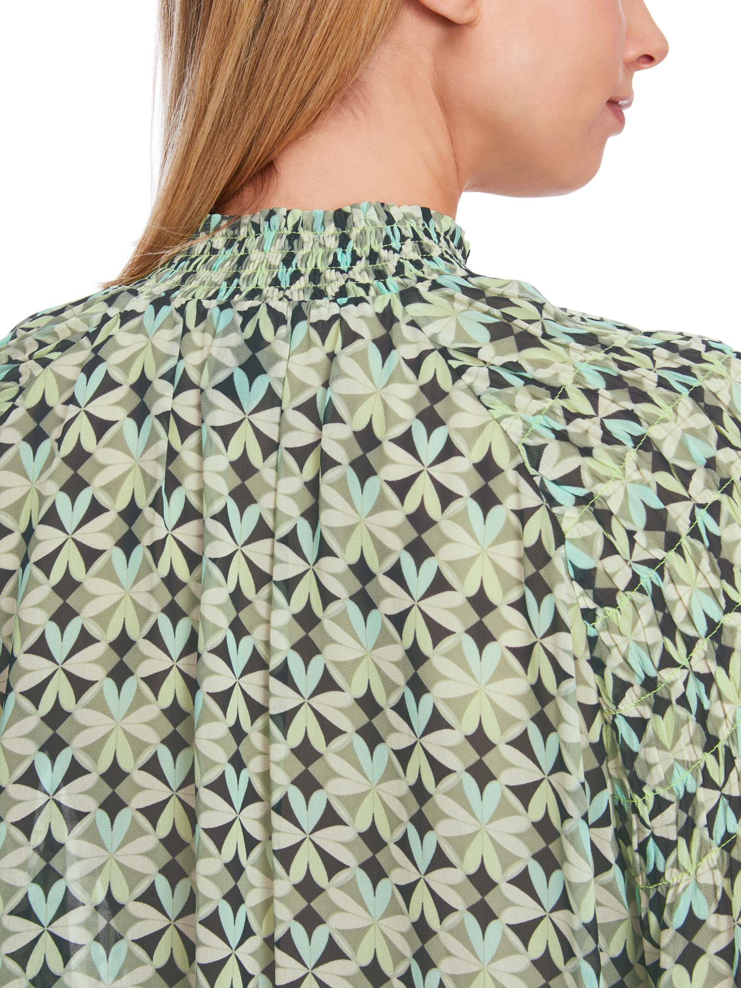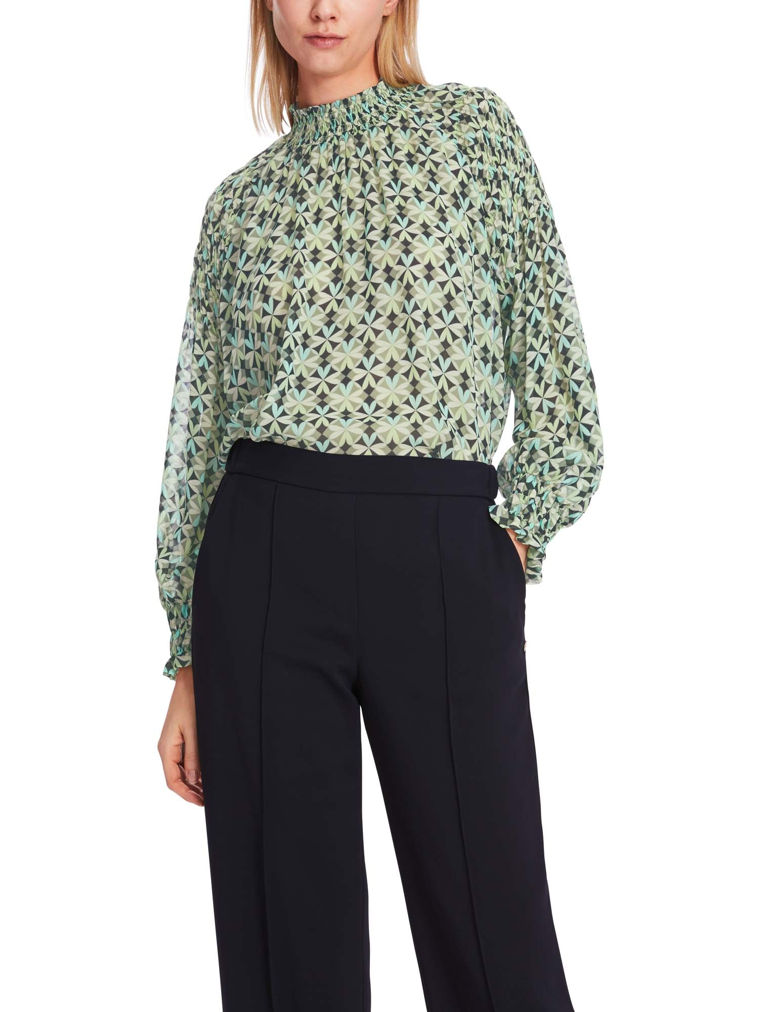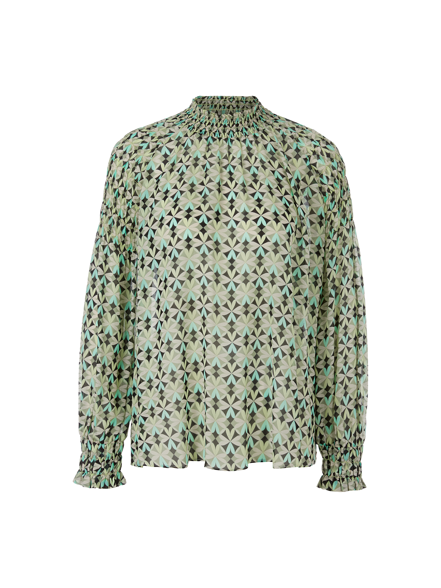 The smocked inserts on the stand-up collar, shoulders and cuffs give this blouse its special style. The look is complemented by a floral-inspired graphic pattern. The blouse has a wide cut. The soft, flowing viscose rounds off the feminine design.