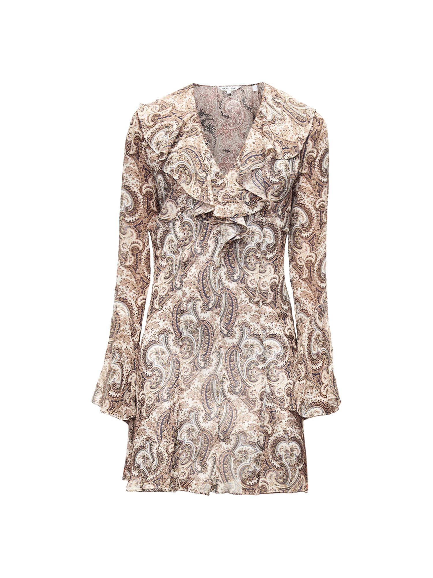 The quintessential boho dress. Crafted from 100% silk, the Adrienne is a light and airy mini printed with an all-over paisley pattern. Designed with a floaty A-line silhouette, it’s finished with a dramatic ruffled V-neck collar and bell sleeves. Style with flats or tall boots for everyday wear—or go full ‘70s with heeled clogs.