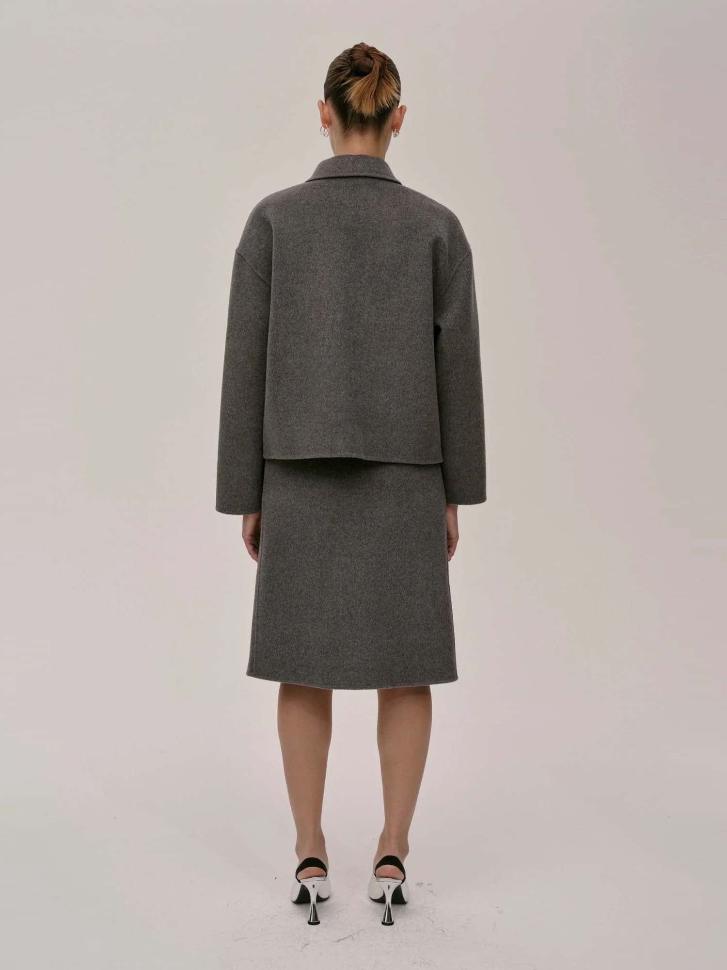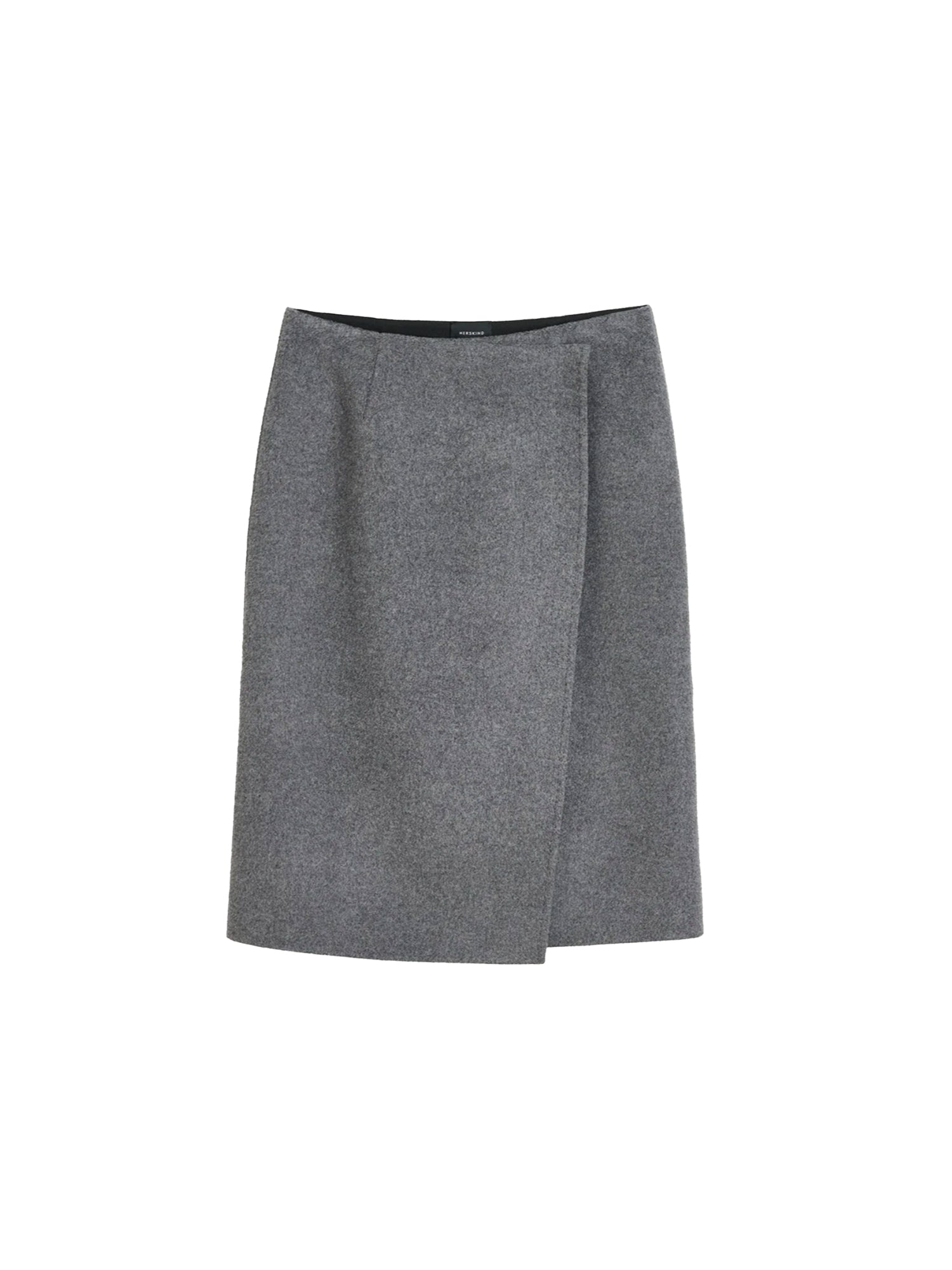 The Macha Skirt is a midi wrap skirt with a button closure in front.
