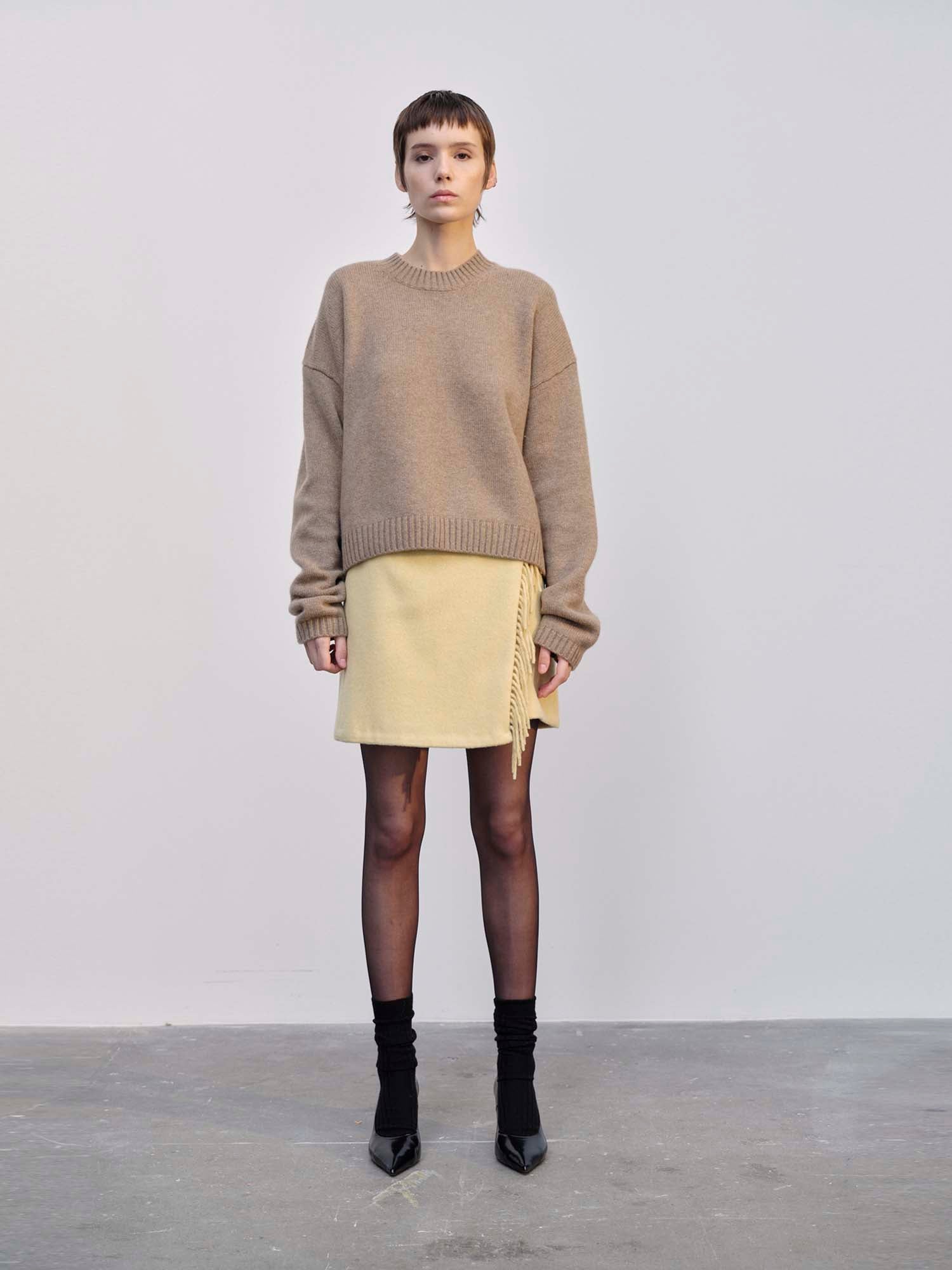 Introducing the Windy Skirt: A mini skirt with frills at the front, designed as a wrap skirt with a button closure at the front, featuring darts at the front and back, and fully lined for comfort and quality.