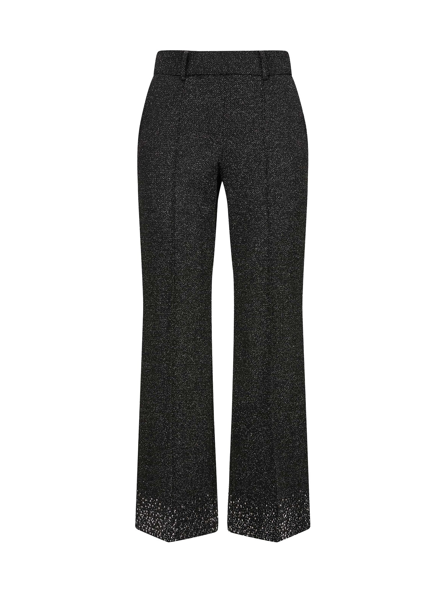 Punto Milano jersey pull on pant with sequin trimmed detail at flare hem. Flare leg. Mid rise.