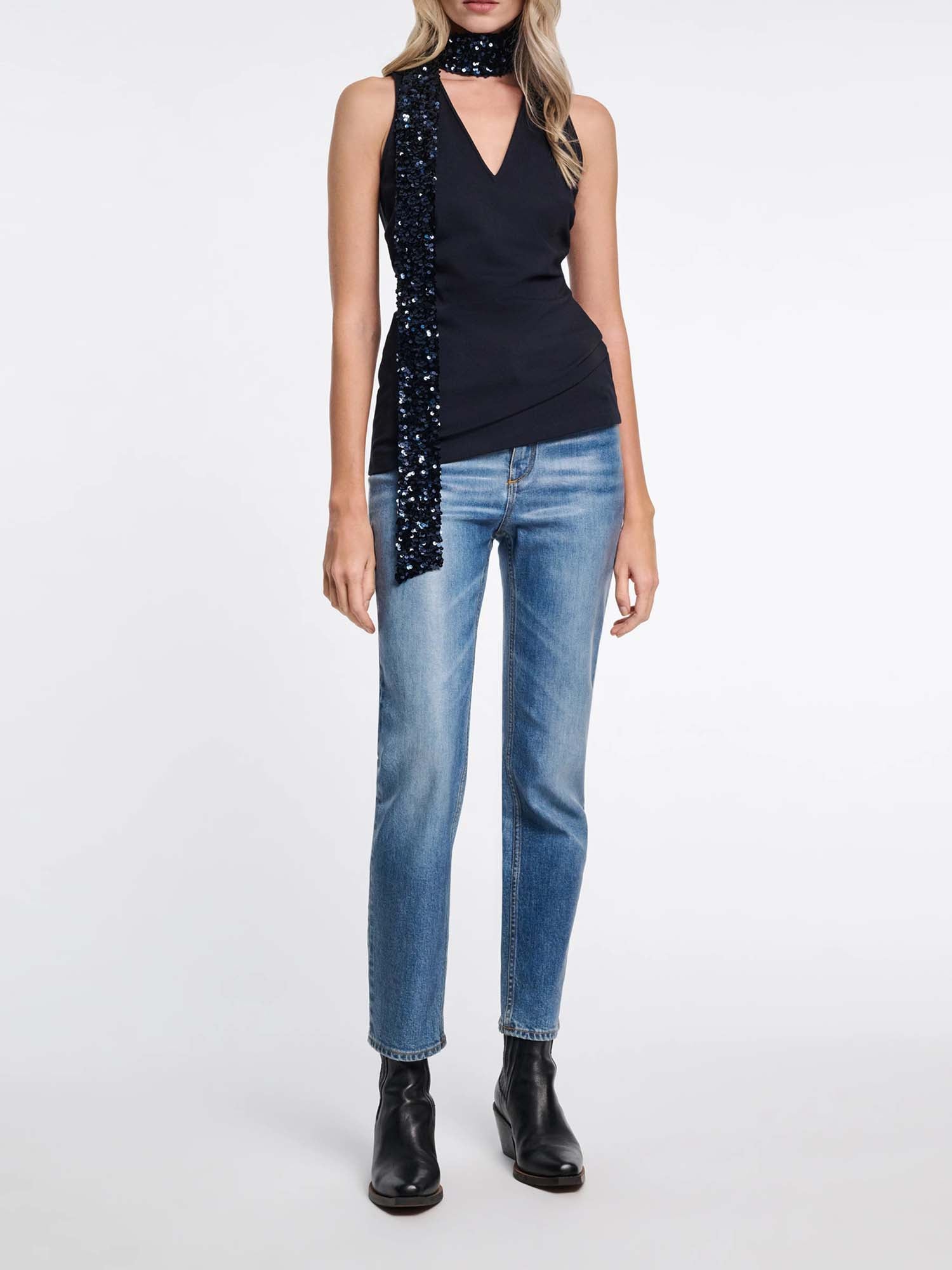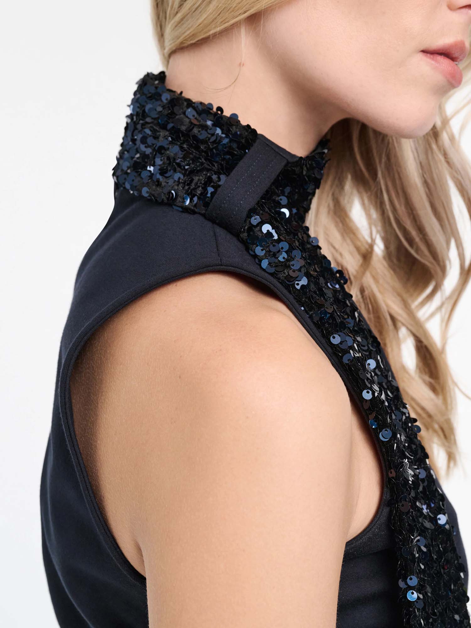 The shell is crafted in Punto Milano and has a V-neckline. The shell has a back zip closure with a high collar in the back and a matching sequin scarf.
