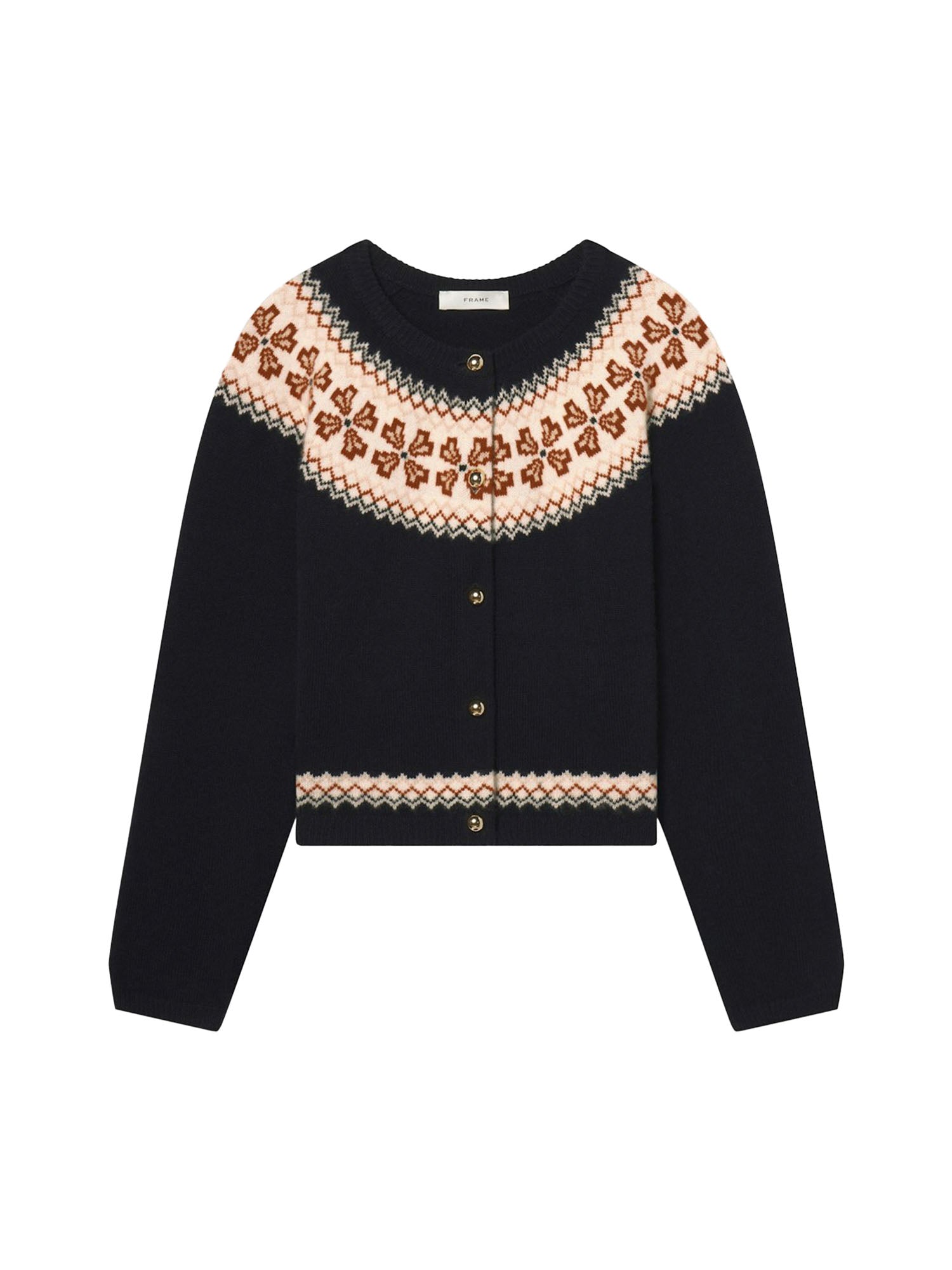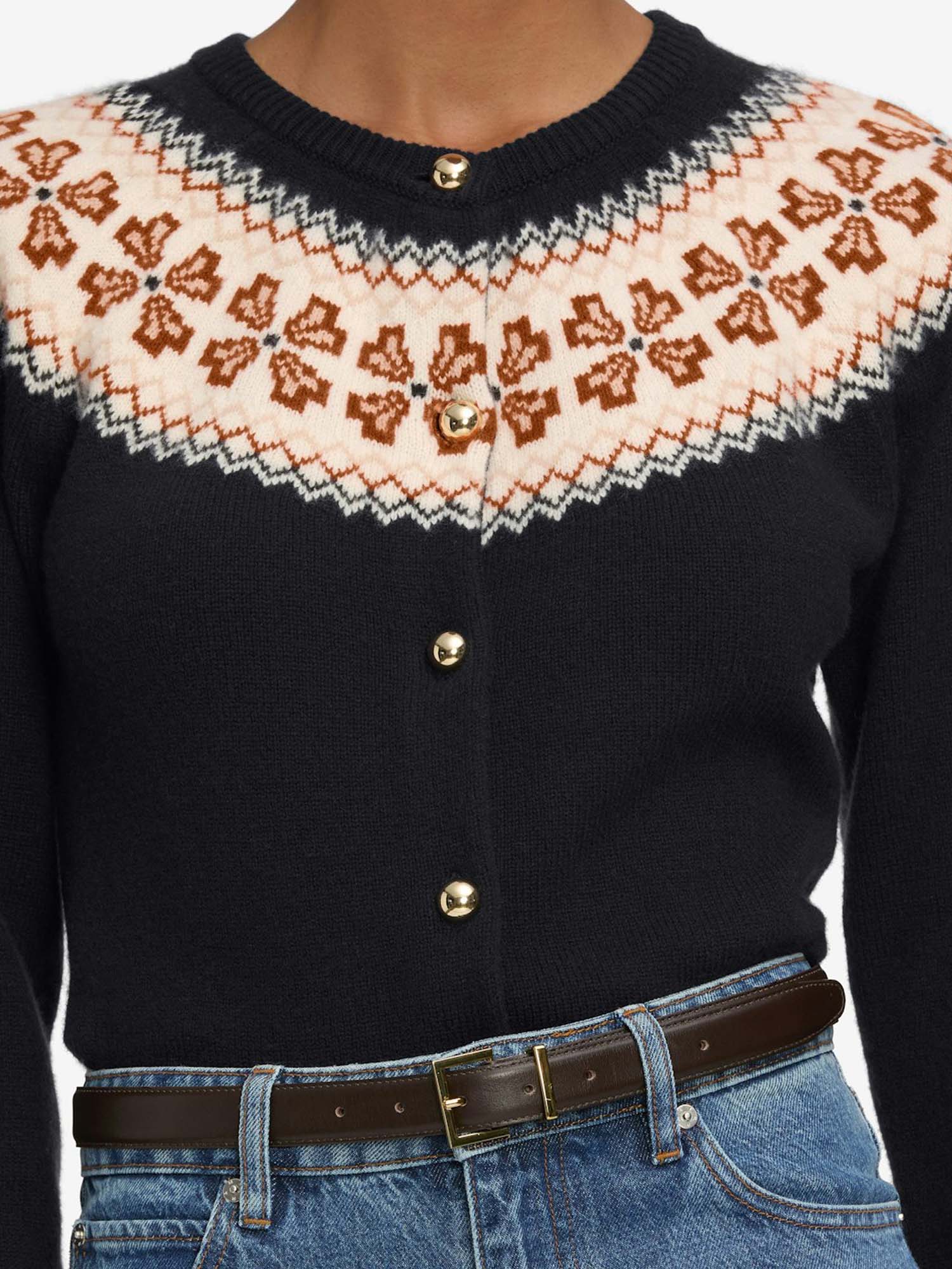 Crafted from pure cashmere, this cardigan pairs a nostalgic Fair Isle pattern with delicate gold buttons for a modern, feminine take on heritage knits.