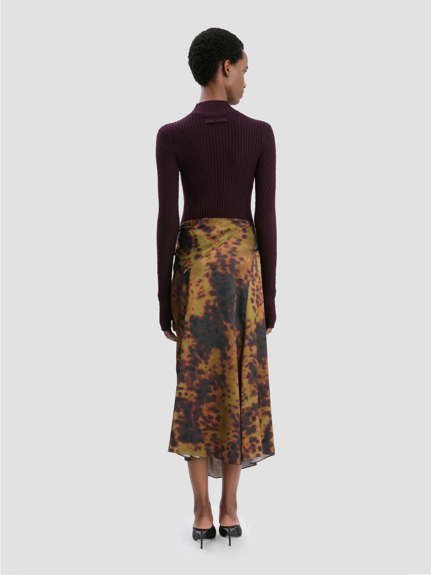 An Olive Brown-printed crepe back satin brings fresh energy to the house’s midi skirt edit. A fit-and-flare design with asymmetric hemline elongates the silhouette, while a pleated detail and contrasting fabric rouleau trim at the side of the skirt add tactile talking points. Exposed baby-overlocking at the back of the skirt adds a discreet finishing touch.