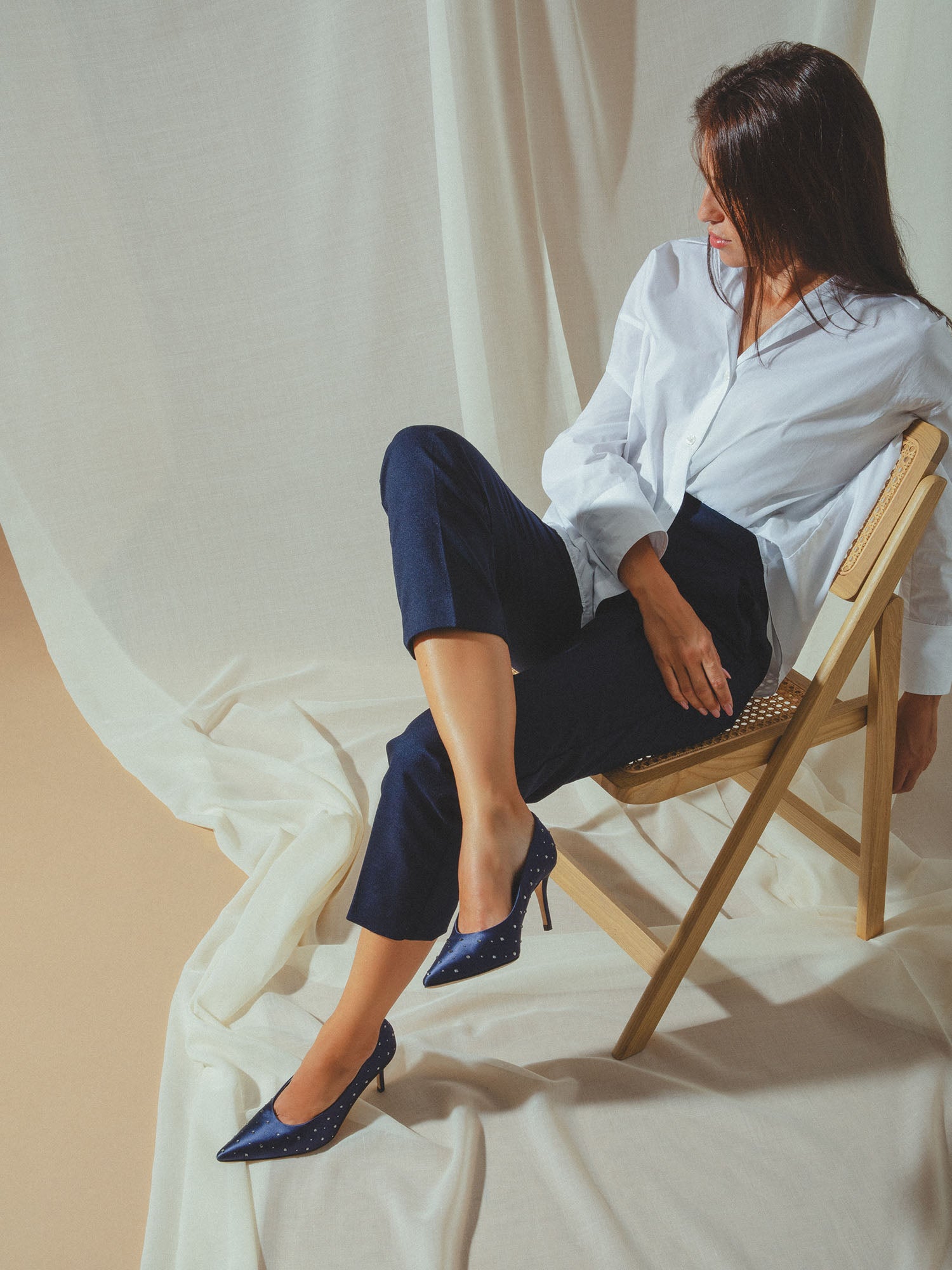 The Sanremo 75 Pump in Navy is a celebration of evening elegance. Made from smooth satin and adorned with radiant crystals, this style sits on a comfortable 75mm heel for a polished, elongating effect.