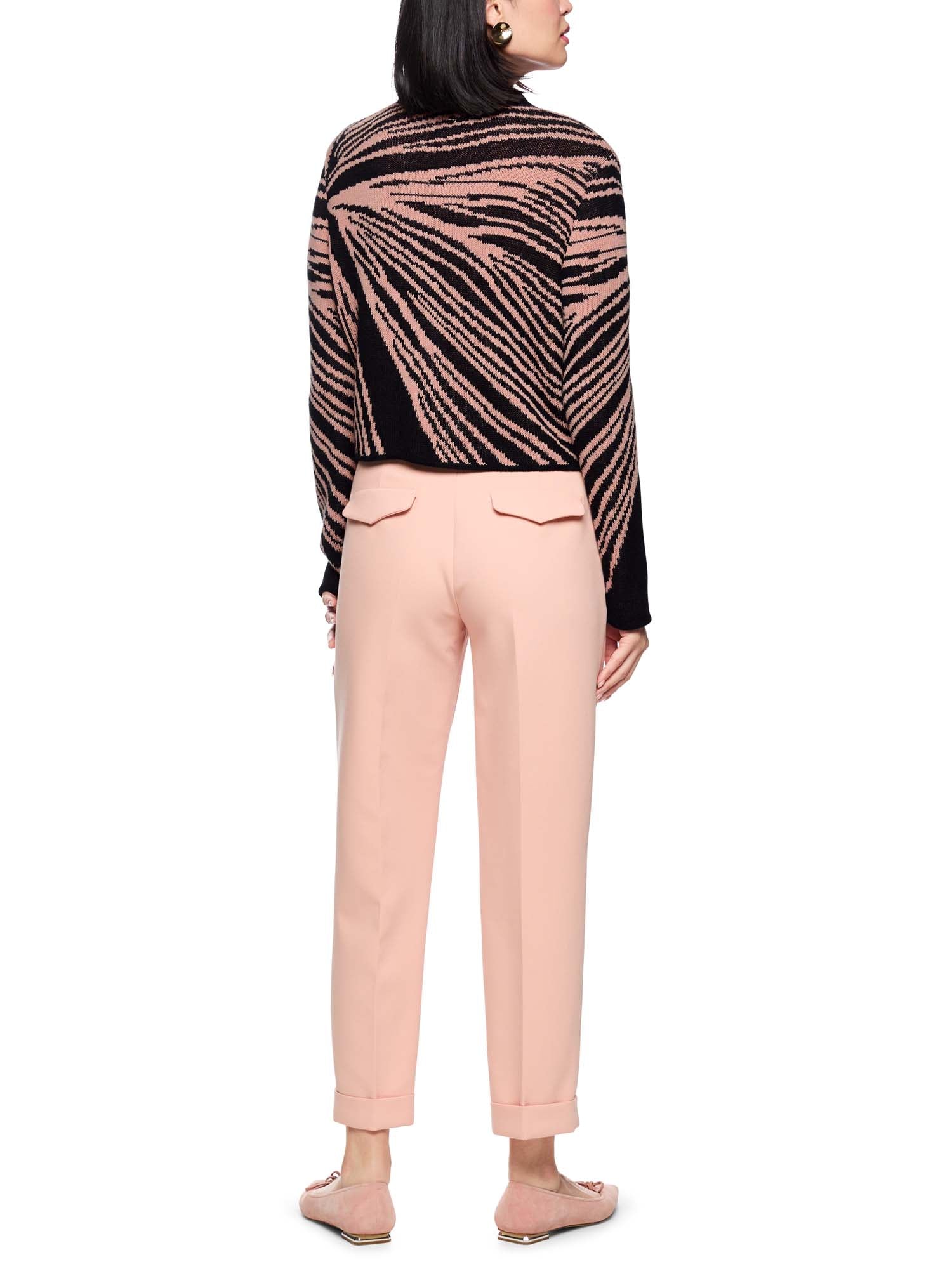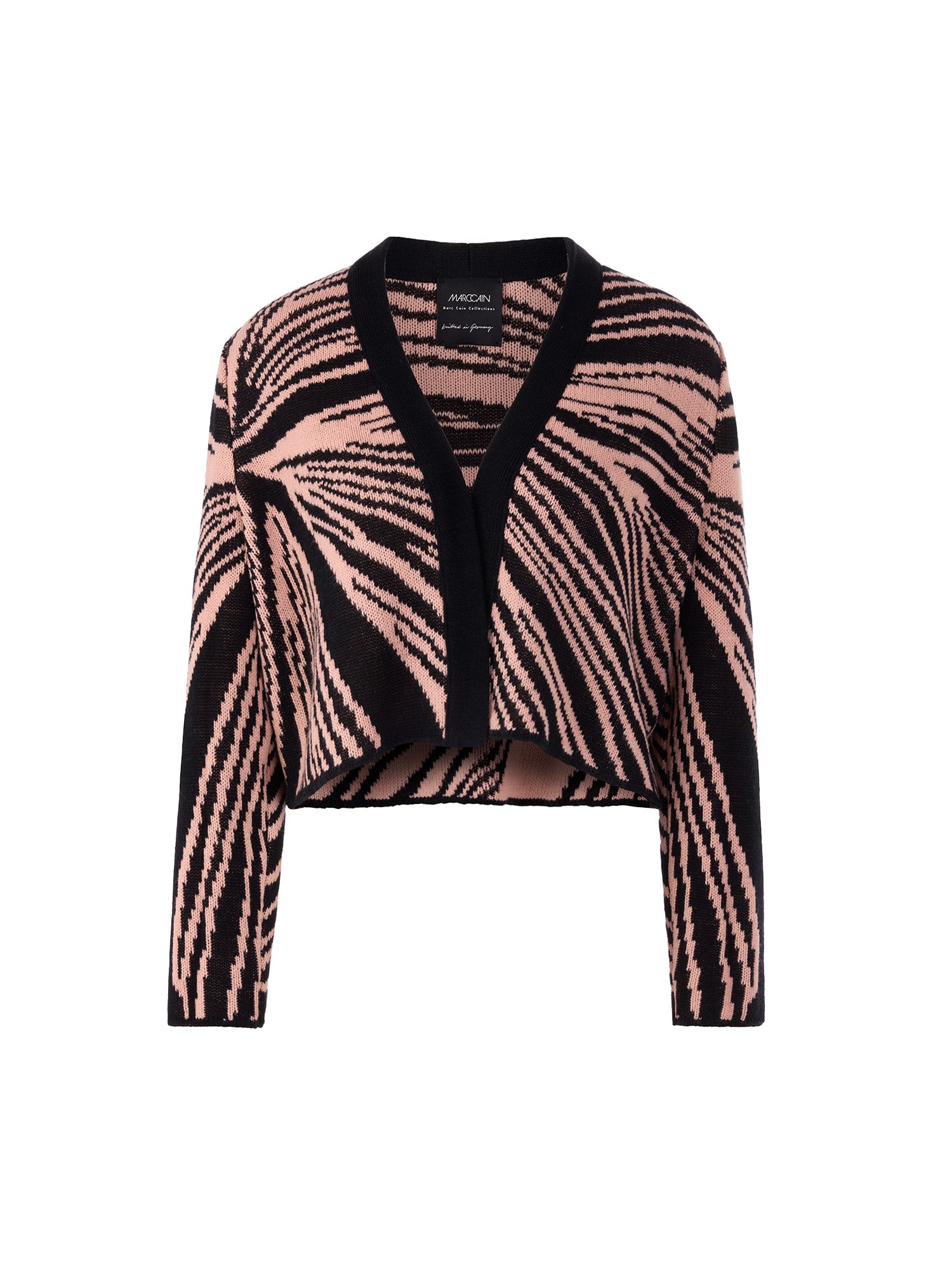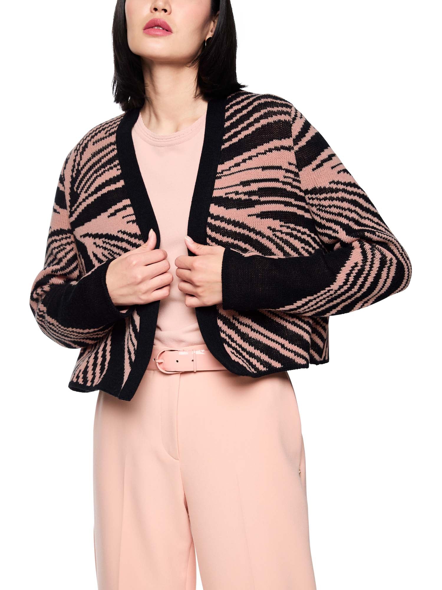 ‘Knitted in Germany’ jacquard cardigan. Elegant, short open-front knitted cardigan – made from high-quality jacquard knit with warming new wool content. The sophisticated mix of textures gives this garment a modern yet feminine look. Perfect for stylish layered looks on cooler days. This cardigan is ‘Knitted in Germany’: the yarns are knitted on state-of-the-art knitting machines and the materials are finished in Germany.