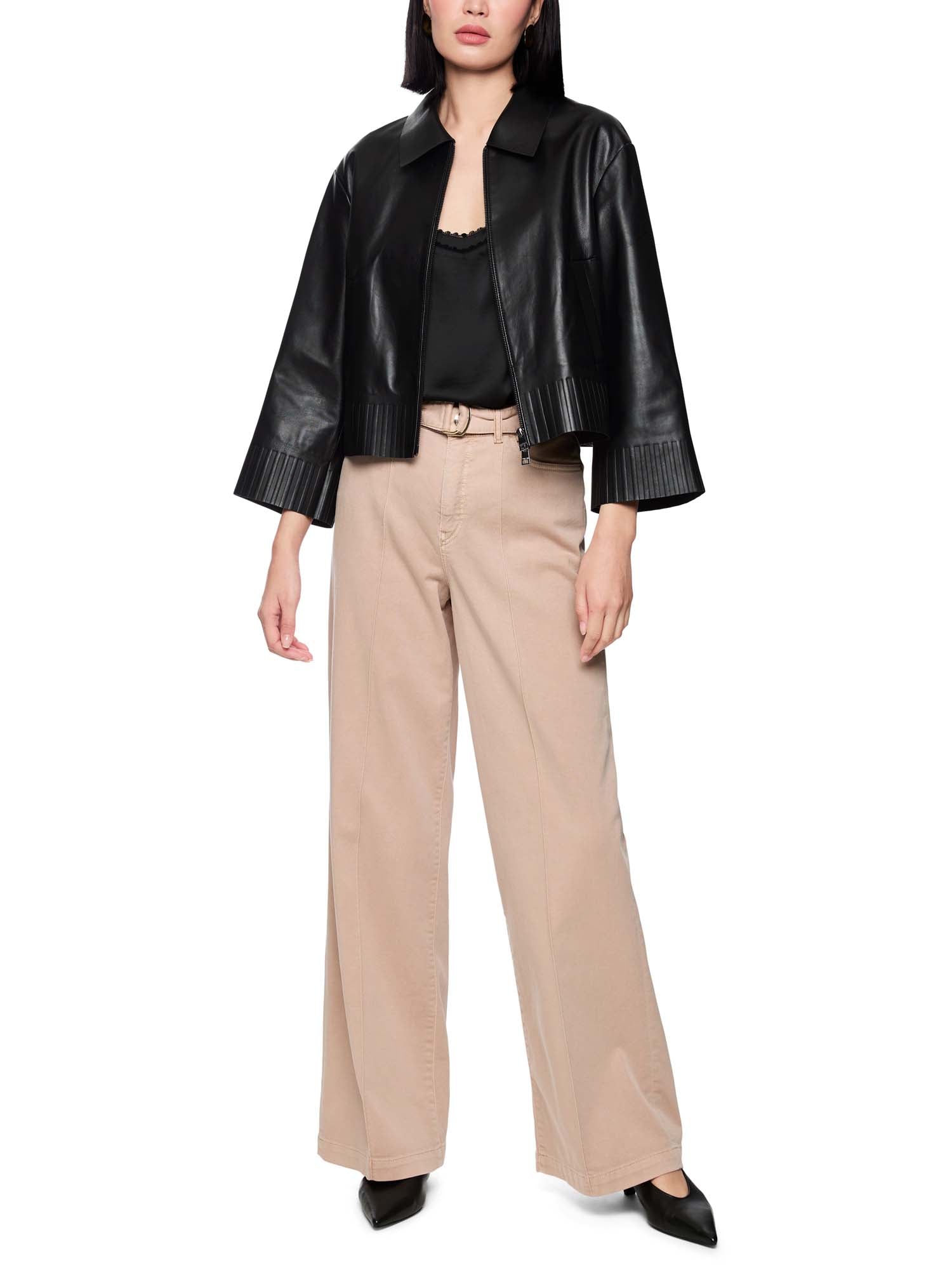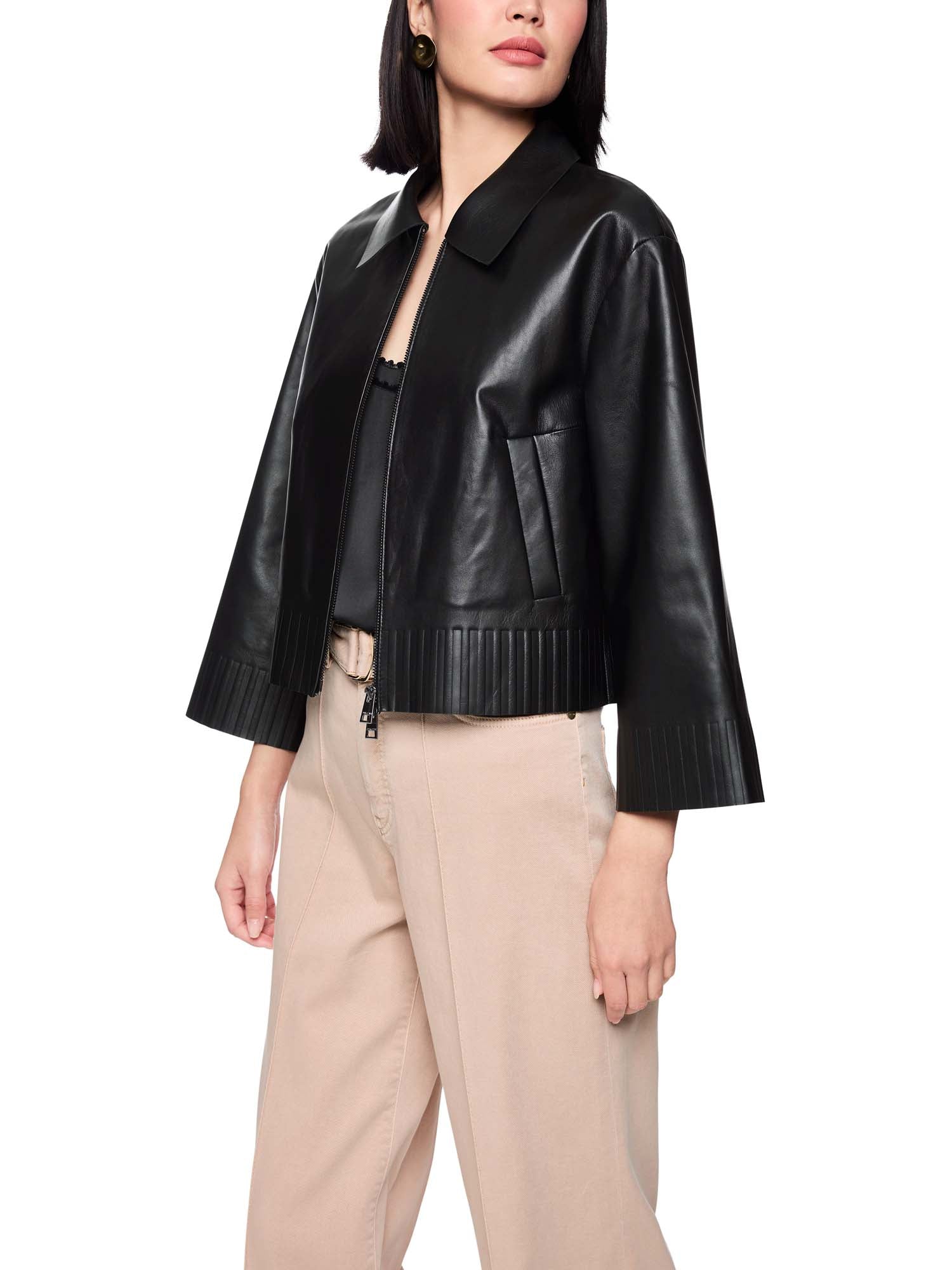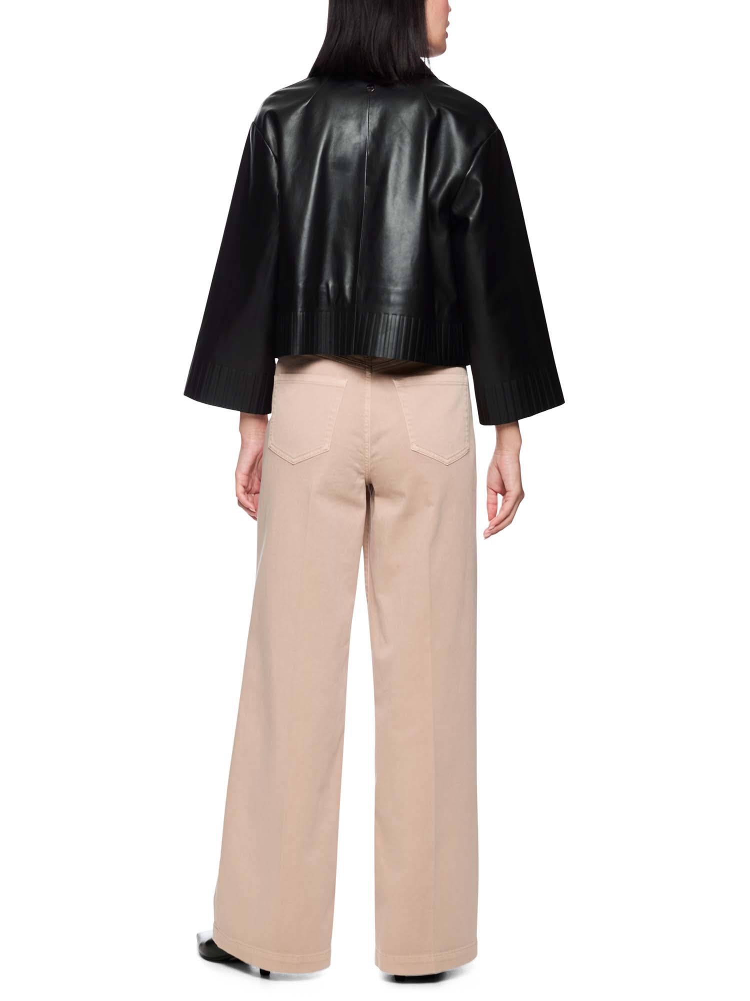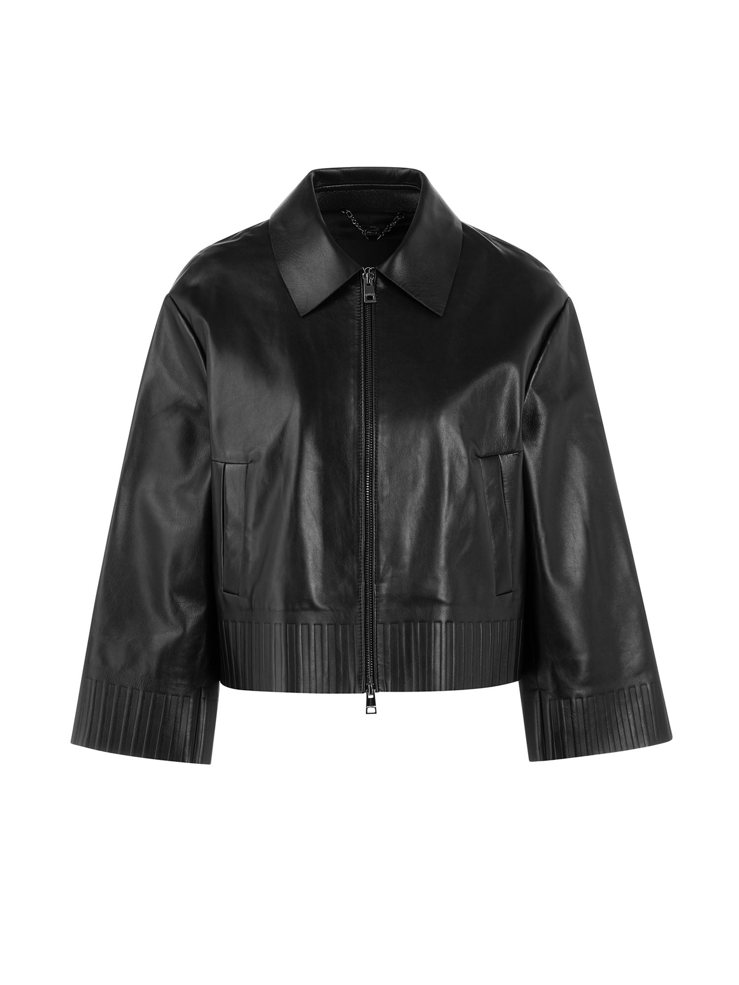 ‘Rethink Together’ lamb nappa jacket. Elegant jacket made from soft lamb nappa leather with a modern two-way zip. The wide sleeves allow for freedom of movement, while the sleeves and jacket hem feature a fine ribbed texture, creating a stylish contrast. The high-quality leather and precise workmanship give this jacket an elegant, minimalist look. This jacket is from the ‘Rethink Together’ sustainability label.