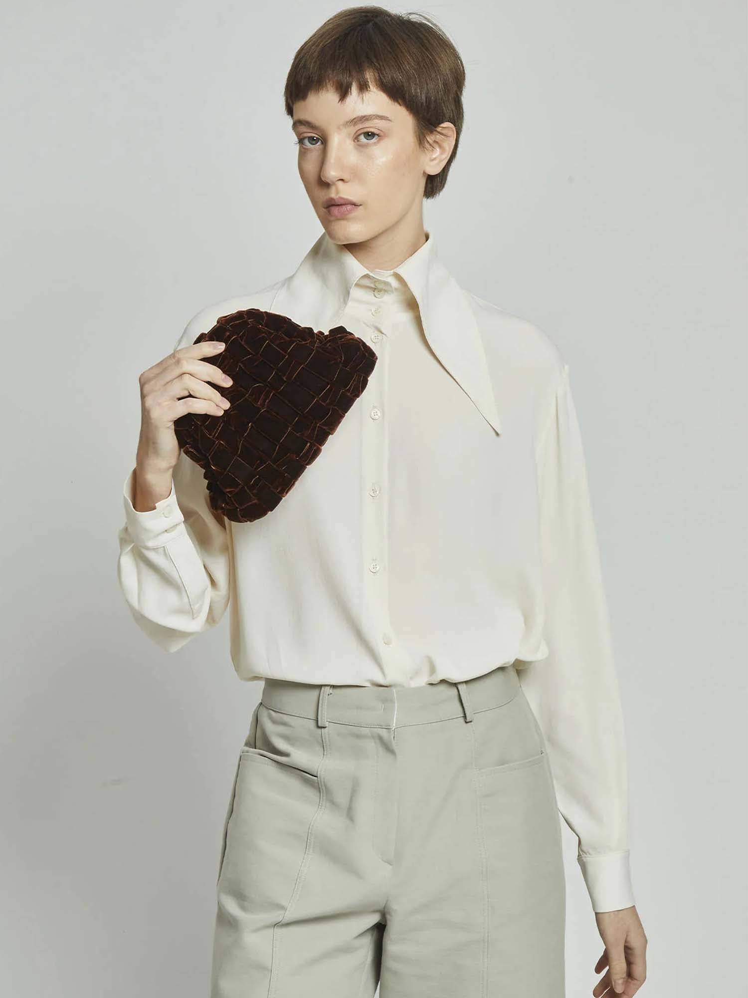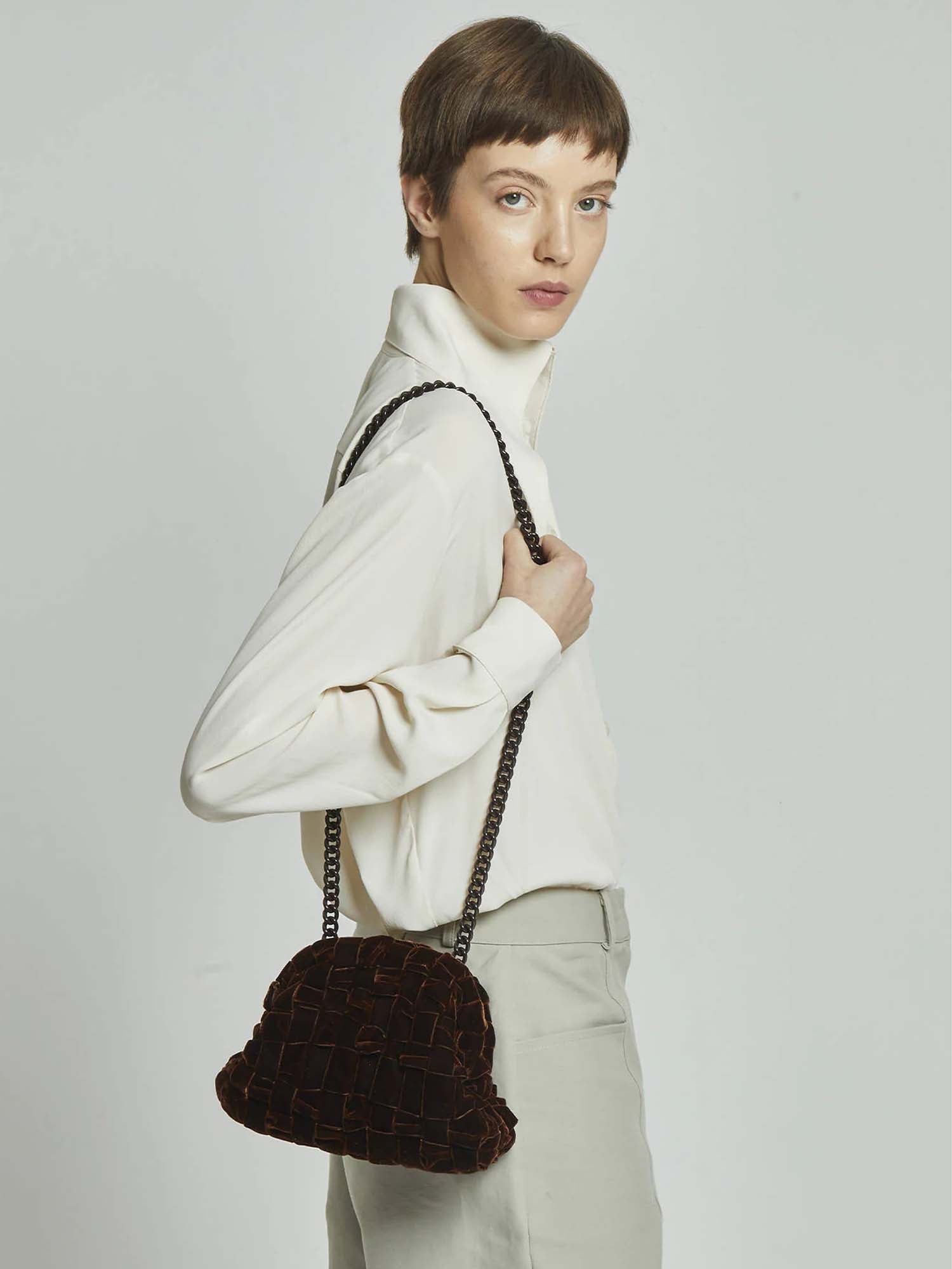 Small women's clutch in woven velvet ribbon fabric, handmade on ancient looms. This model is the Maria La Rosa icon bag, perfect for the winter season, emblem of a new metropolitan elegance, which ensures capacity and functionality. It is equipped with a tone-on-tone chain to wear it also as a shoulder bag.