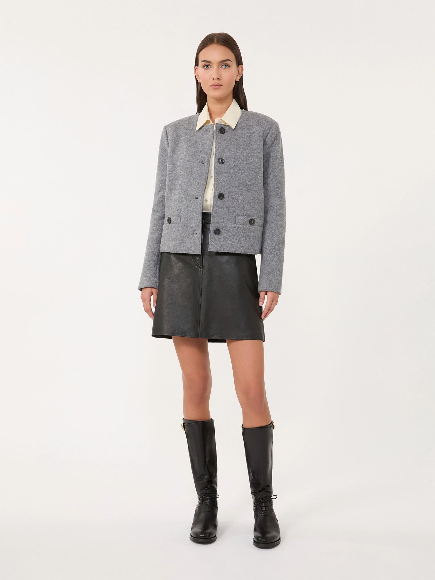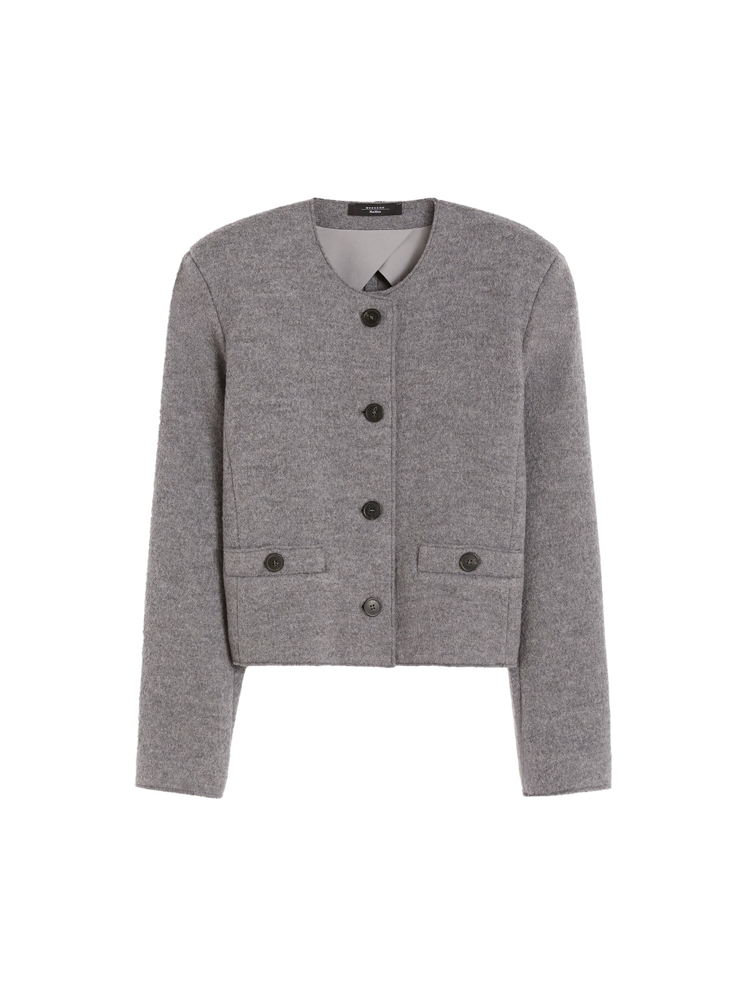 Crew-neck jacket in boiled wool jersey fabric featuring long sleeves and flap welt pockets. The garment boasts raw-cut trims and a button fastening.